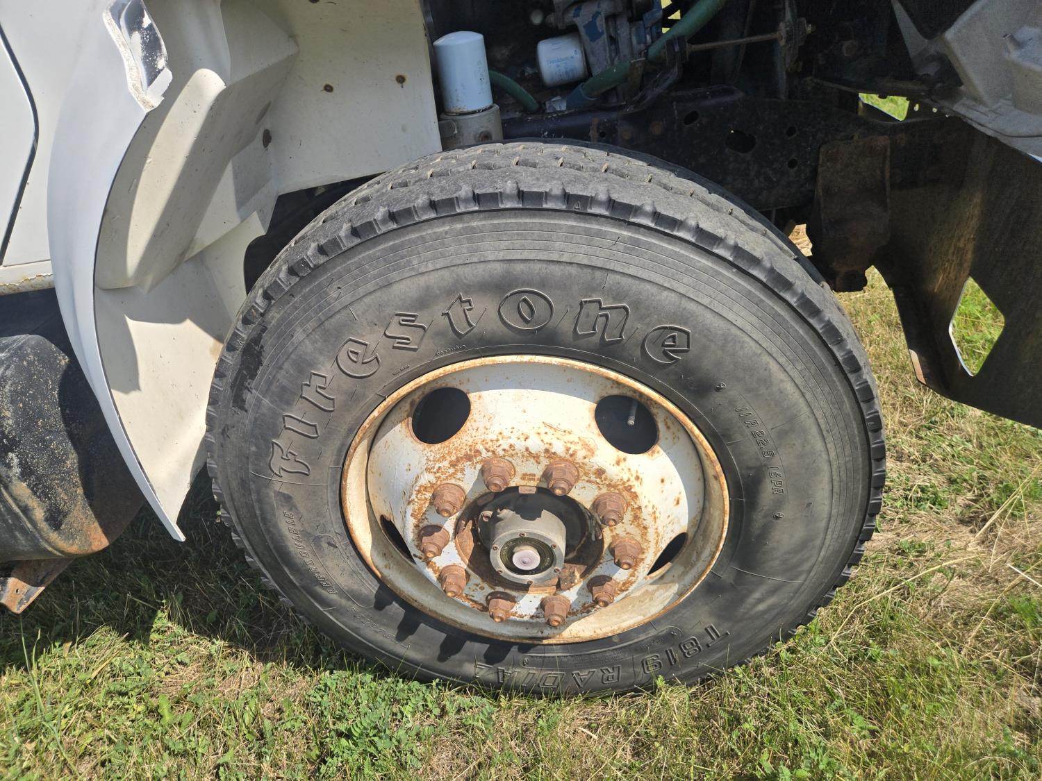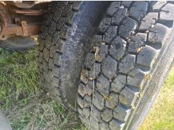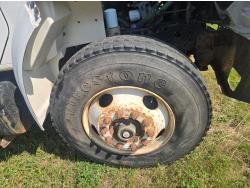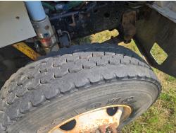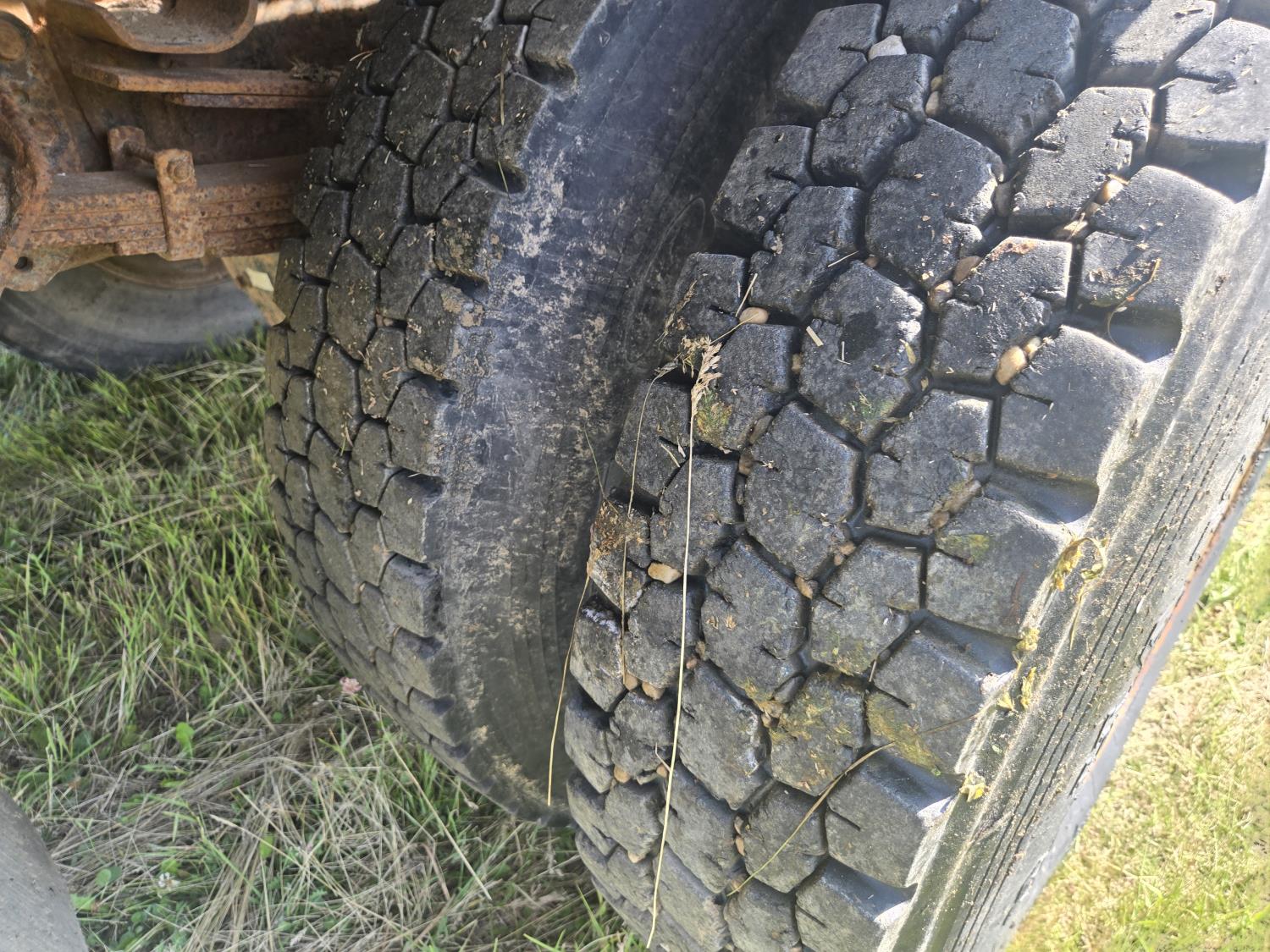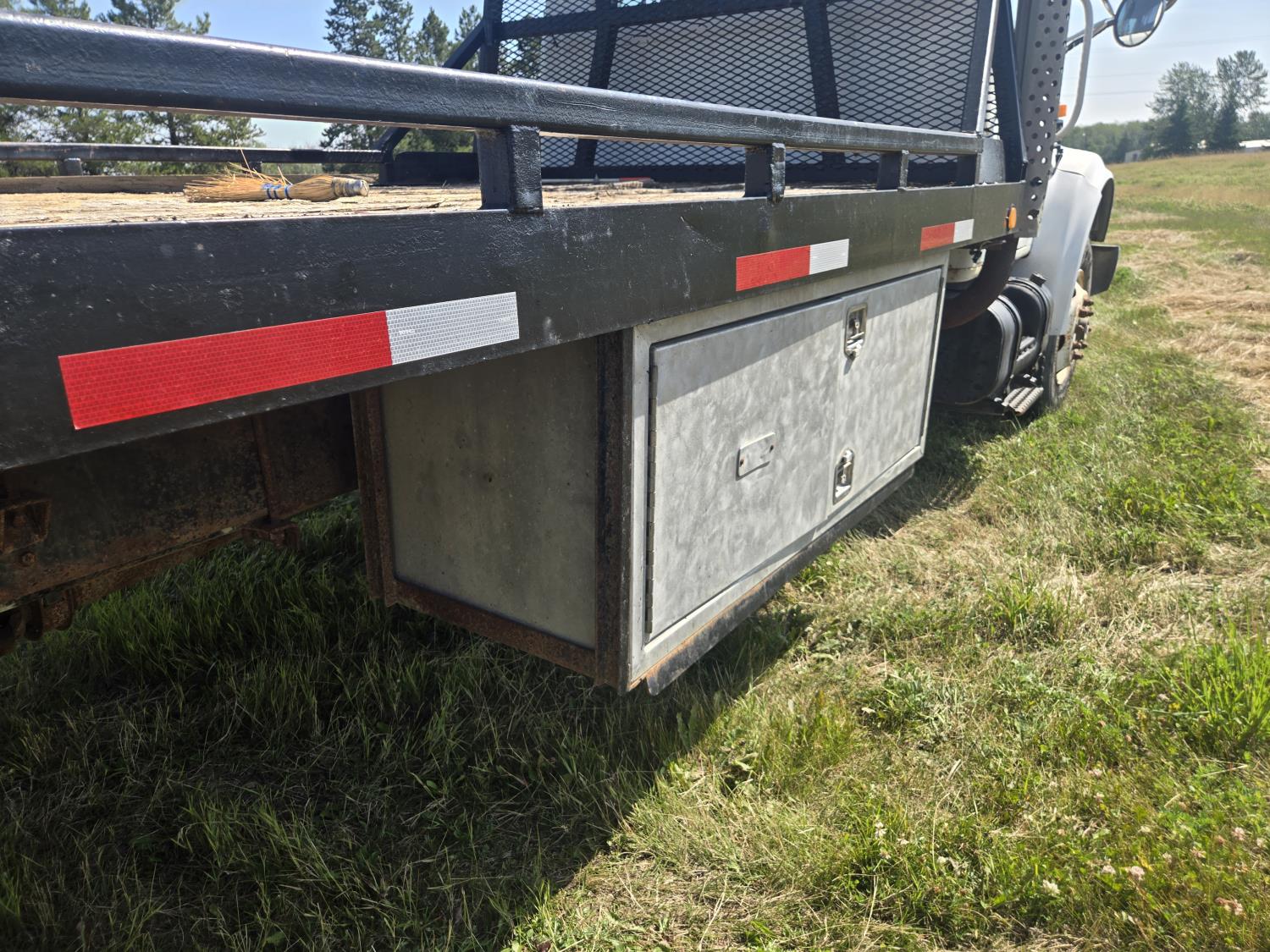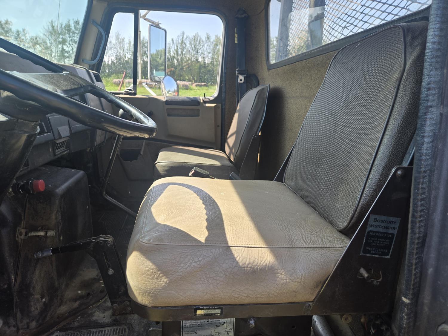 International DT466 6 cylinder diesel engine, manual transmission, 18 ft wood deck with 4 ft beaver tails, 60" flip over ramps, (1) under deck tool storage box, hydraulic brakes, spring suspension, 11R22.5 tires