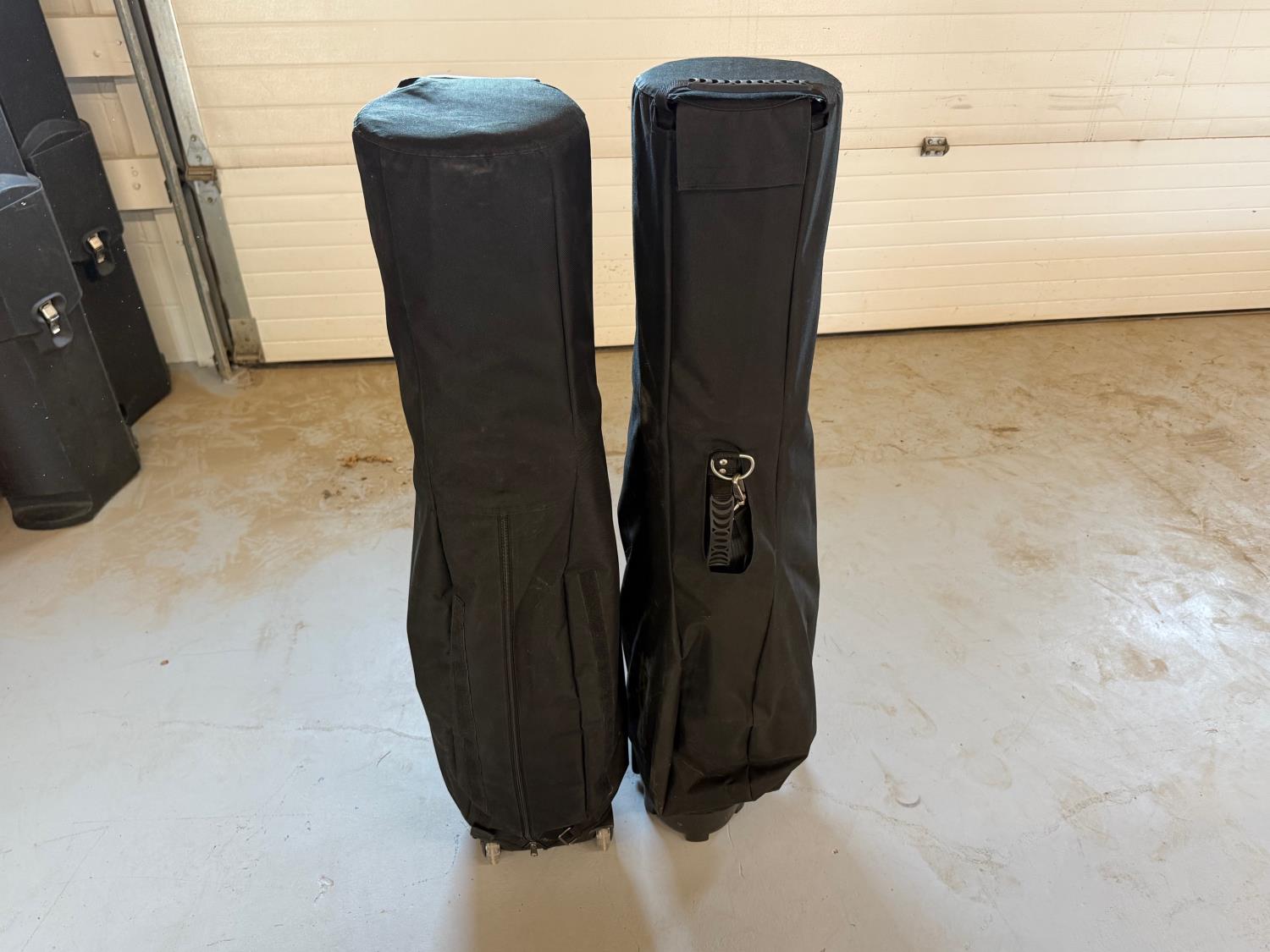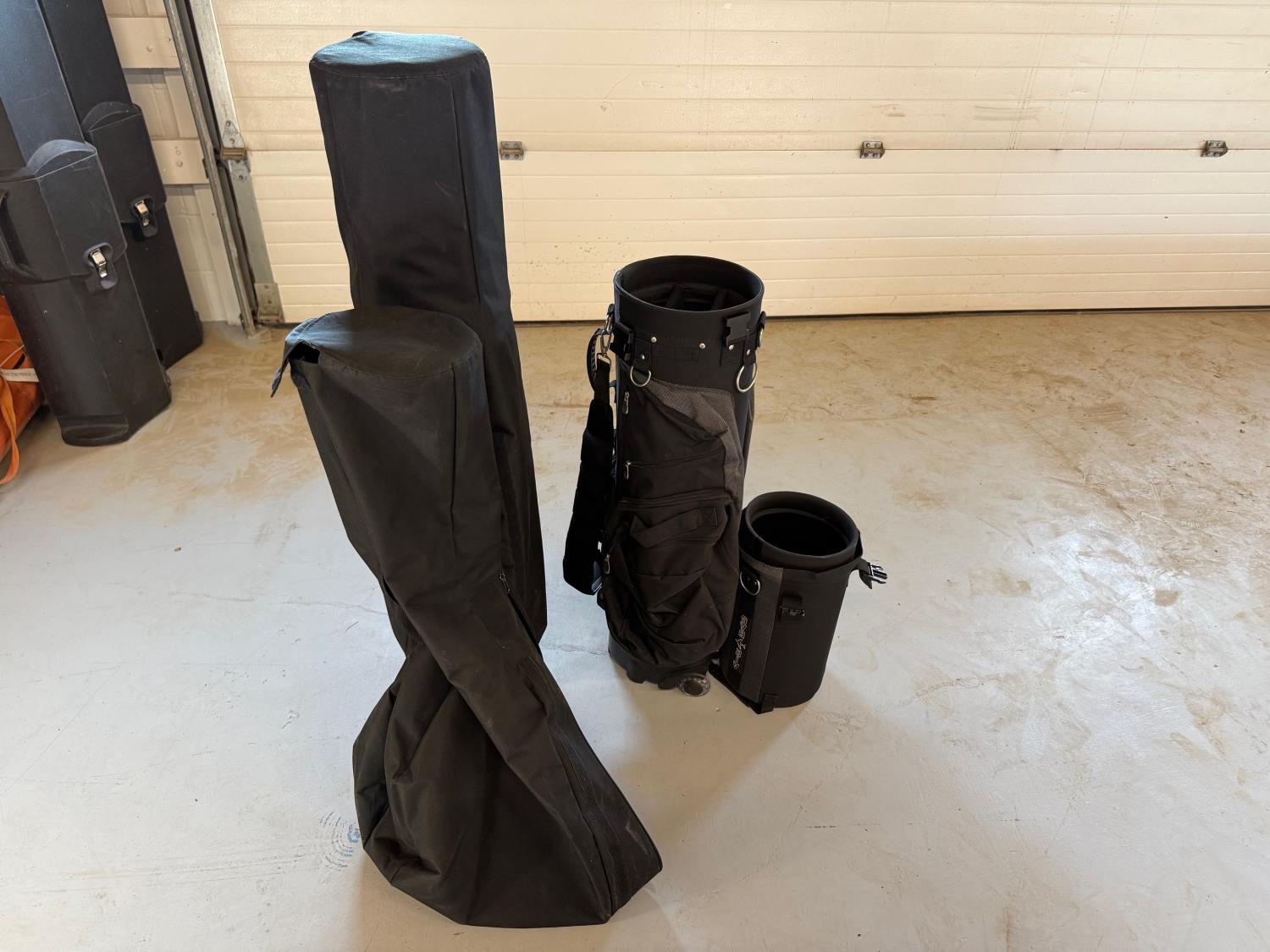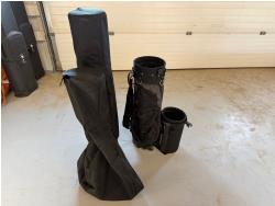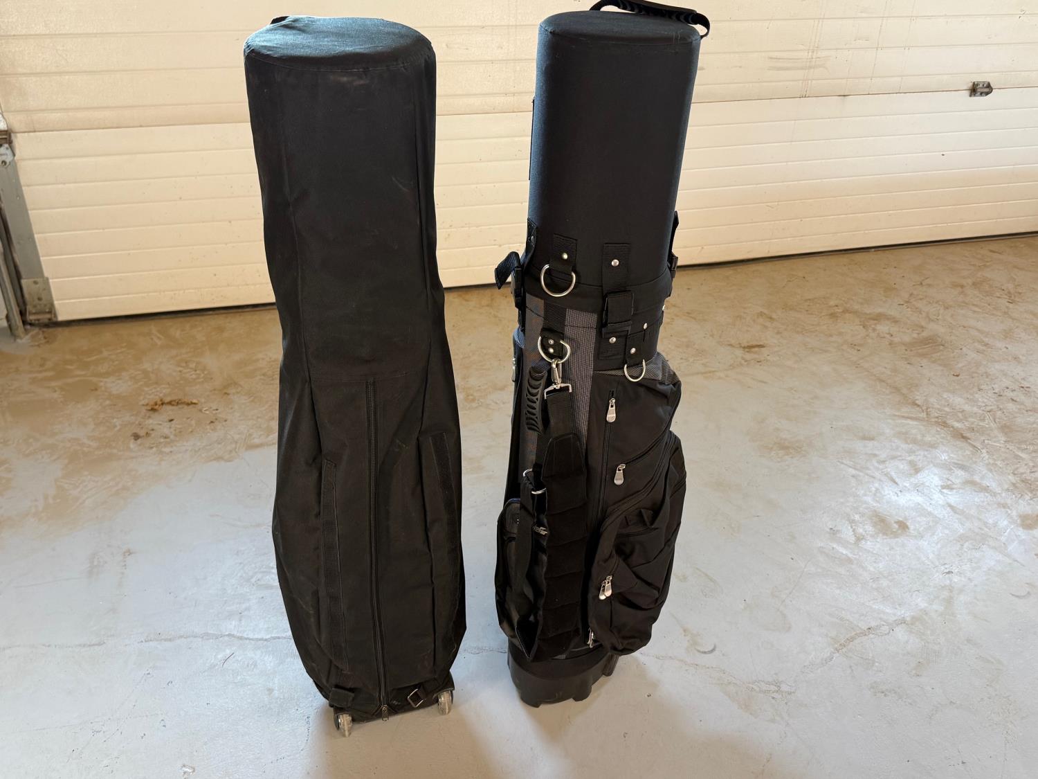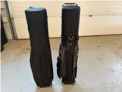 Pair of soft shell wheeled golf club travel bags. Approximately 49 inch tall