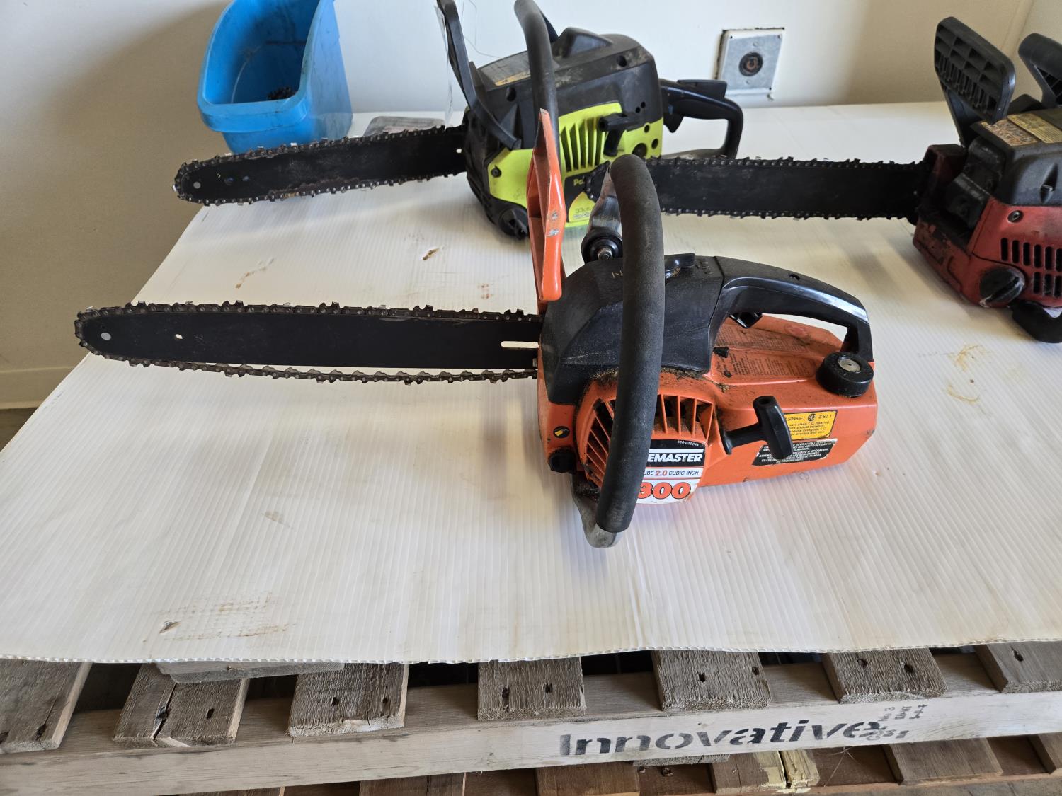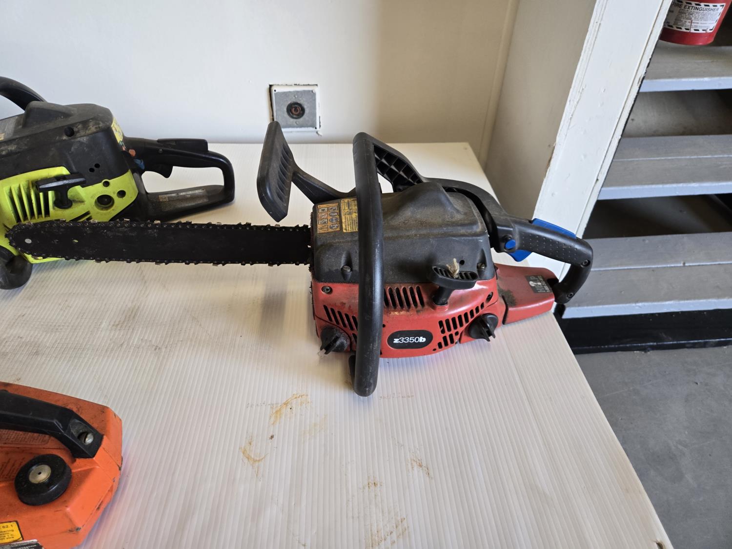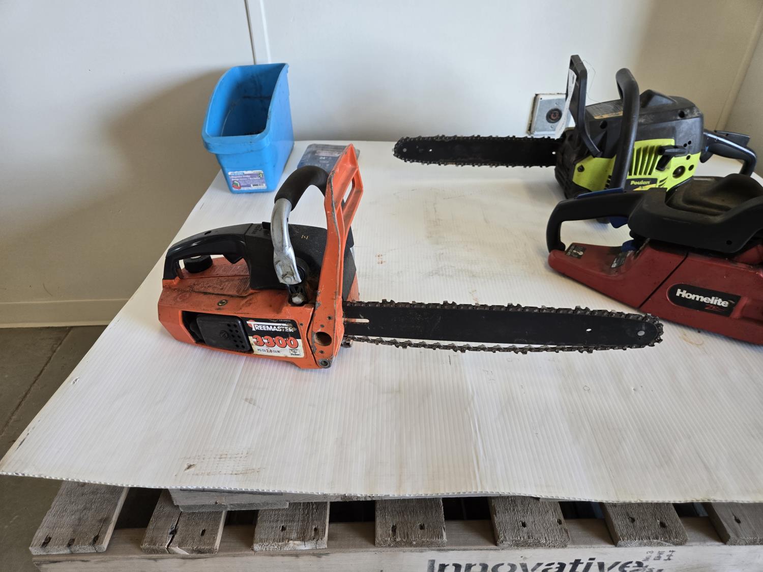 (1) Poulan P3314, (1) Homelite Z33550B, (1) Reemaster 3300 all have 14 inch bars, (2) small clevises and miscellaneous chain saw chain