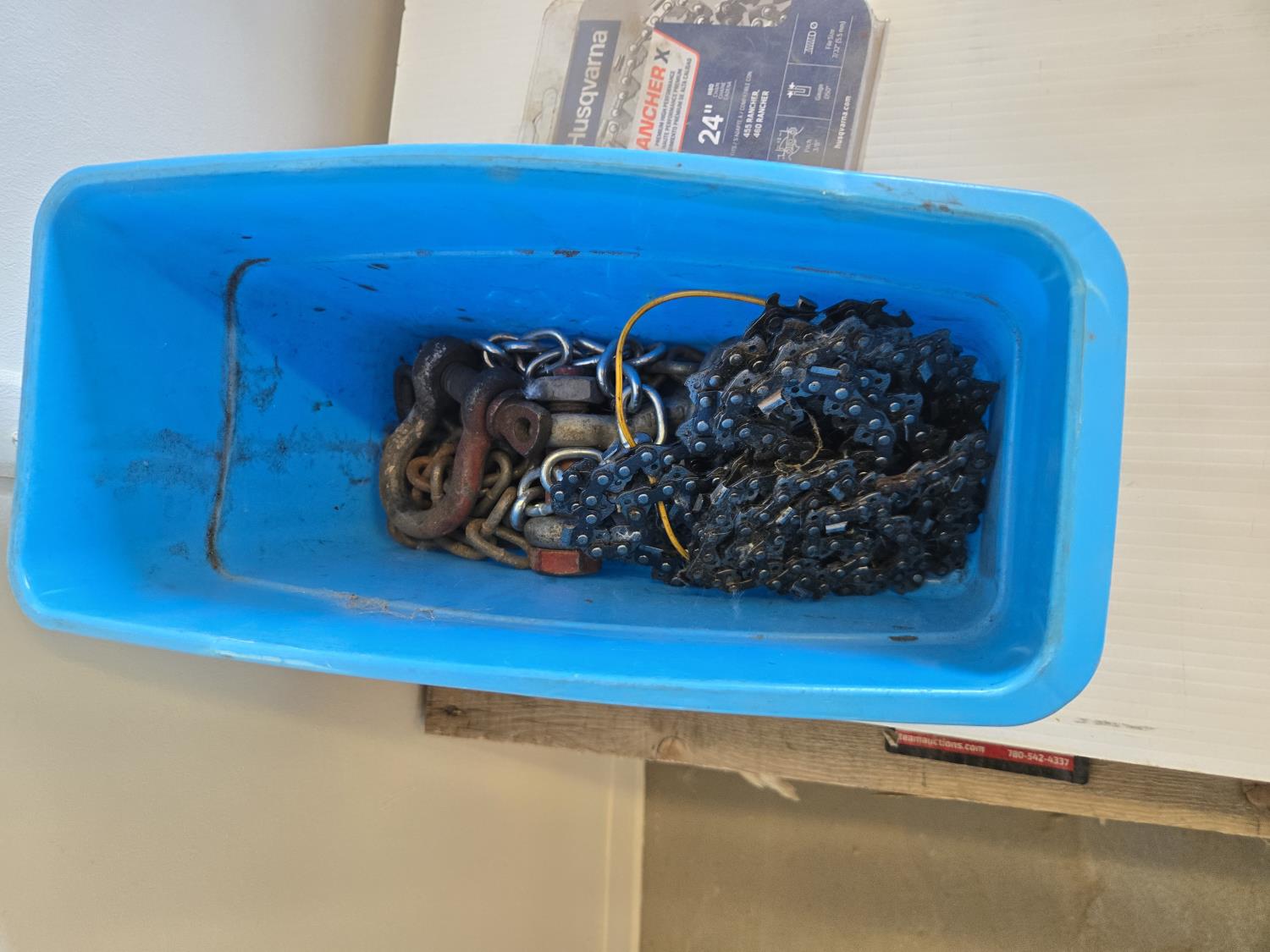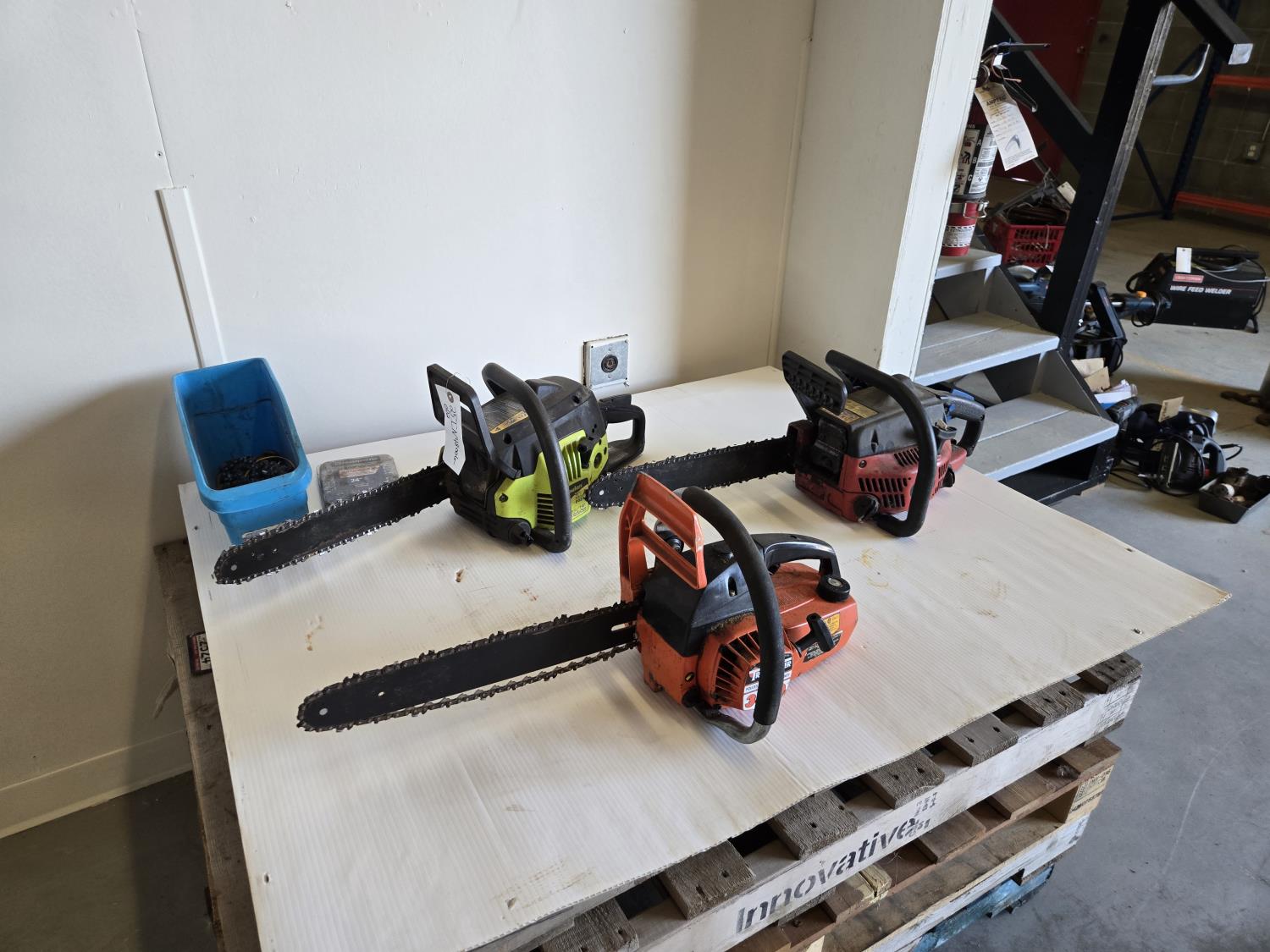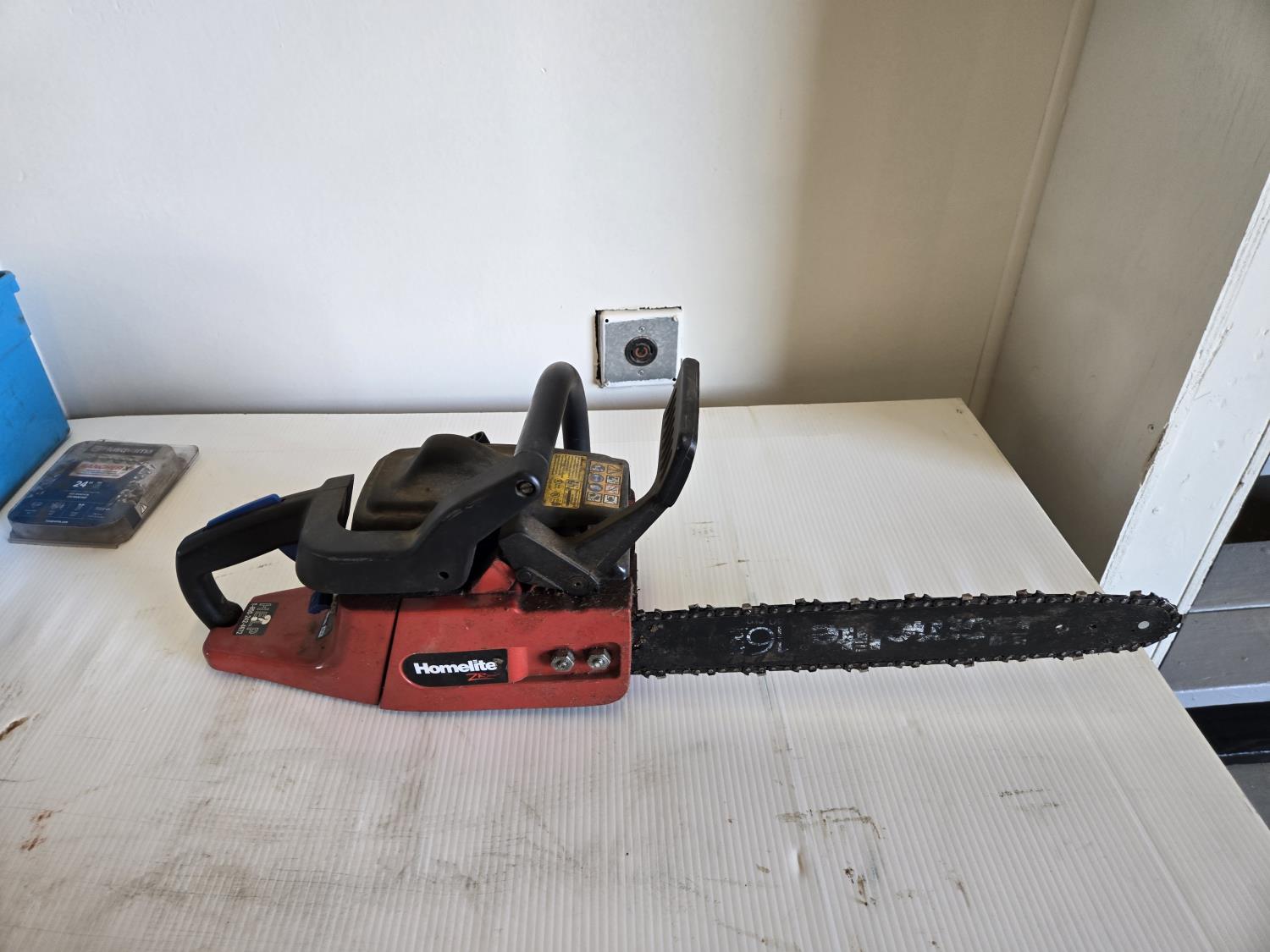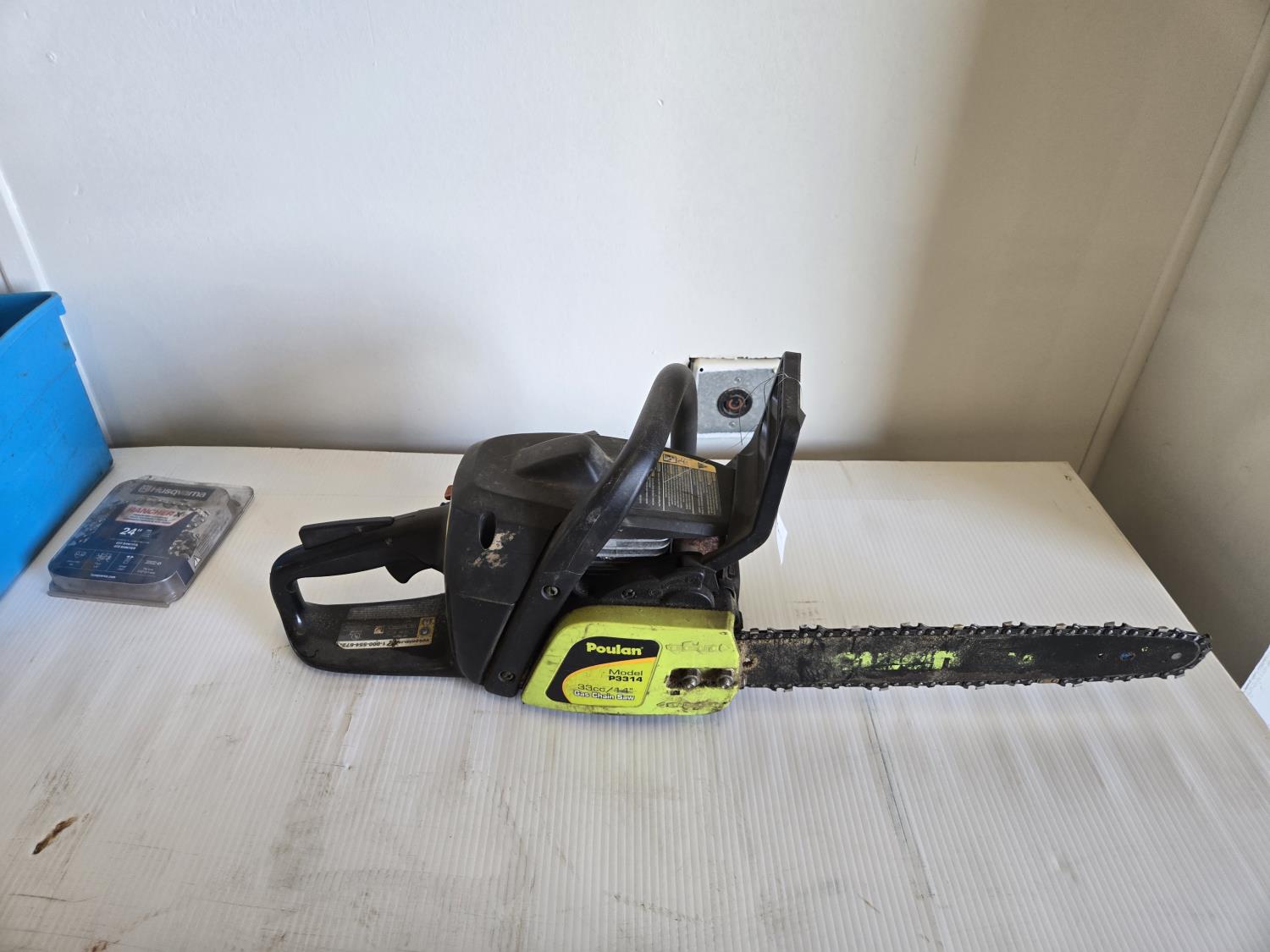 (1) Poulan P3314, (1) Homelite Z33550B, (1) Reemaster 3300 all have 14 inch bars, (2) small clevises and miscellaneous chain saw chain