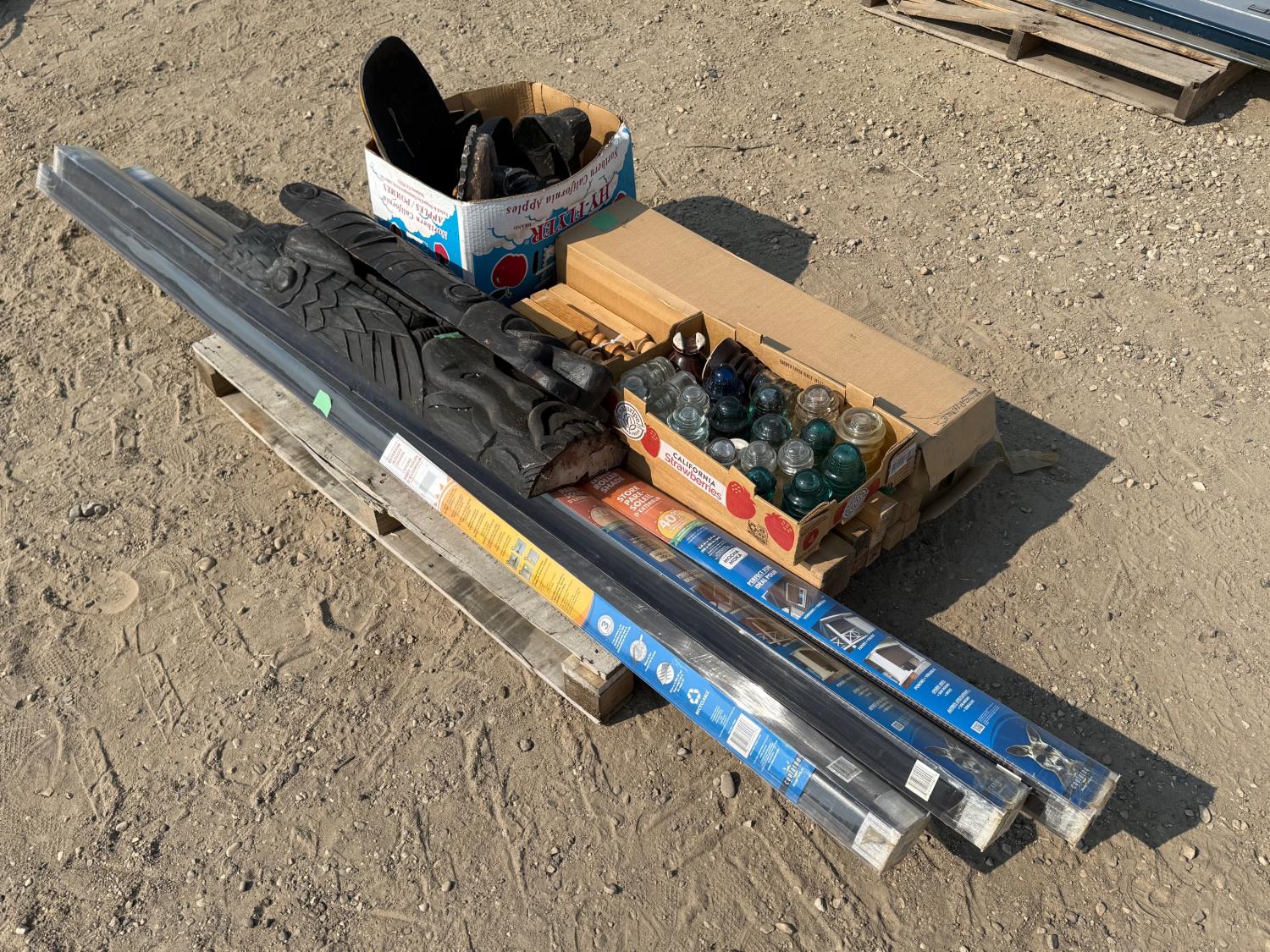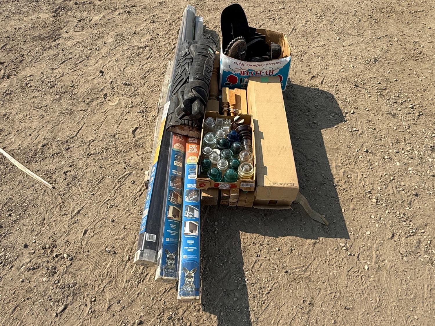 (3) 96 inch roller shades, rail spindles, wooden masks, glass insulators