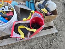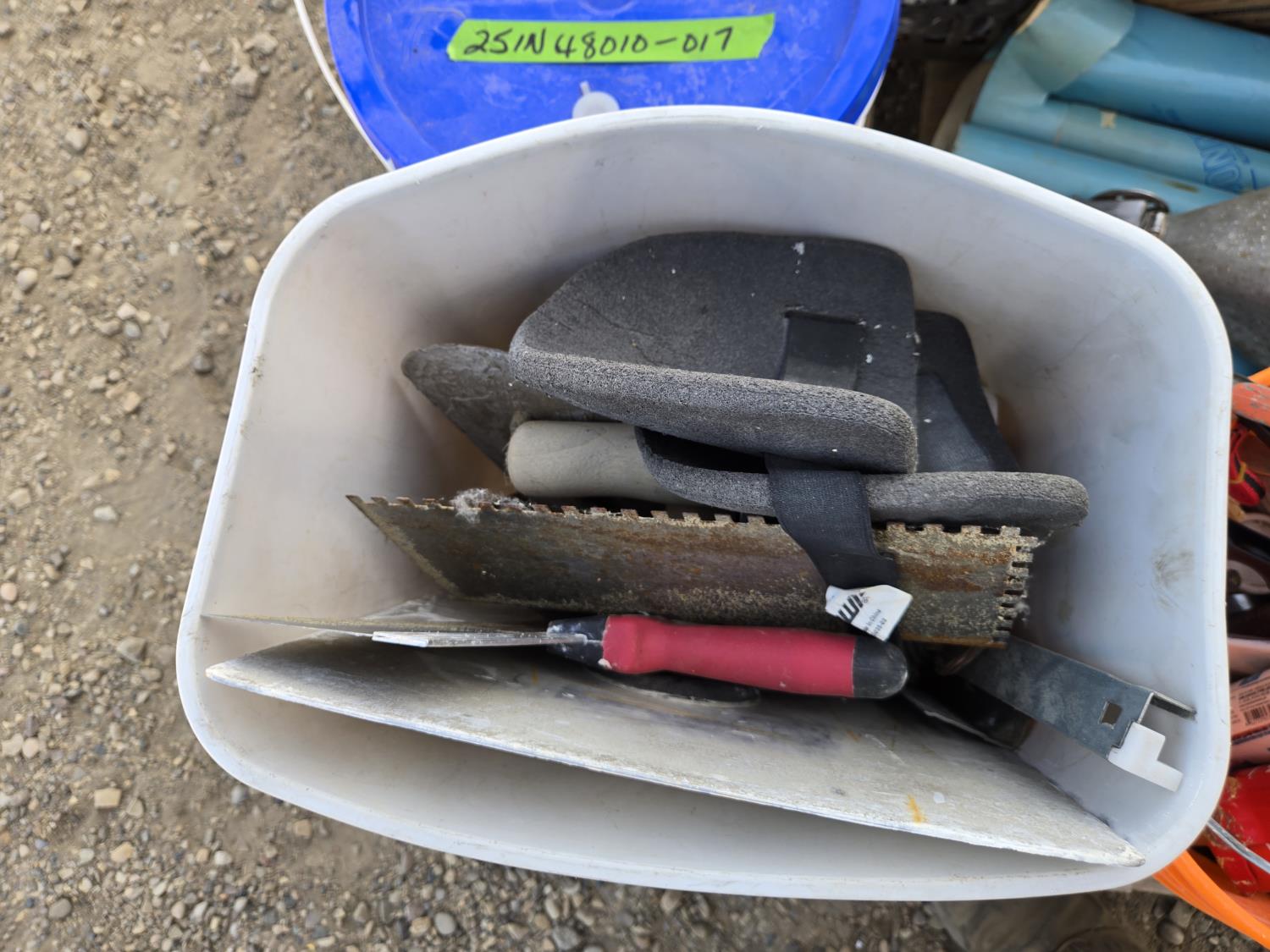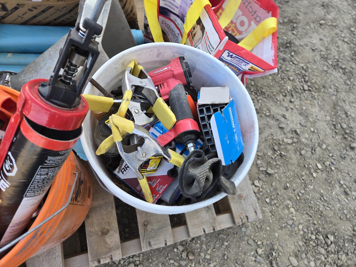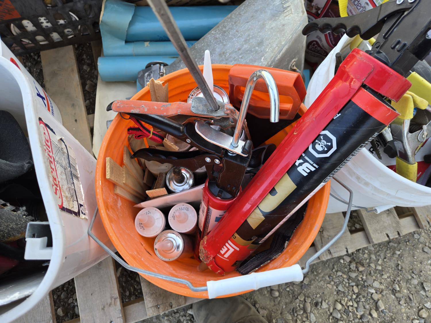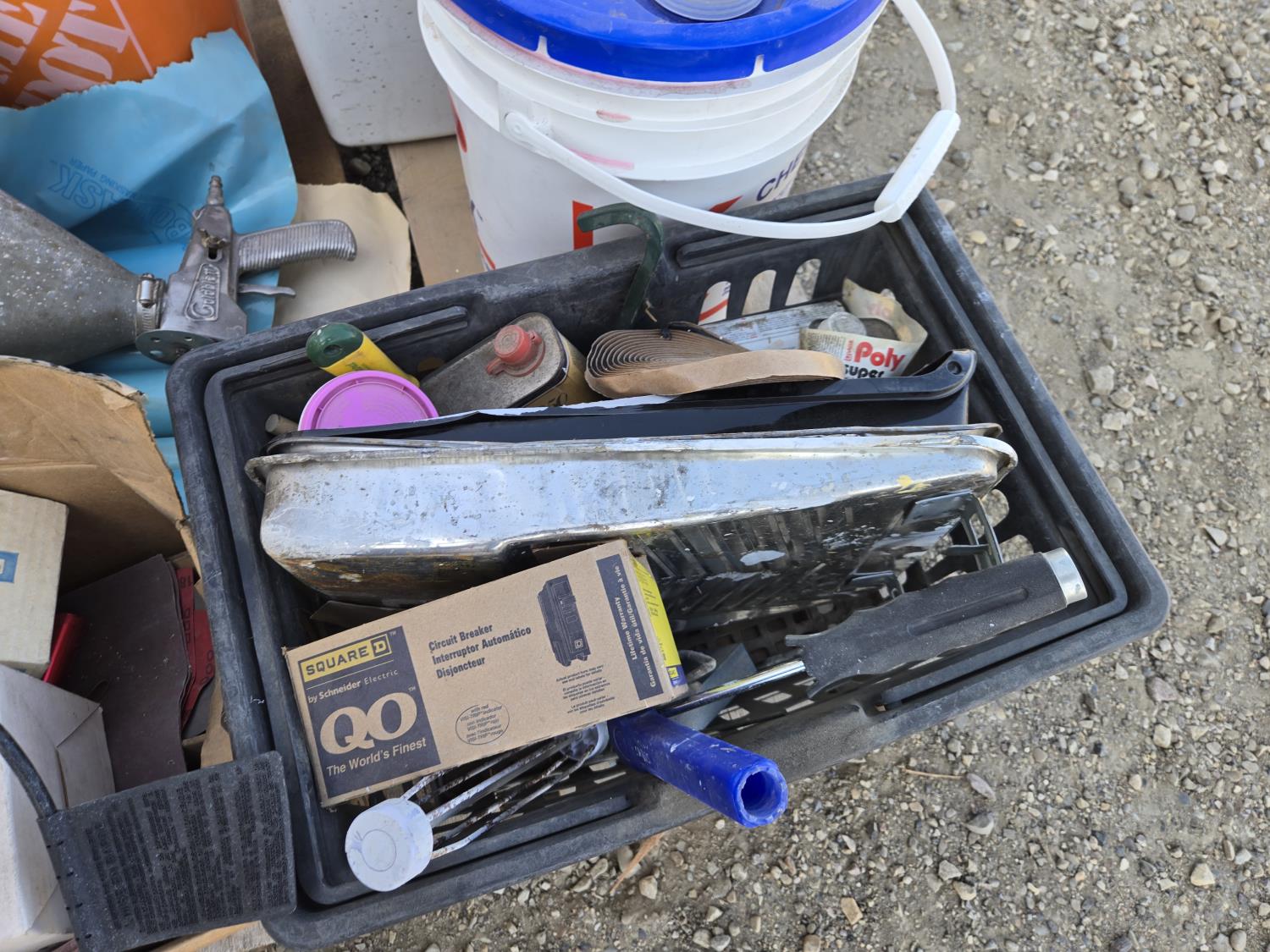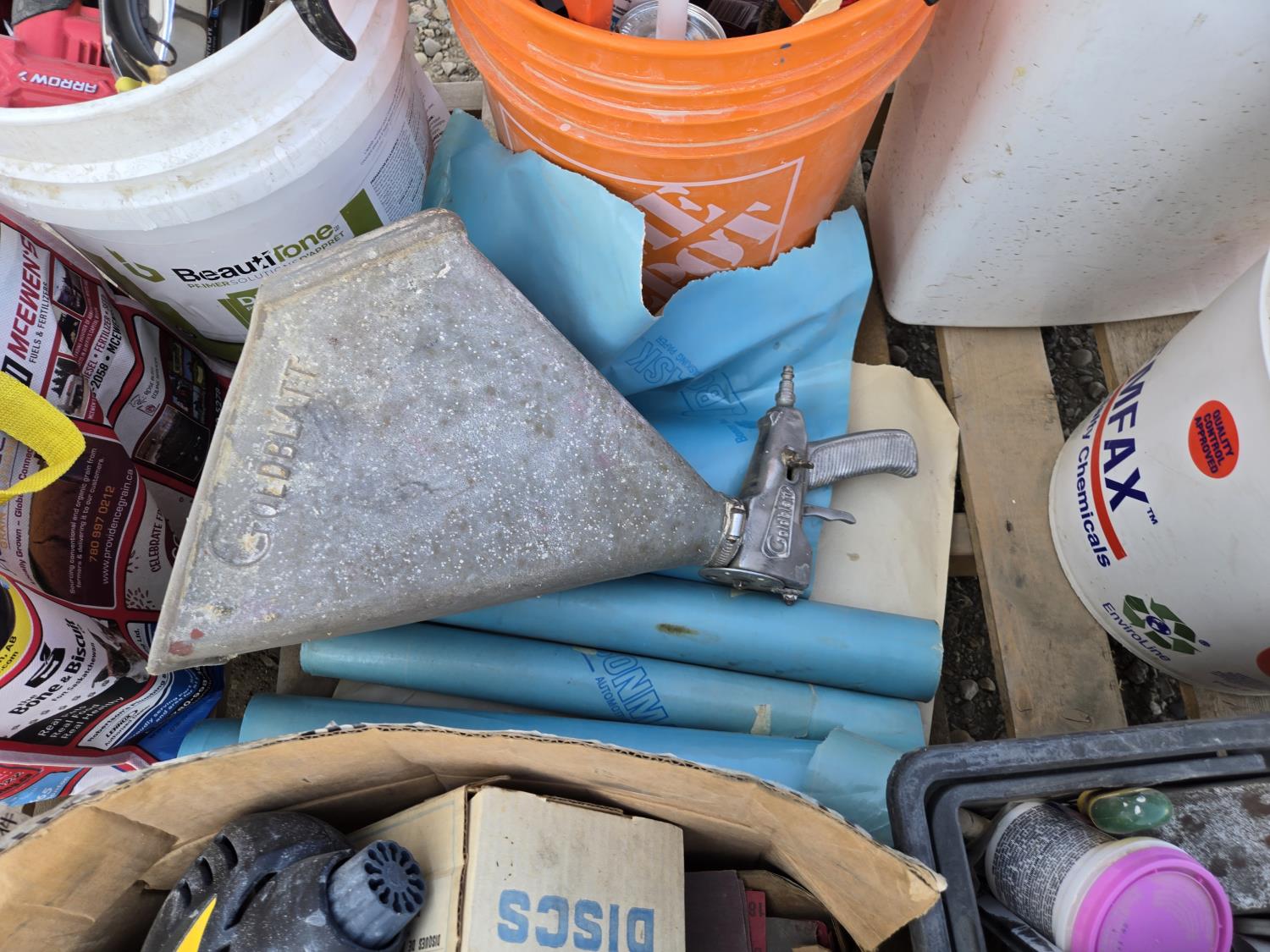 miscellaneous tools, masking paper, paint sprayer, pail of Chem frost, painting supplies, hardware