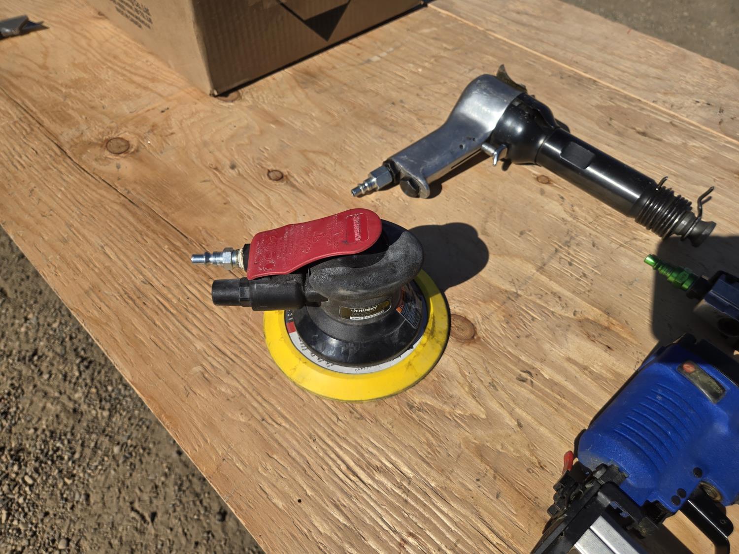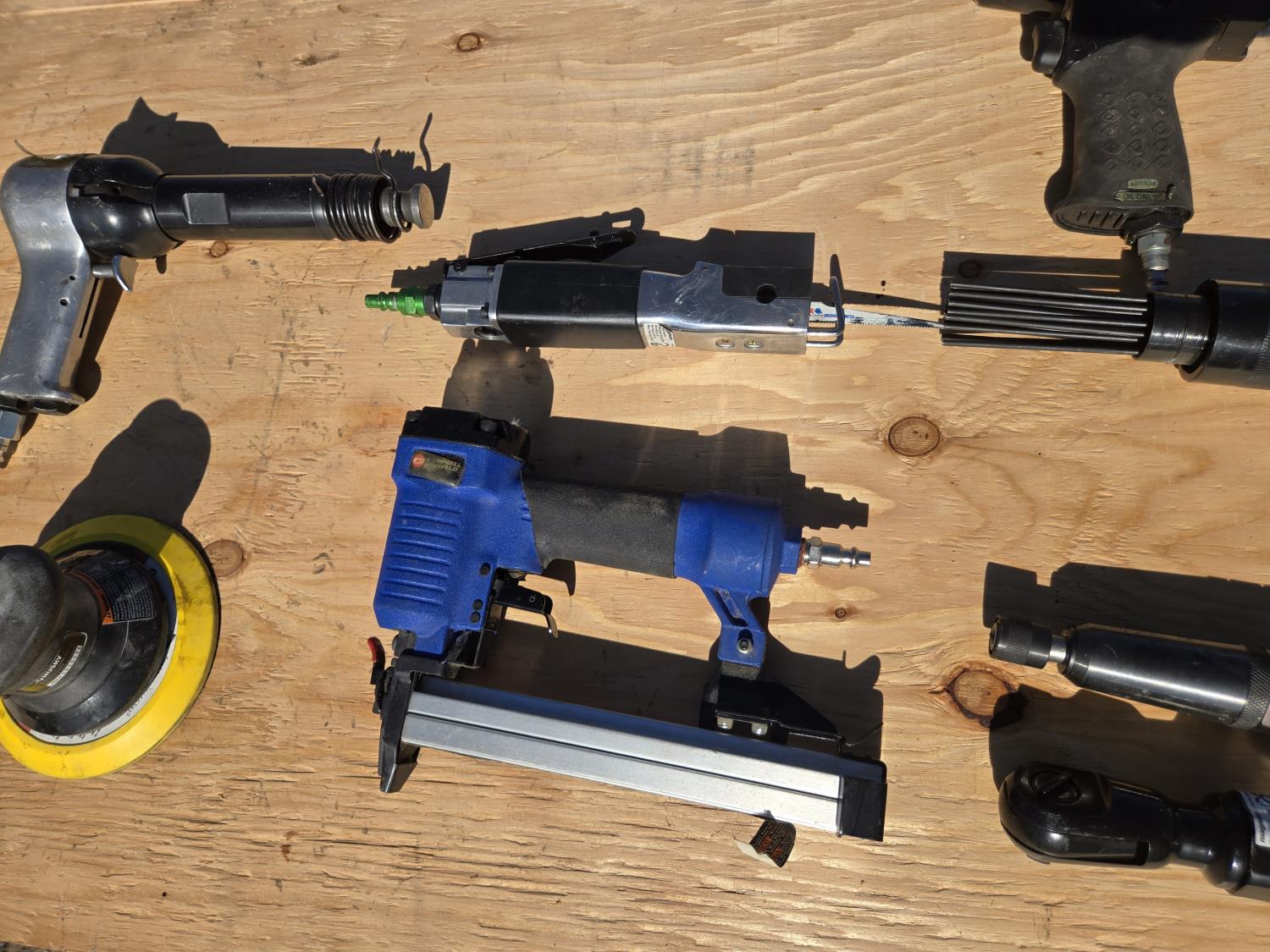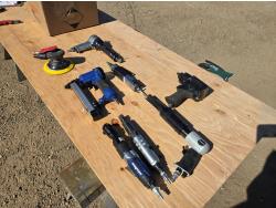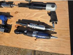 hacksaw, die grinder, brad nailer, 1/2 impact, palm sander, de-scaler, 3/8 ratchet, air chiesel