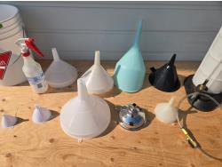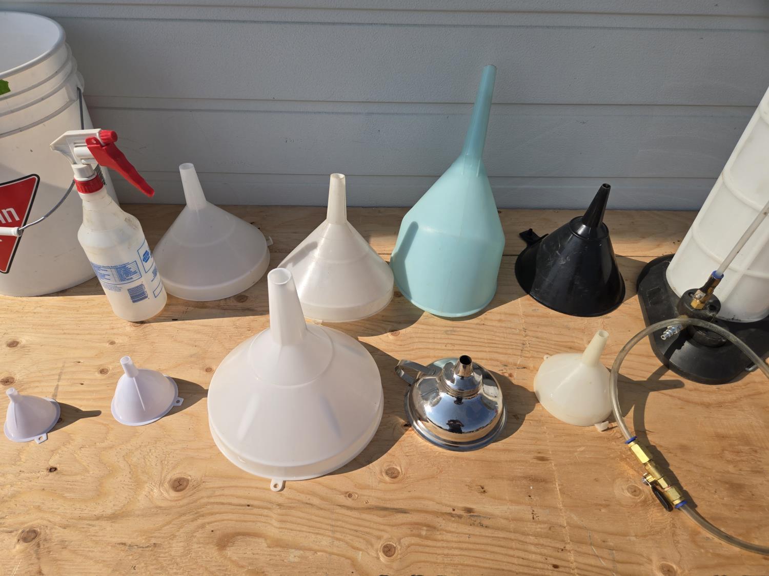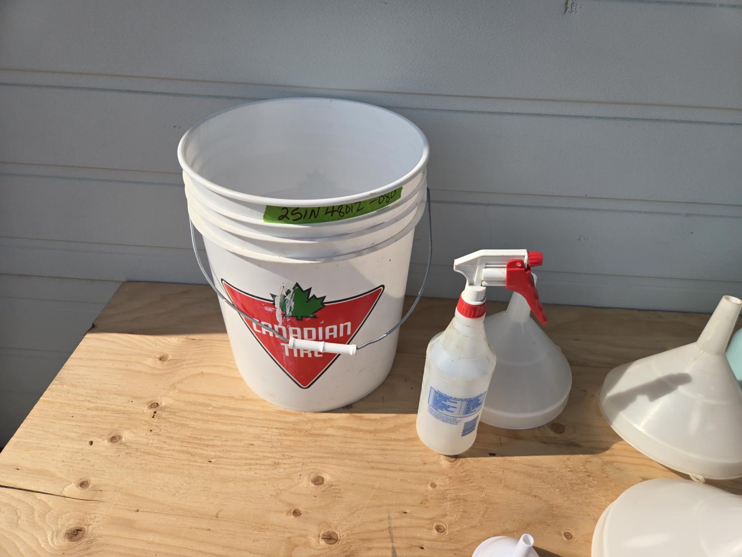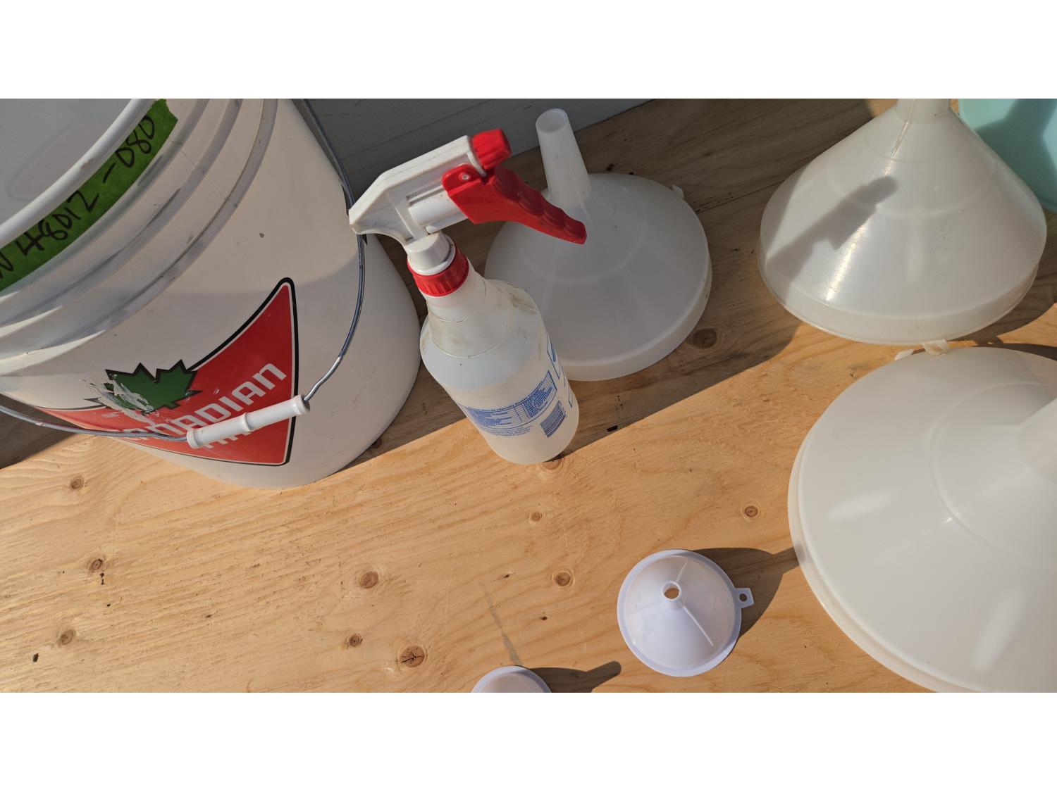 5137 Qty of Funnels, Fluid Extractor, Pail & Spray Bottle