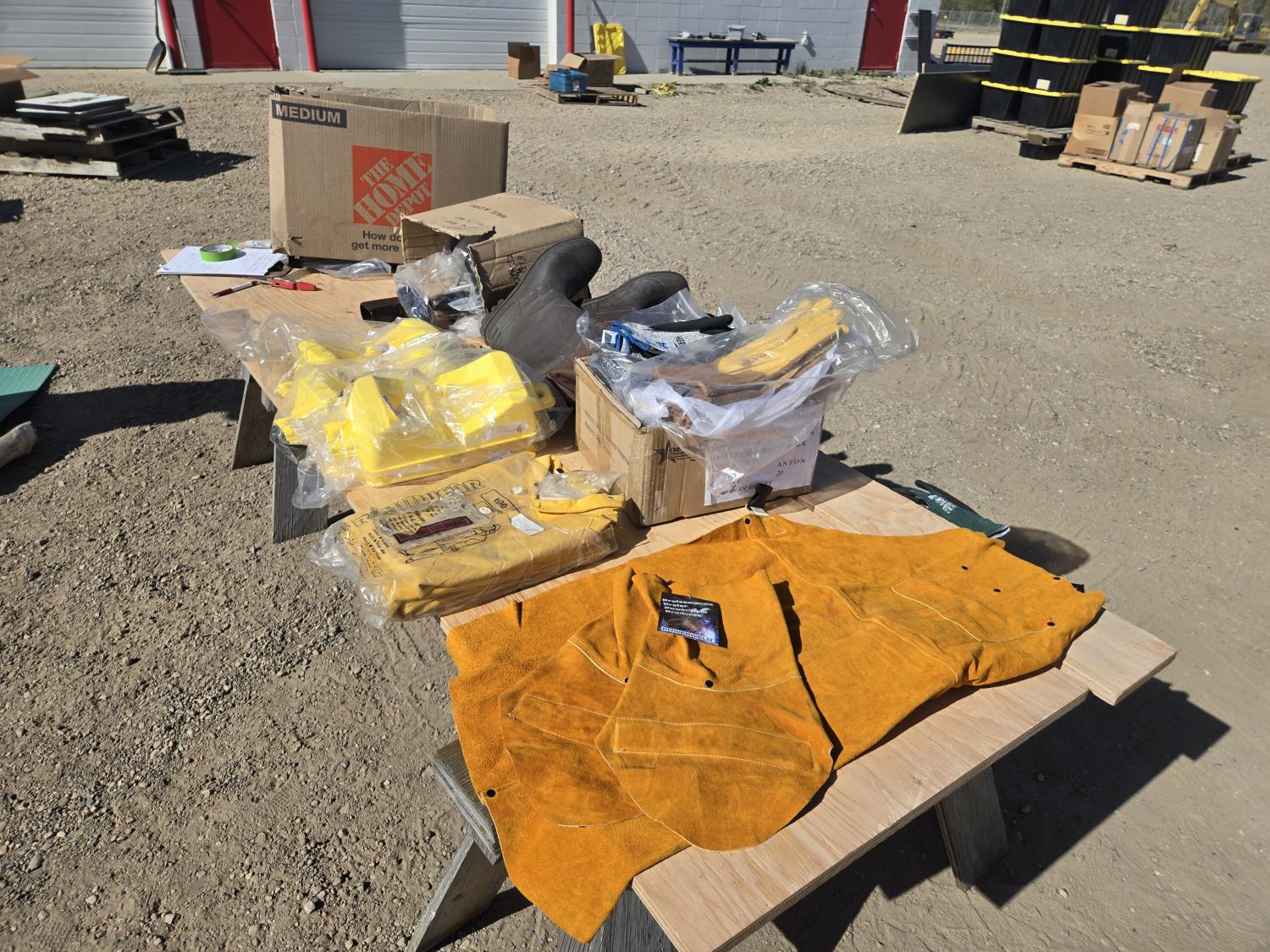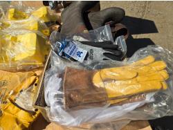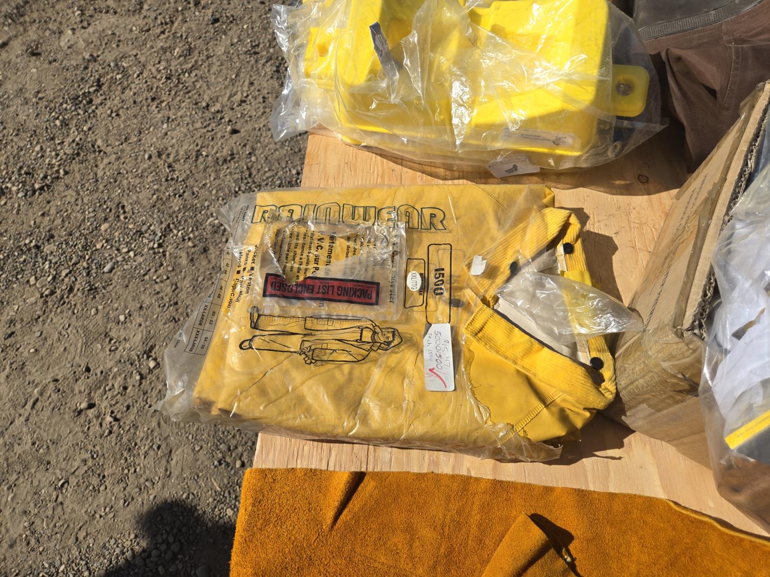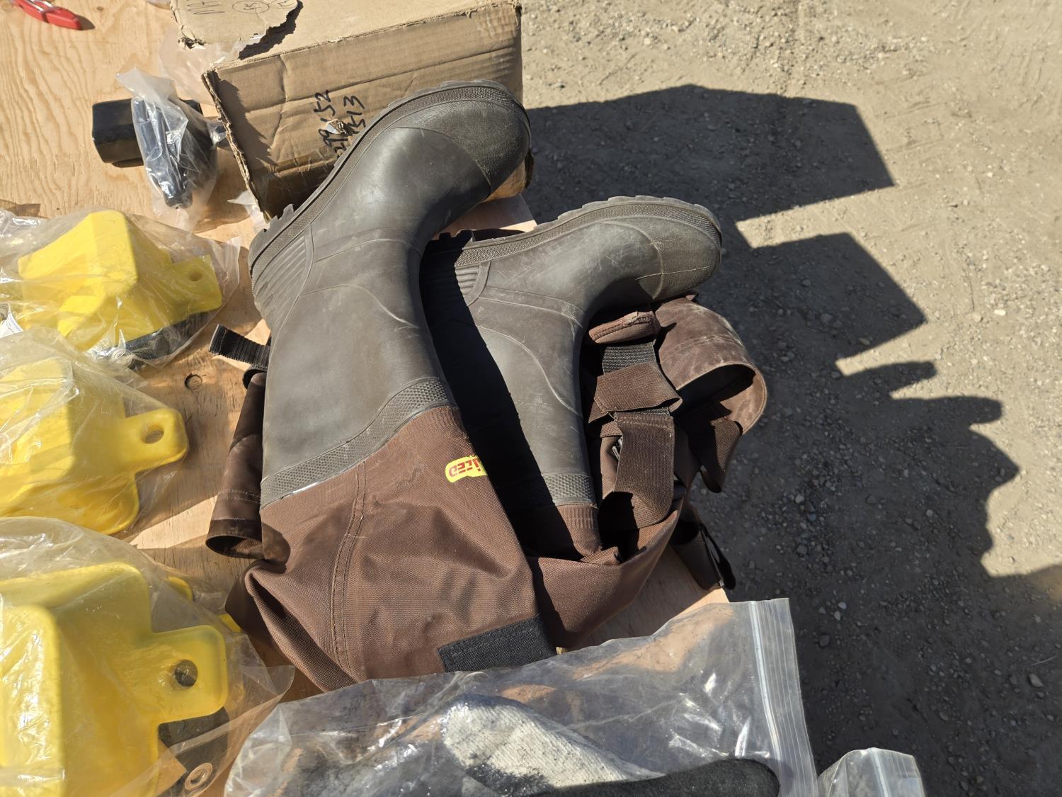 Hip waders, compressed air tank brackets, rain gear, qty of gloves, leather welding bib and boot covers