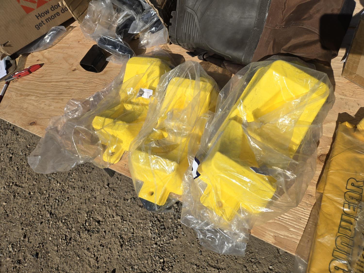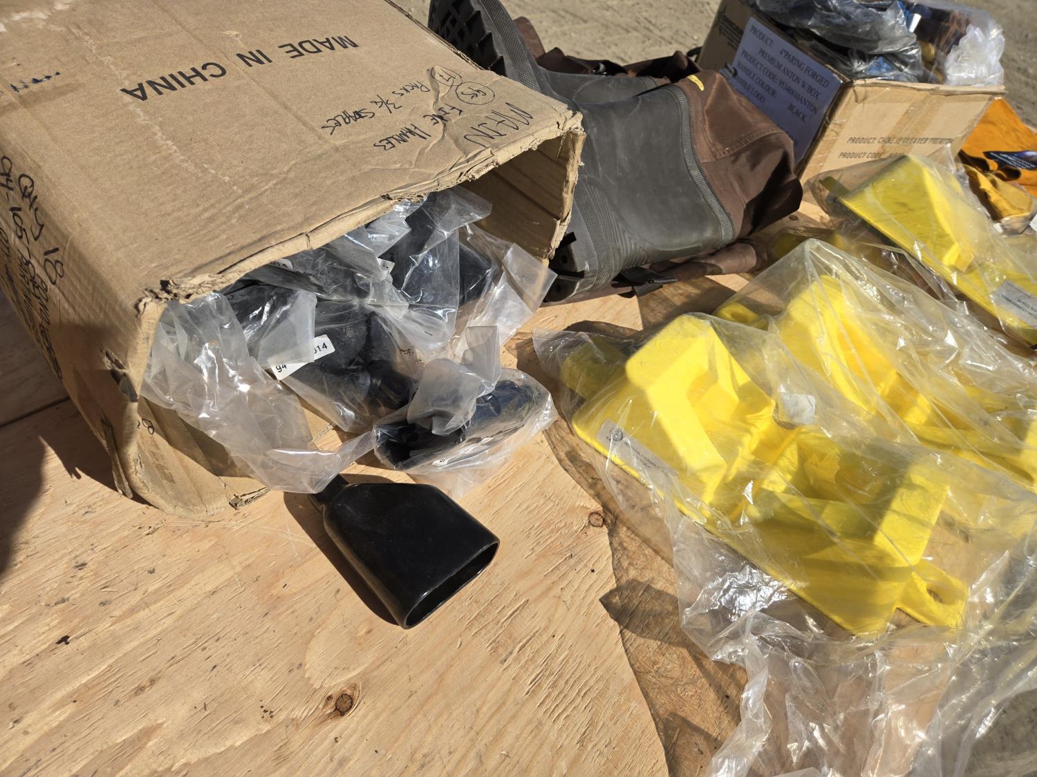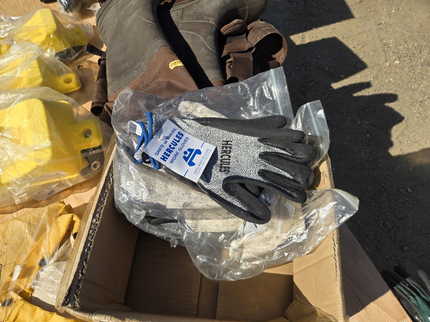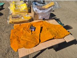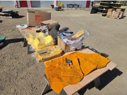Hip waders, compressed air tank brackets, rain gear, qty of gloves, leather welding bib and boot covers