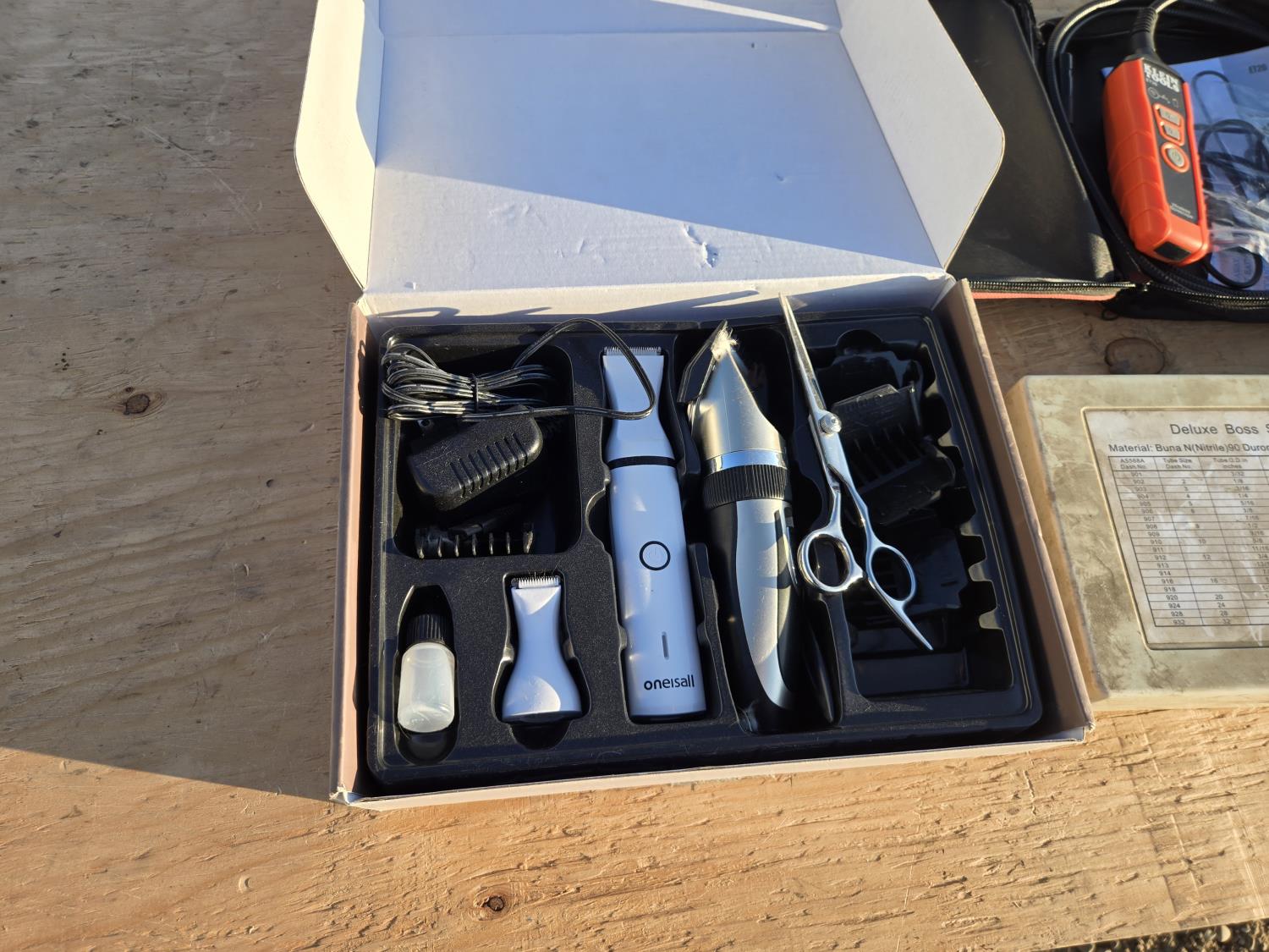 Pet care clipper, (2) o-ring kits, KLein Tools wireless borescope, brush, mop, small parts container
