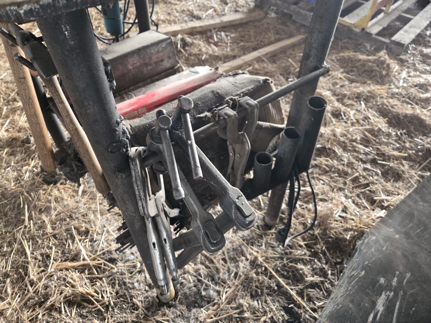 6 inch vise, welding rods, hammers, clamps, vise grips, (2) angle grinders, filing cabinet, miscellaneous items