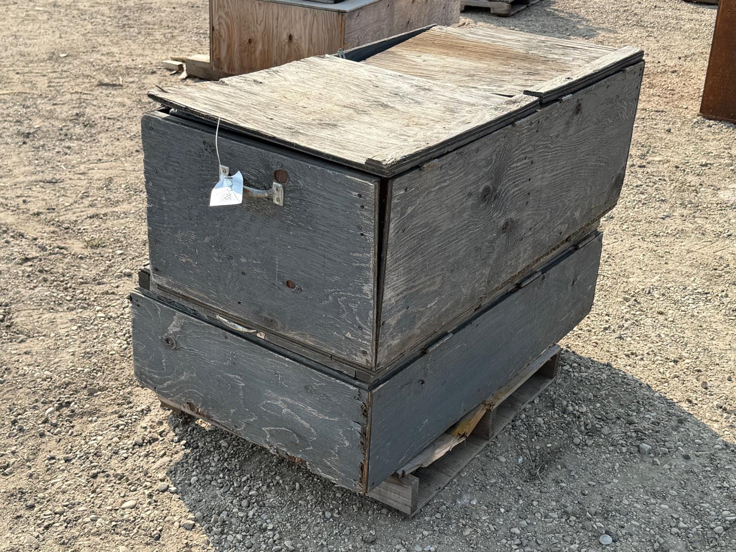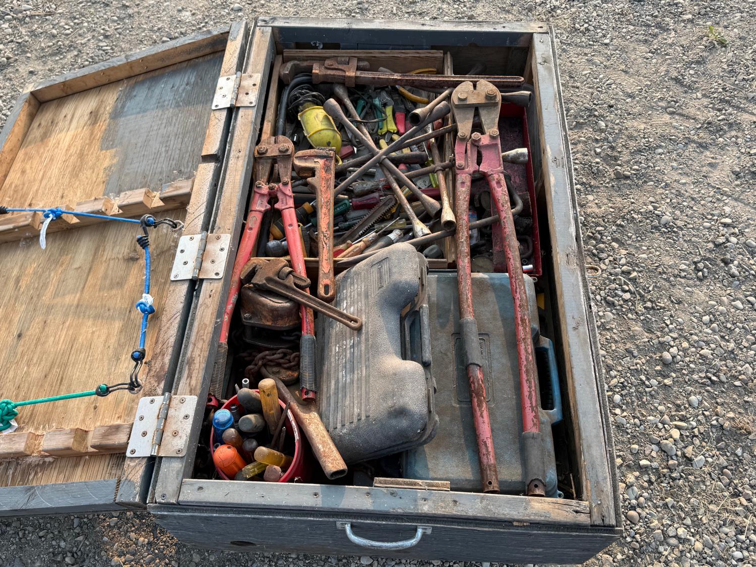 Wooden tool box of air lines and air tools 51 inch x 26 inch x 18 inch. Wooden tool box full of random hand tools.