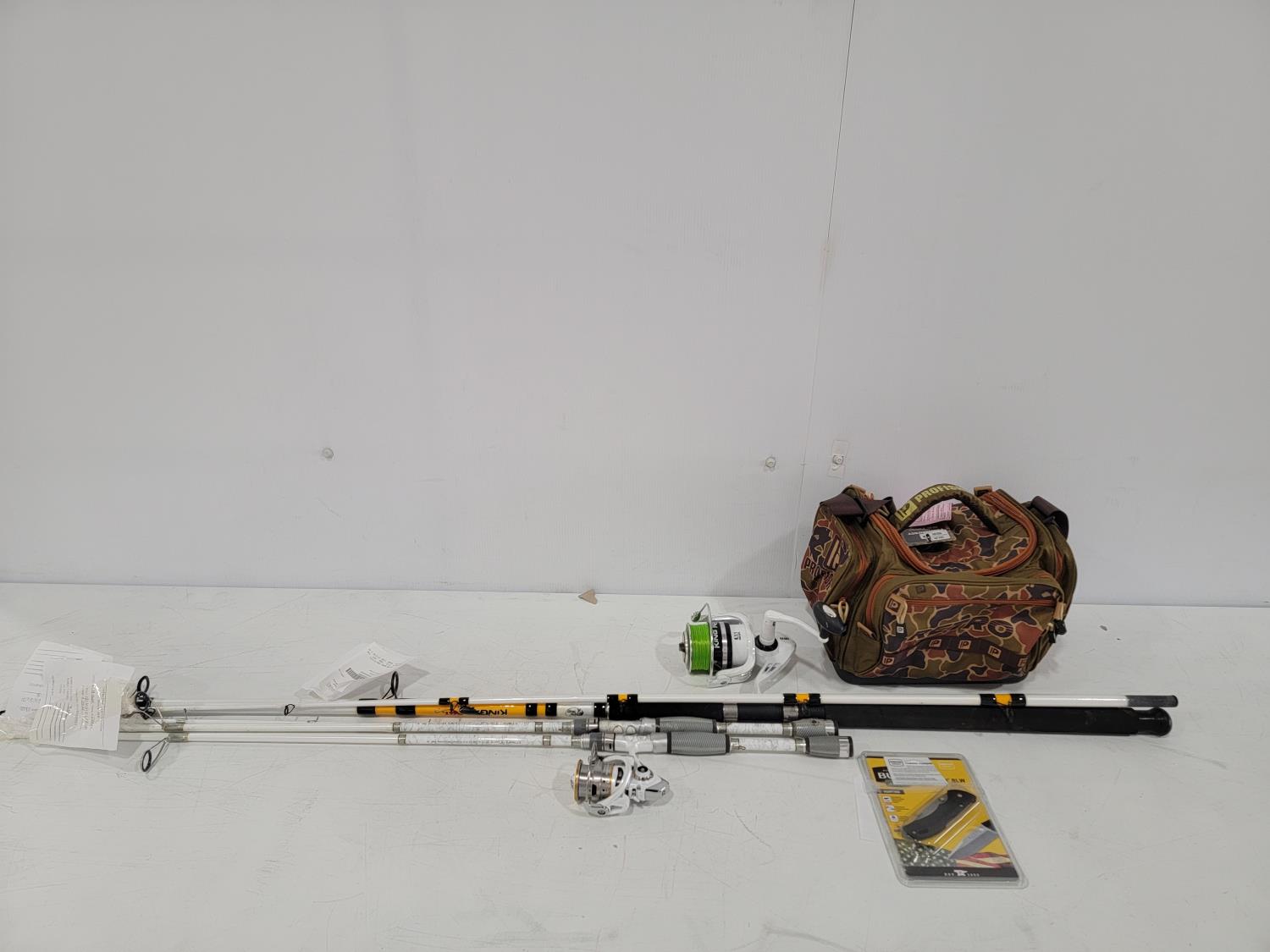 1580 (2) Fishing Rods, Retro Tackle Bag and Buck Folding Knife