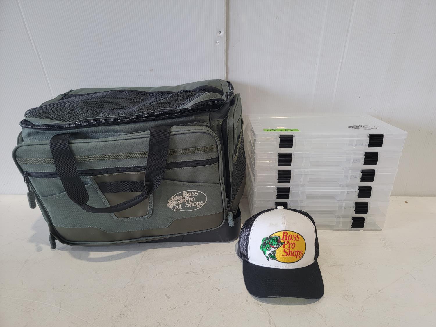 1401 Bass Pro Shops Tackle Bag, (6) Tackle Storage Boxes and Hat