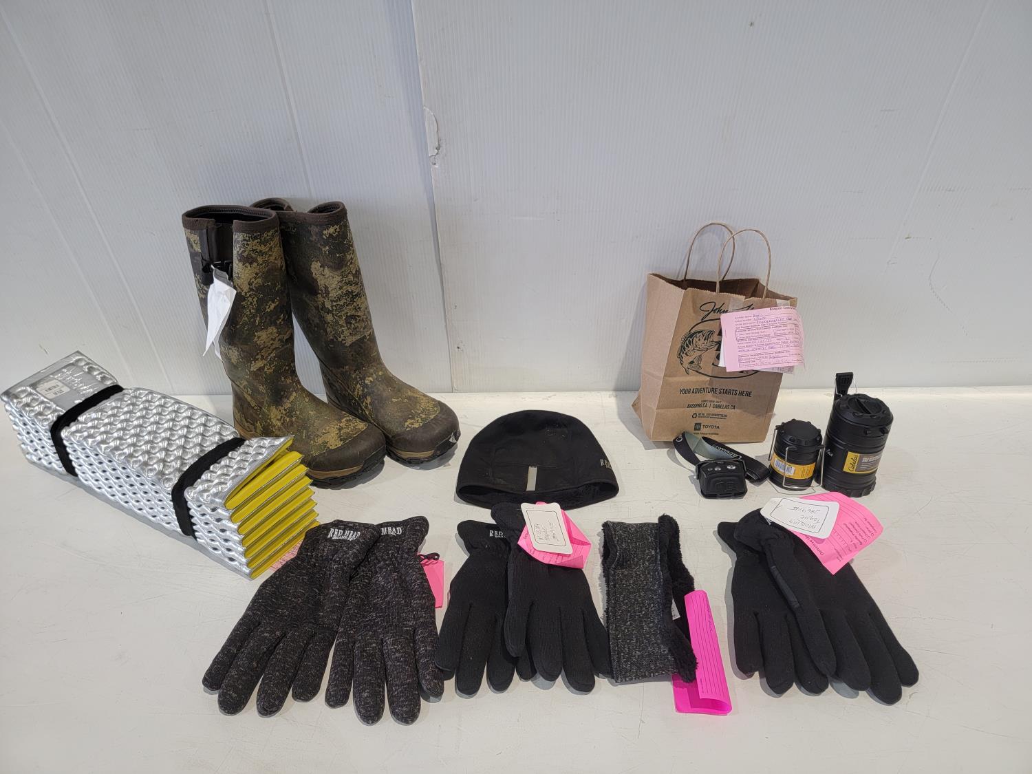 1362 Gloves, (2) Lanterns, Head Lamp, Batteries, Size 10 Boots and Thermarest Mat