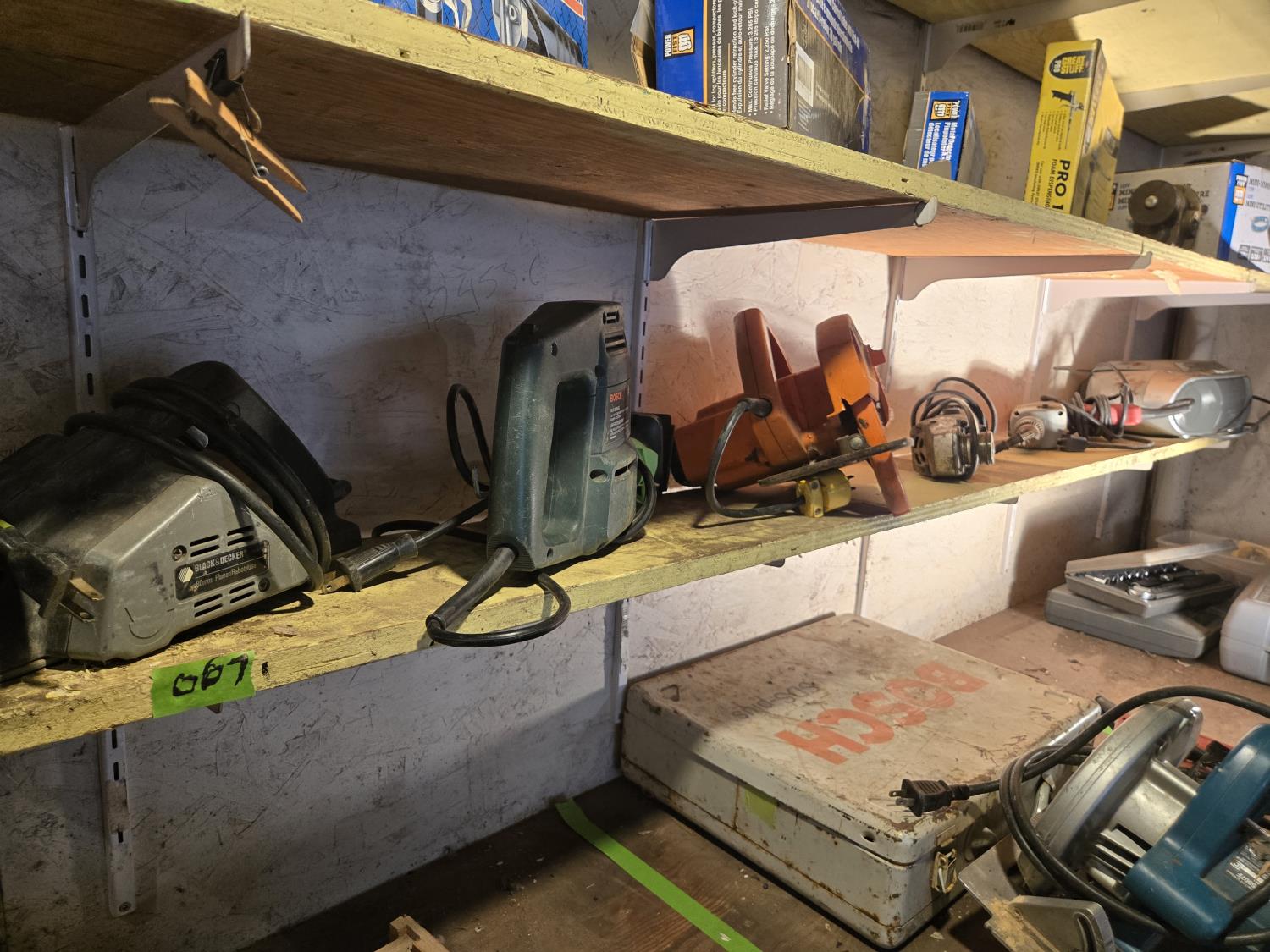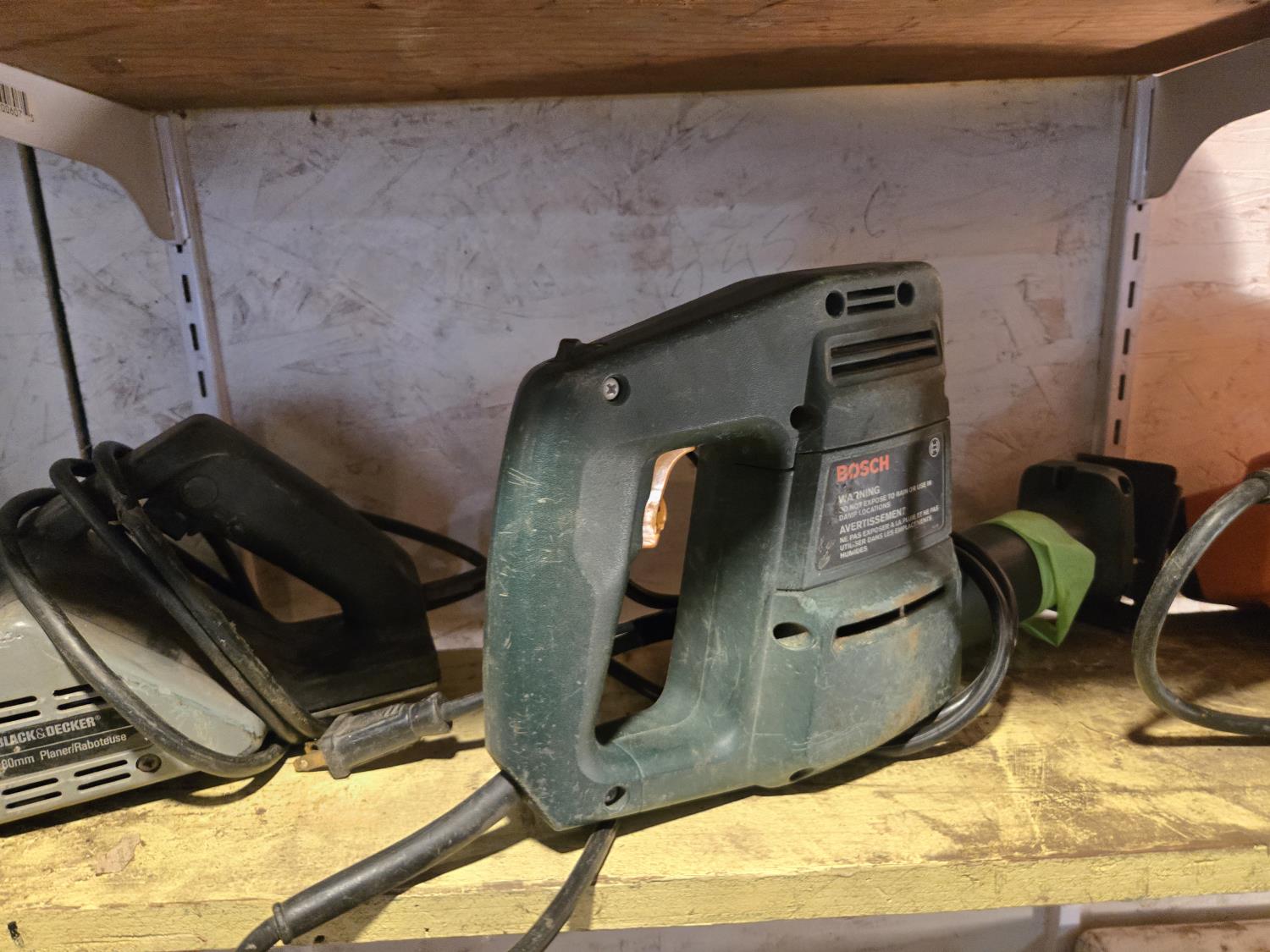 B&D planer, Bosch Sawzall, Makita grinder, Milwaukee 1/2 inch hammer drill, Sony radio