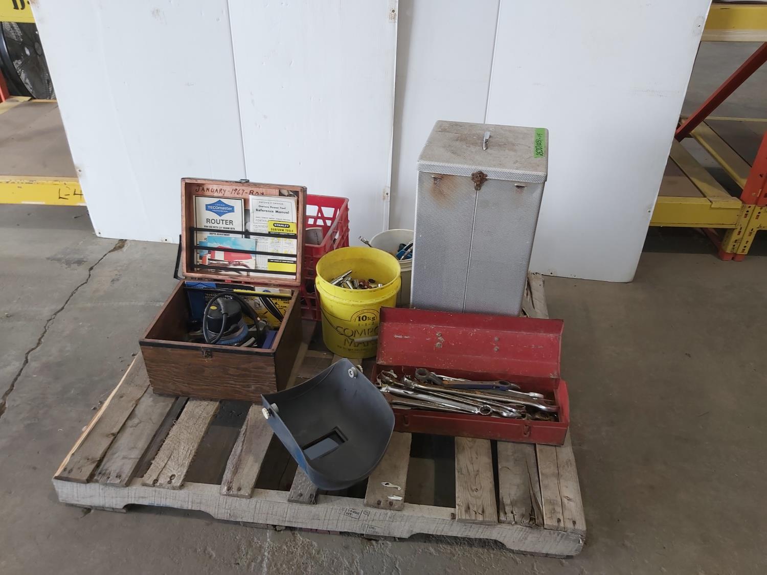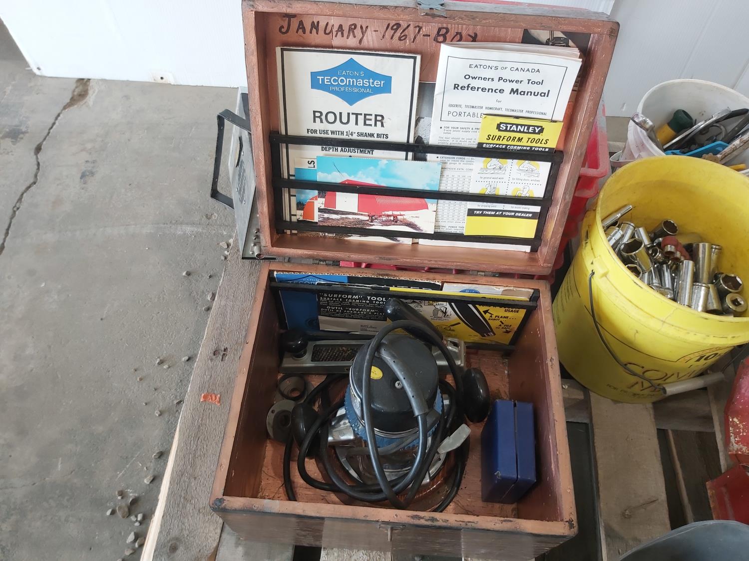 Small tool box with contents, router, Little Chief smoker, face shield, sockets, hand tools, CB radios