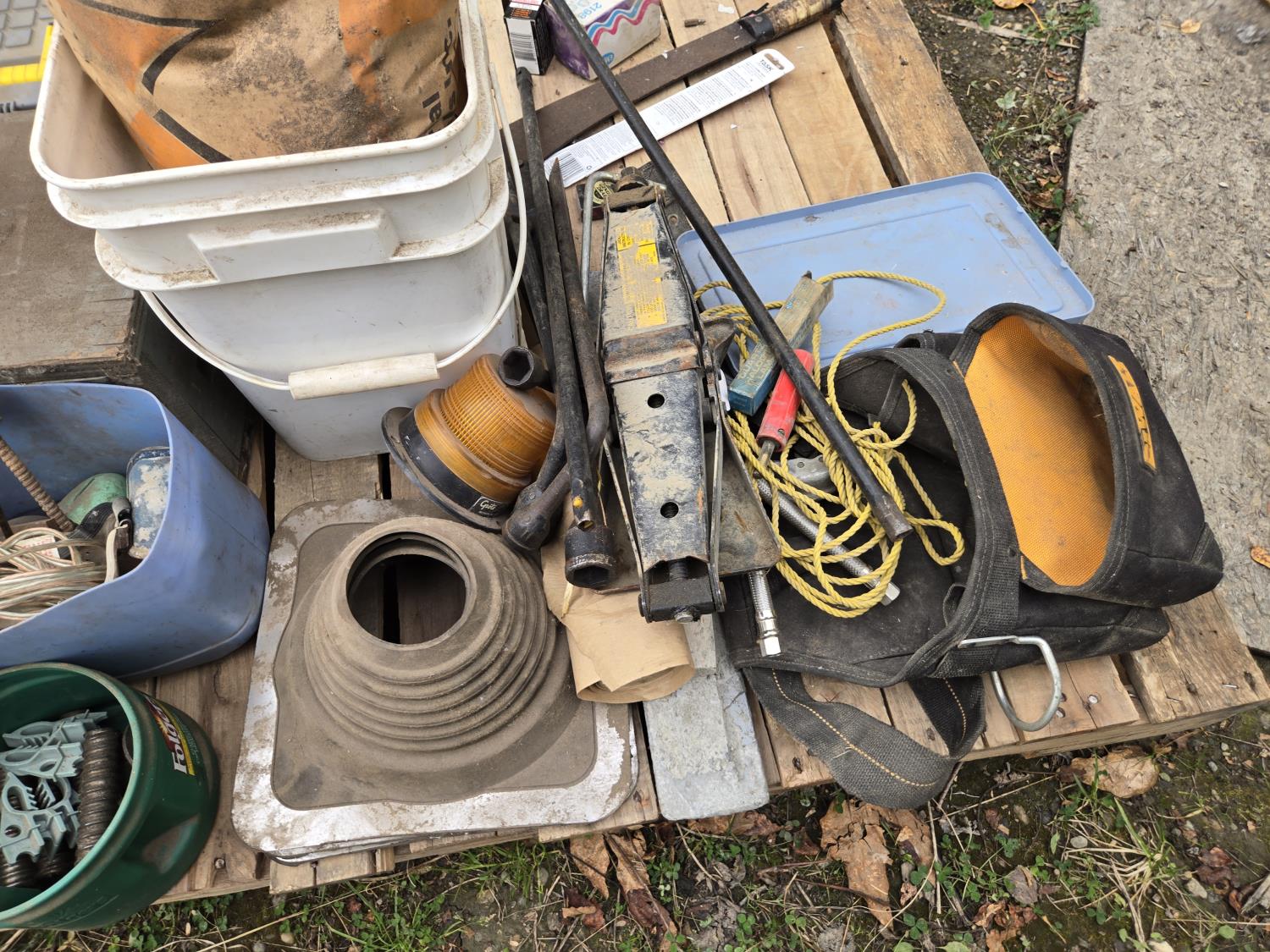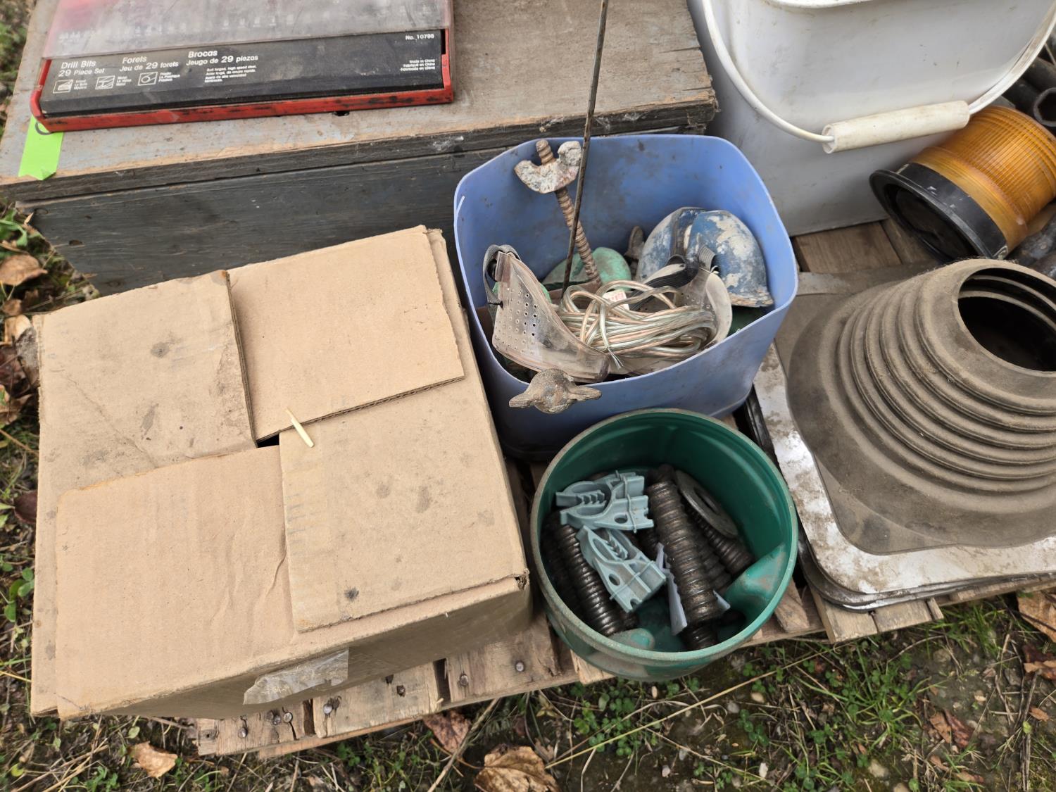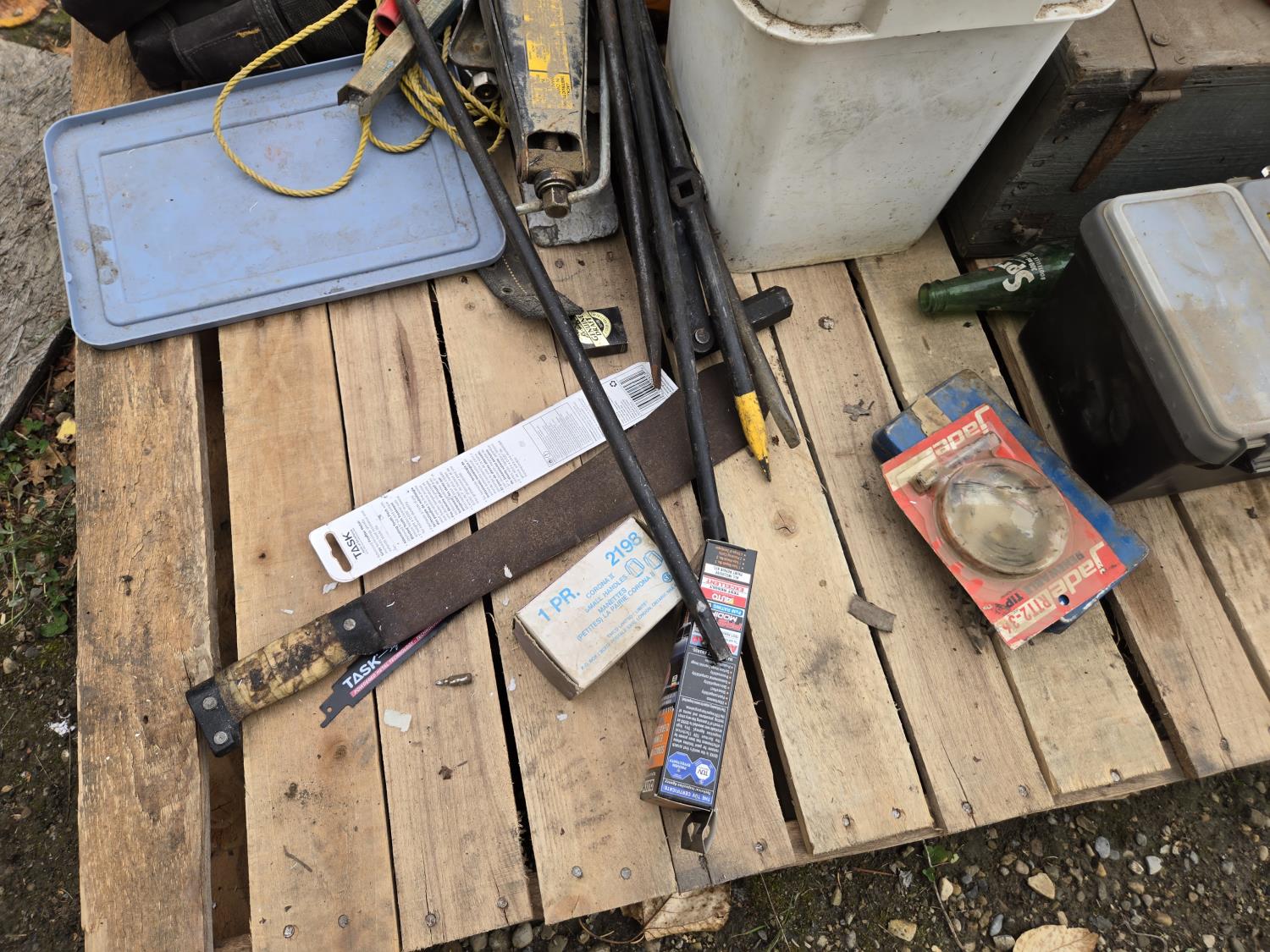 drill bits, fasteners, tool belt, tire irons, miscellaneous items
