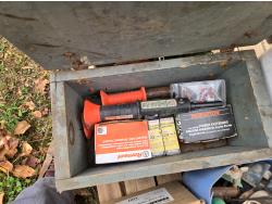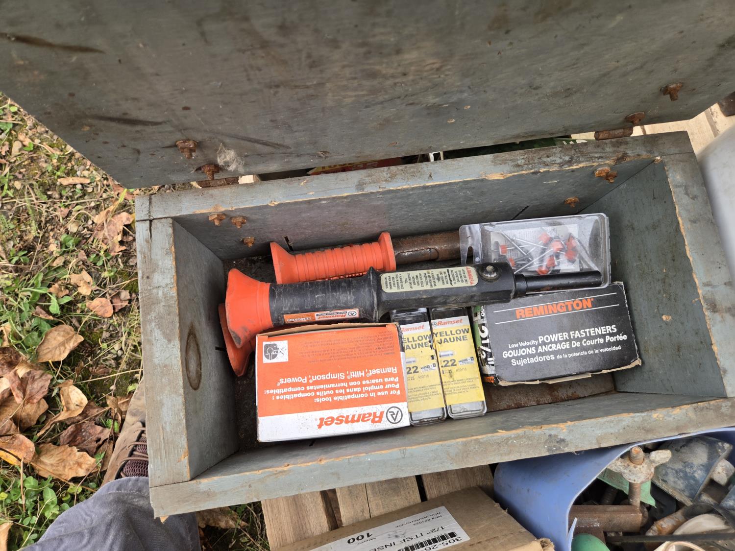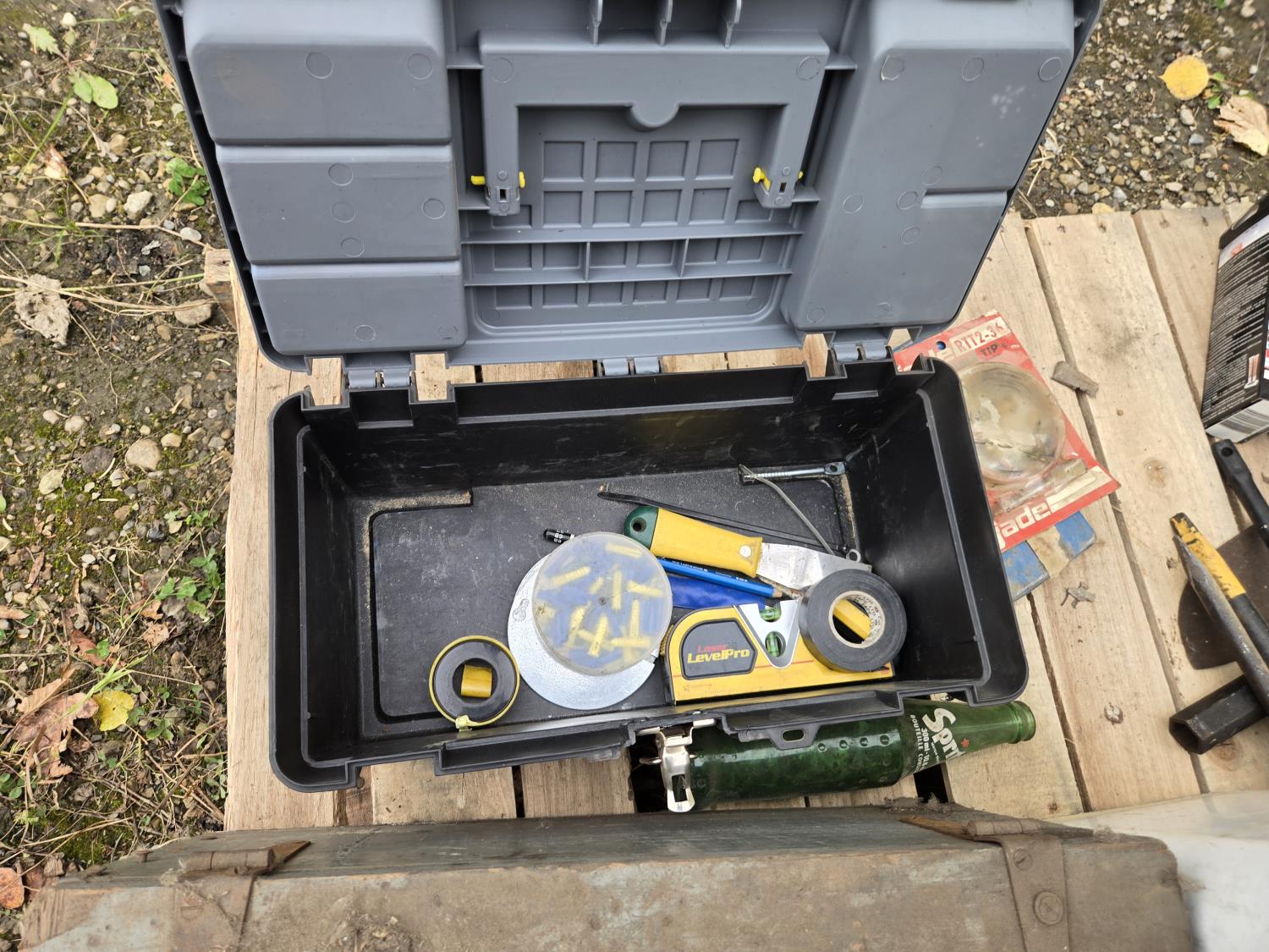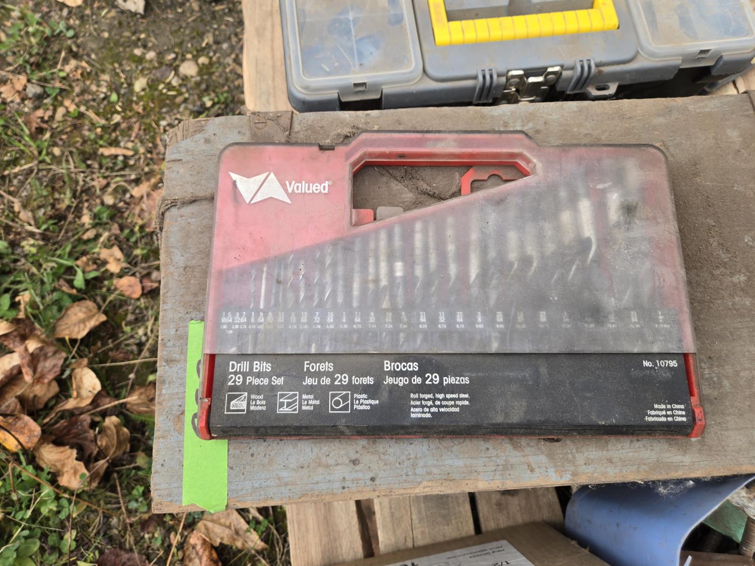 drill bits, fasteners, tool belt, tire irons, miscellaneous items