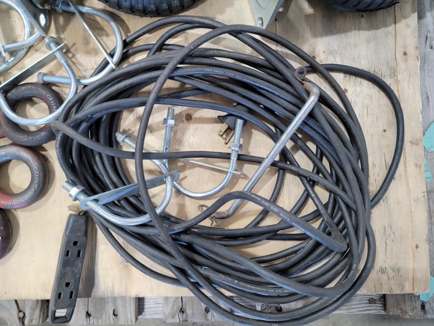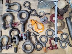 (2) bottle jacks, shackles, eye bolts, extension cords, (4) 8 inch swivel casters, slip hooks,