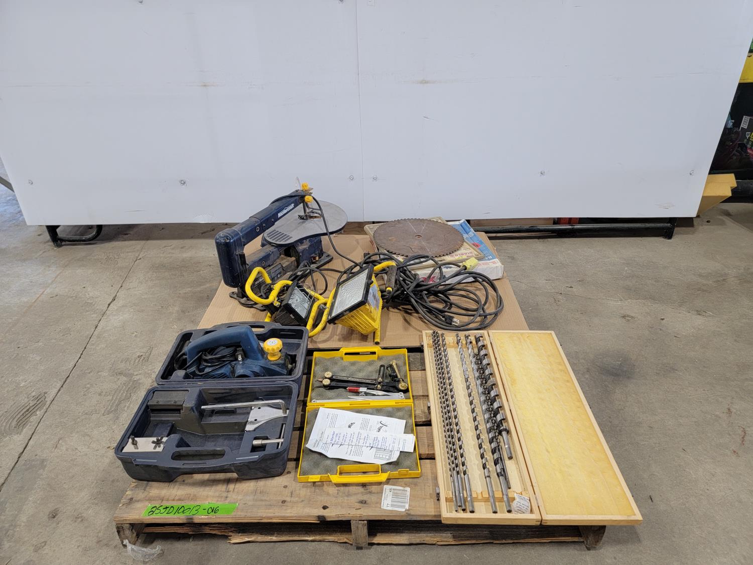 Veritas transfer/log scribe, Mastercraft 3-1/4 inch planer, (2) work lights, Mastercraft 16 inch scroll saw, (3) circular saw blades, band saw blades, drill bits