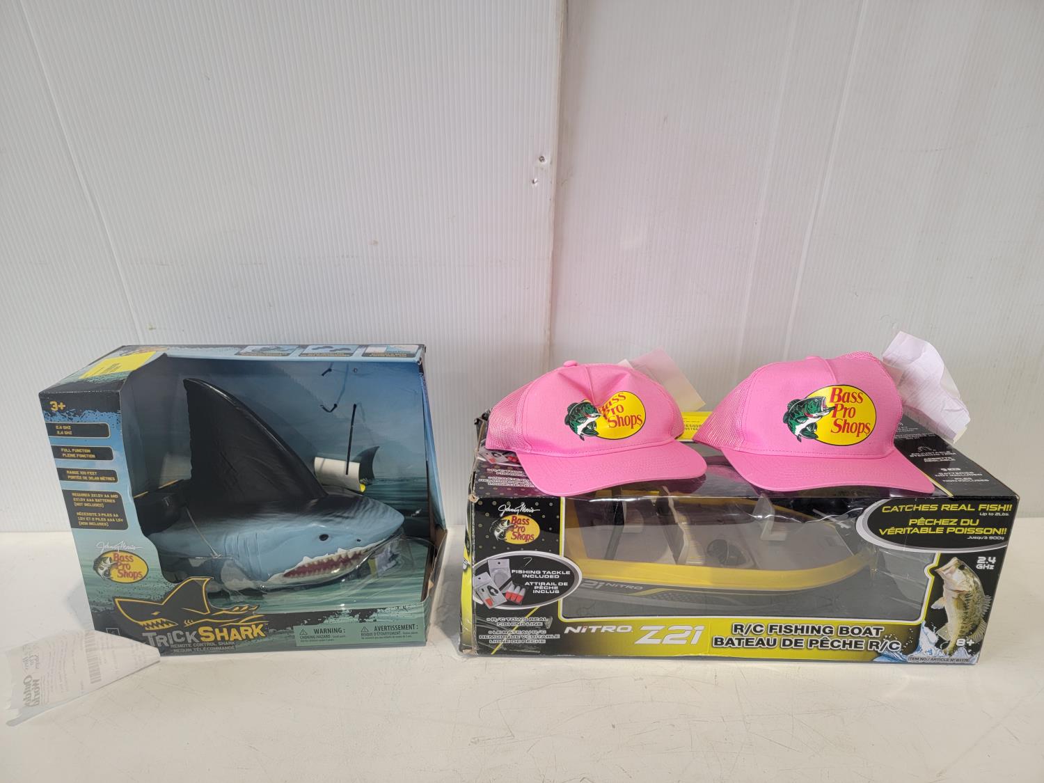 1391 Trick Shark Remote Control Shark, Nitro Z21 Remote Control Fishing Boat and (2) Hats