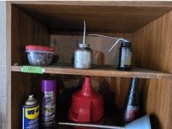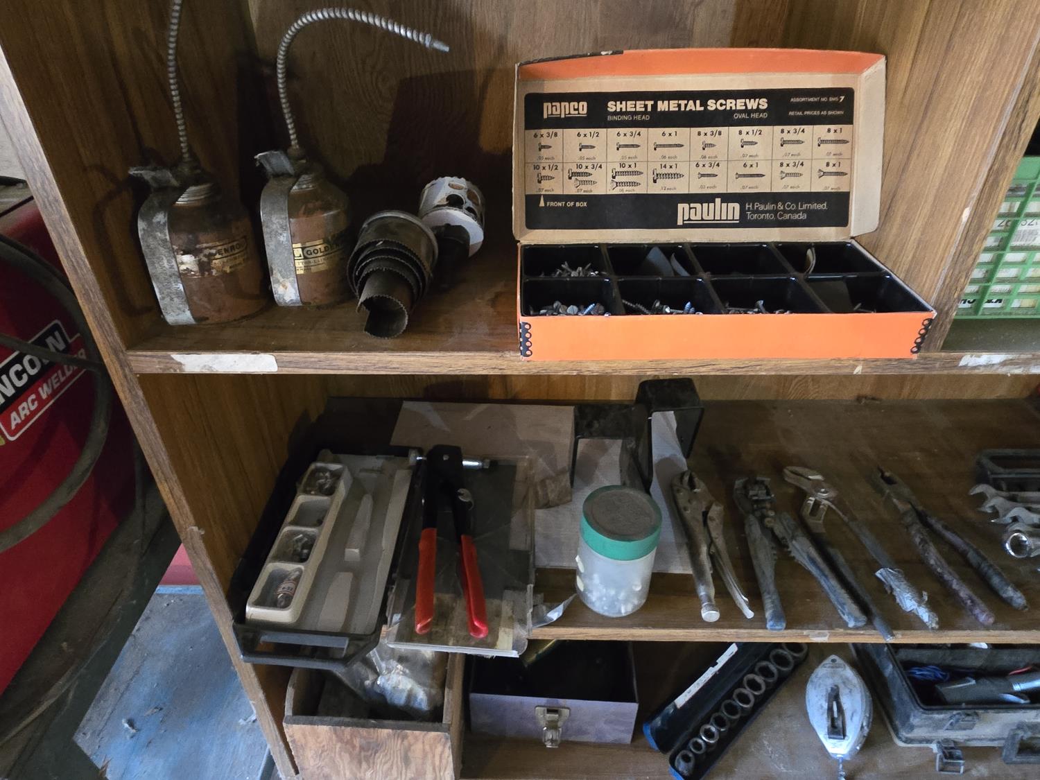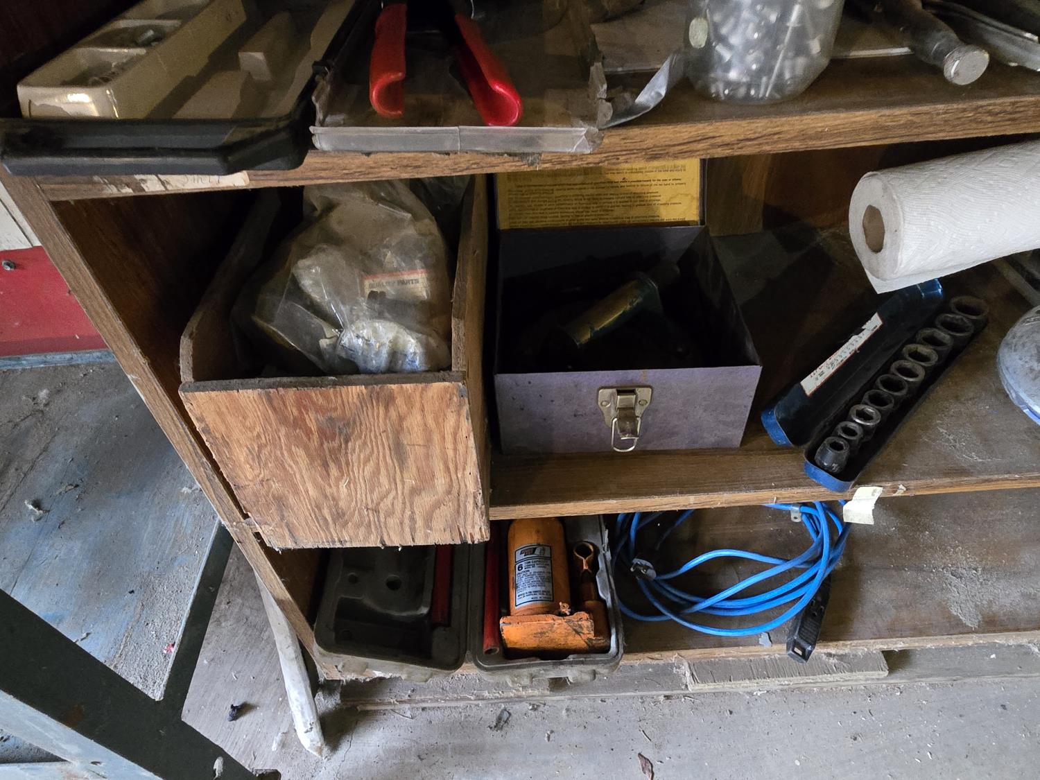 oil cans, hardware, 6 ton bottle jack, impact sockets, miscellaneous items