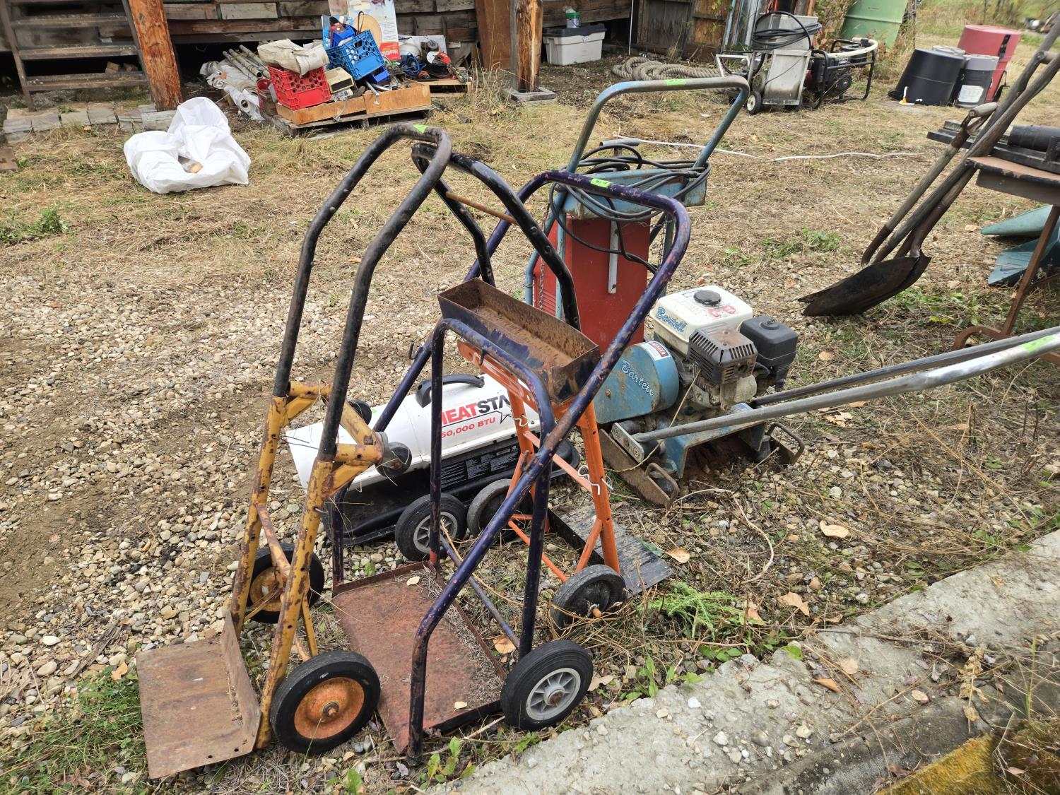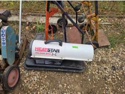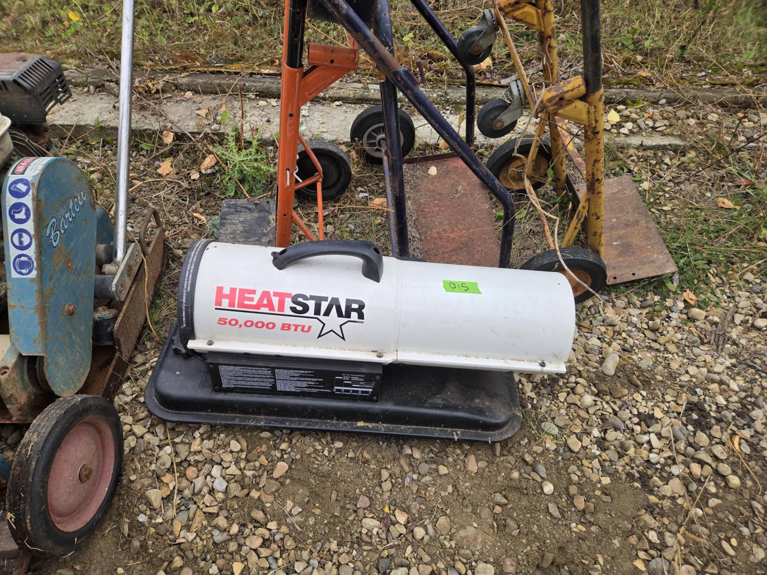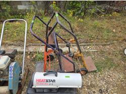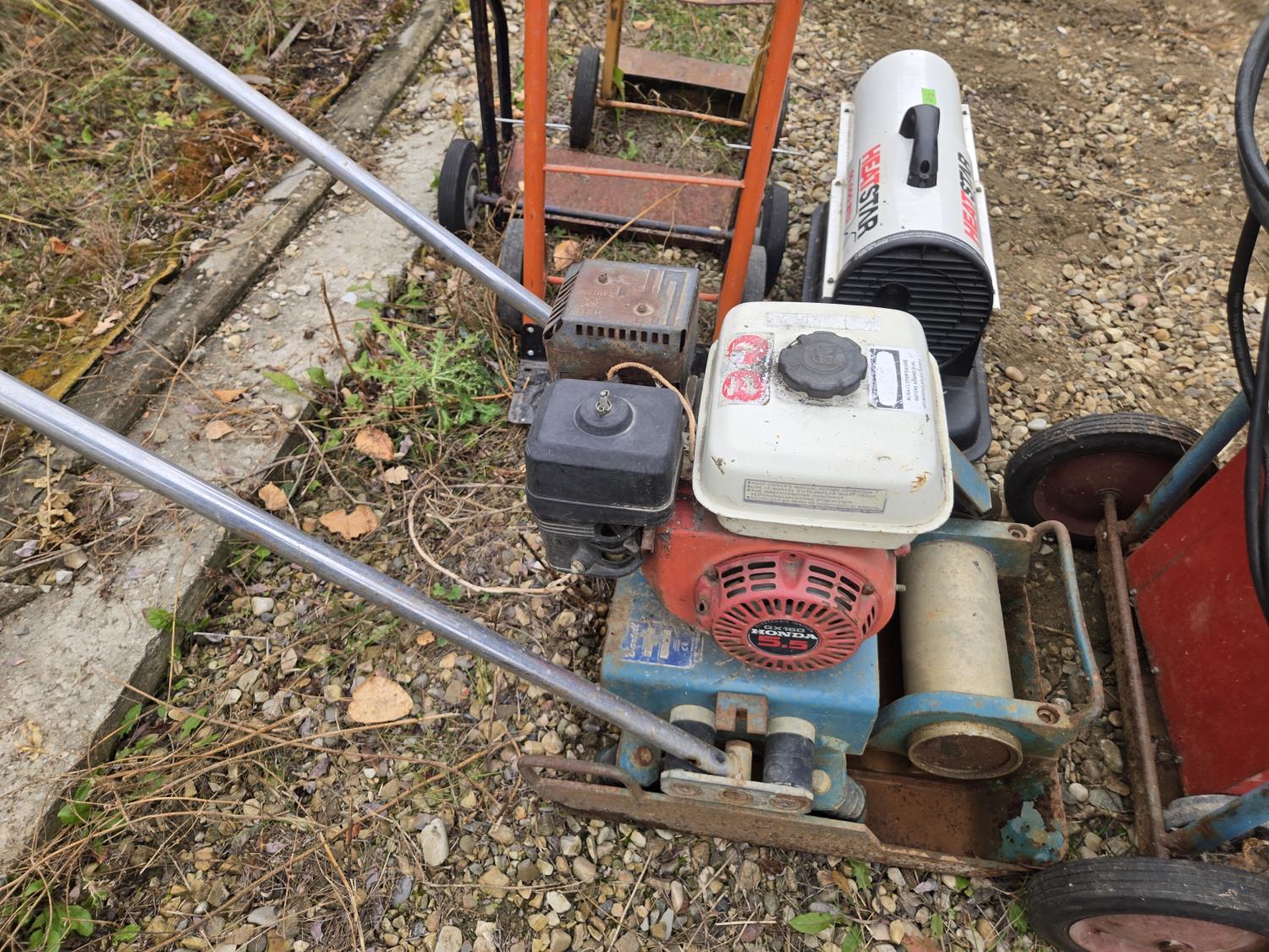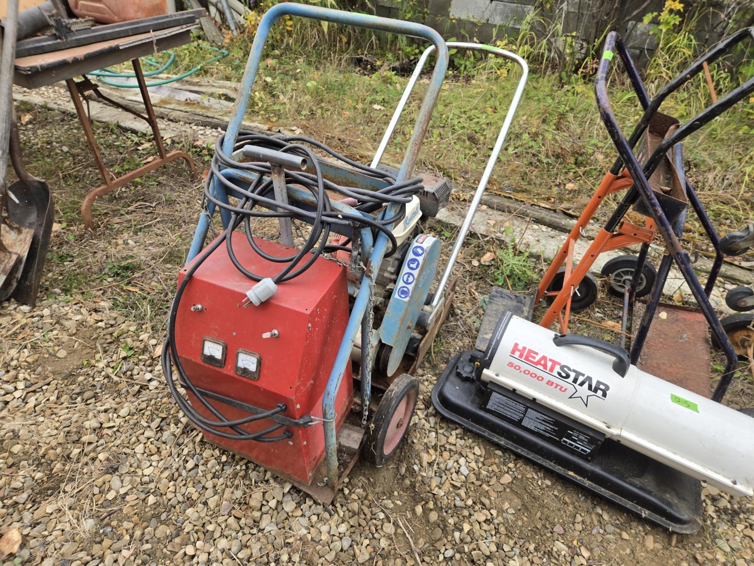 Heat Star 50, 000 BTU diesel heater, (3) shop dollies, battery charger, plate tamper (condition unknown)