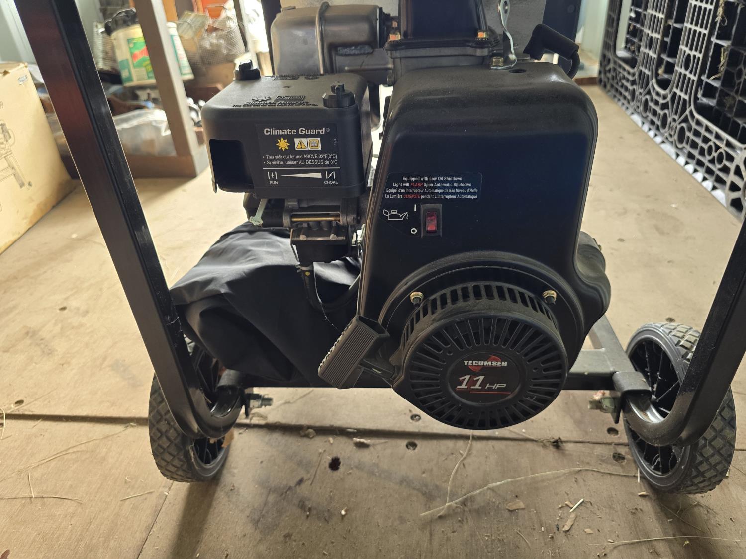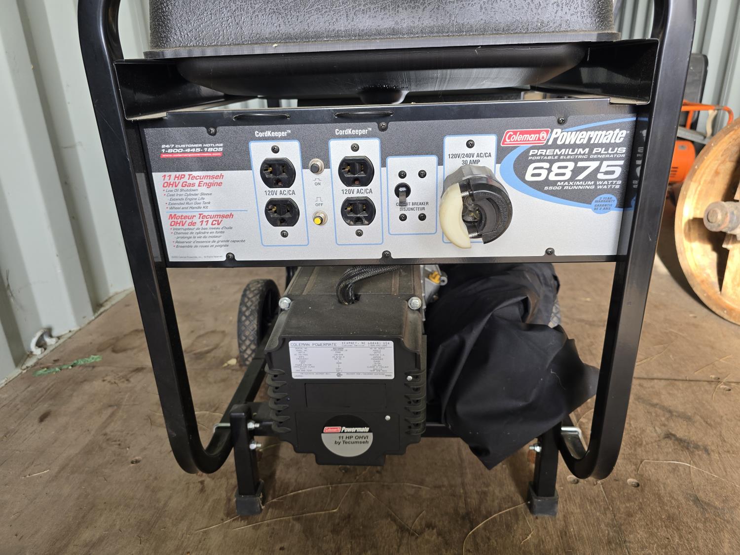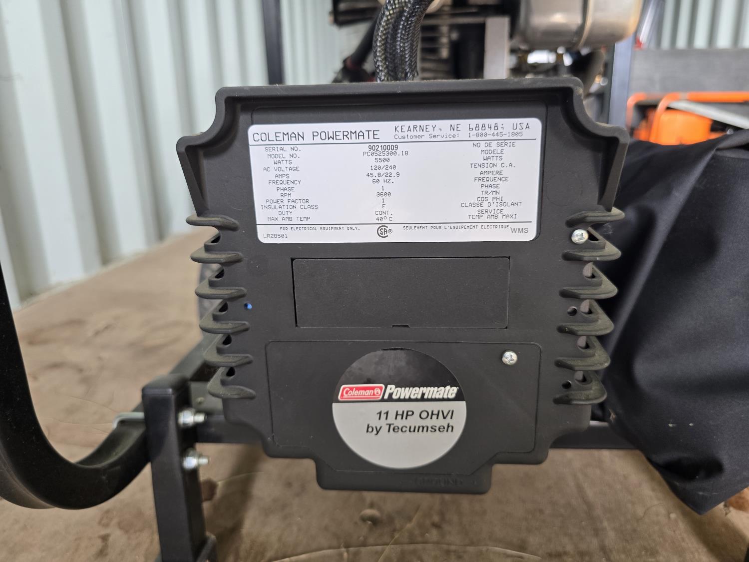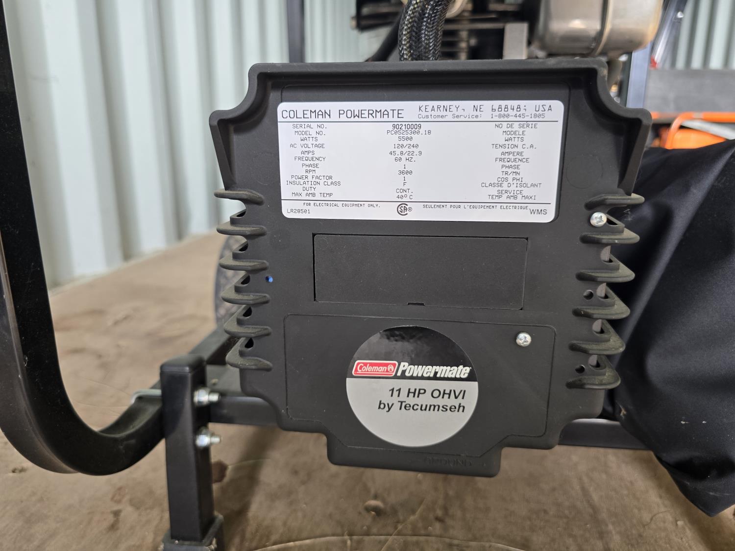 11 HP Tecumseh engine, 120/240v single phase, 6875w max output, 5500w rated output.