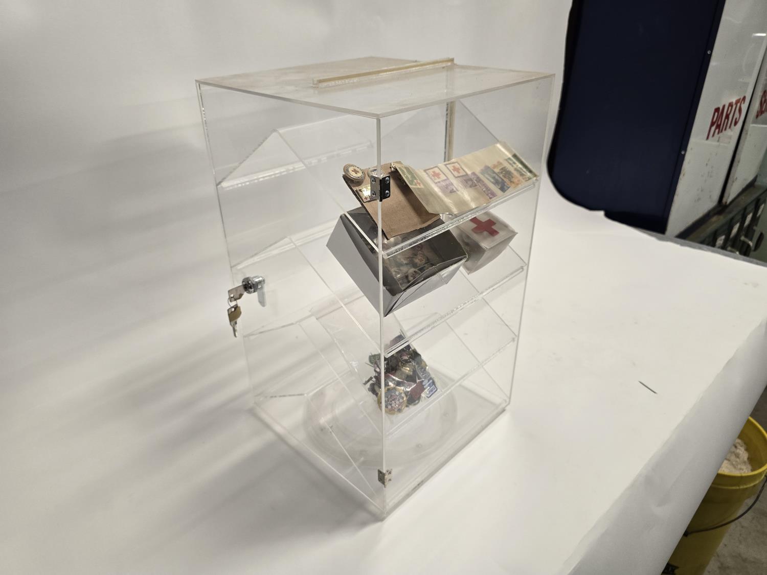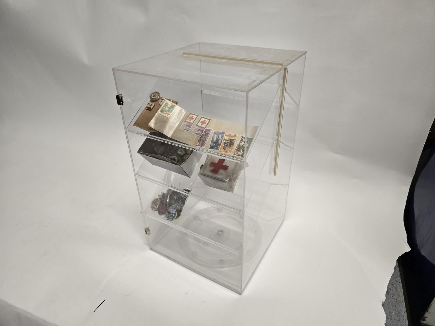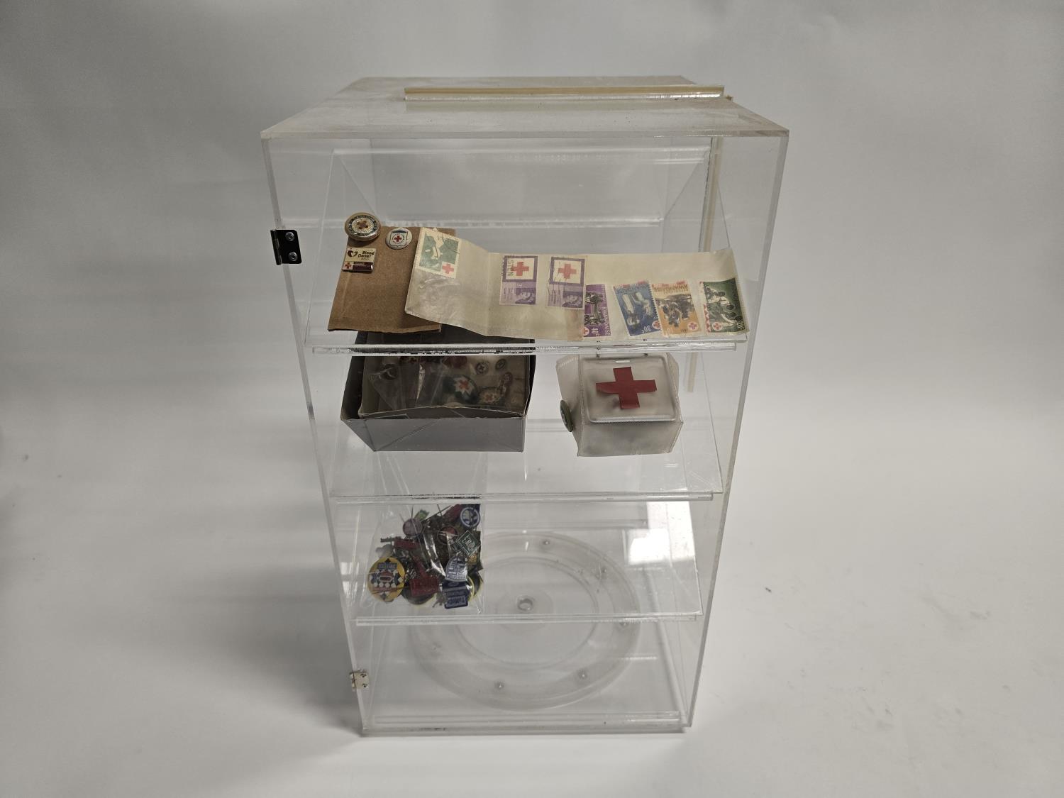 2423 19 Inch Rotating Display Case w/ Misc Red Cross Collectibles