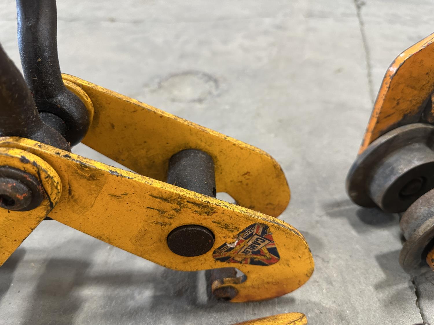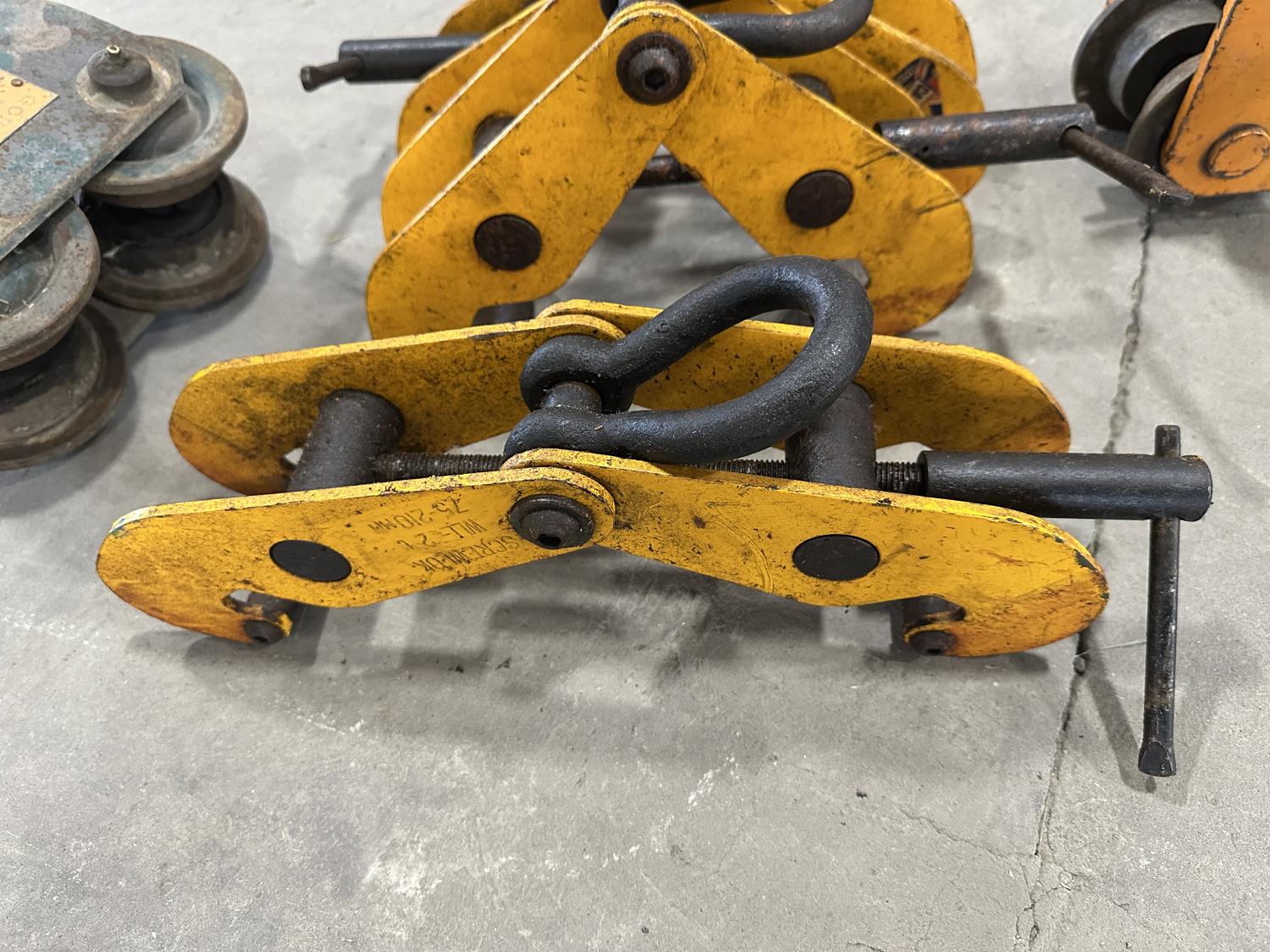 1208 (3) Beam Clamps and (3) 1 Ton Rollers