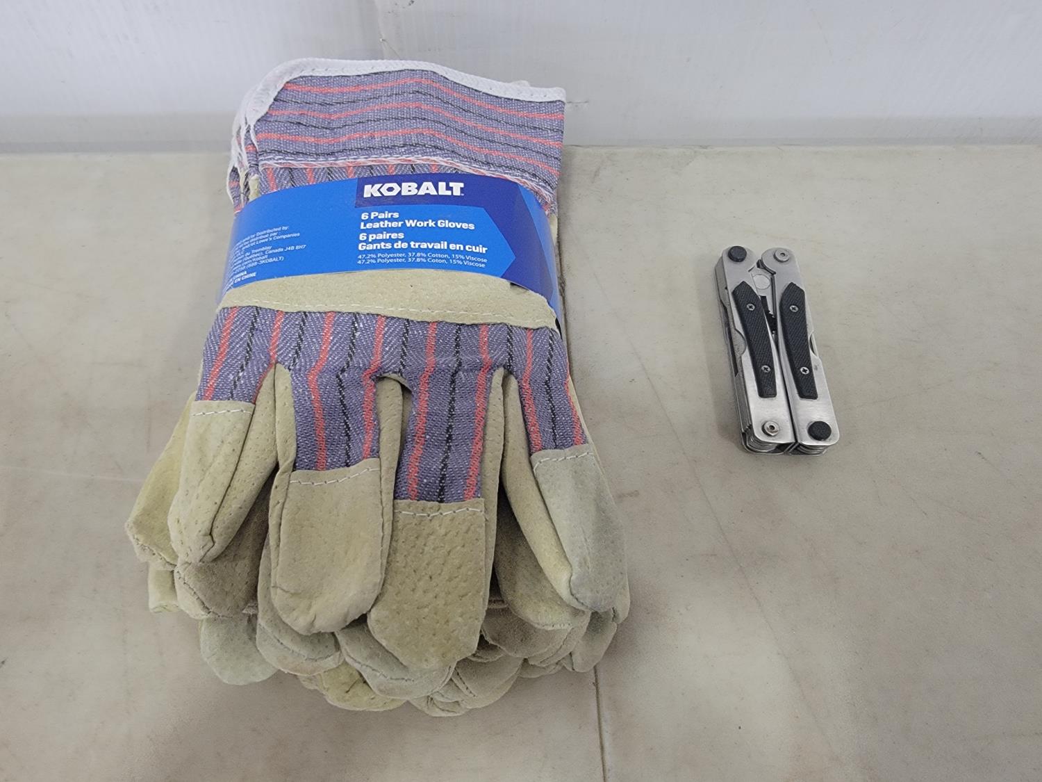 1512 Folding Multi-Tool and (6) Pairs of Kobalt Leather Work Gloves - Size Large (Unused)