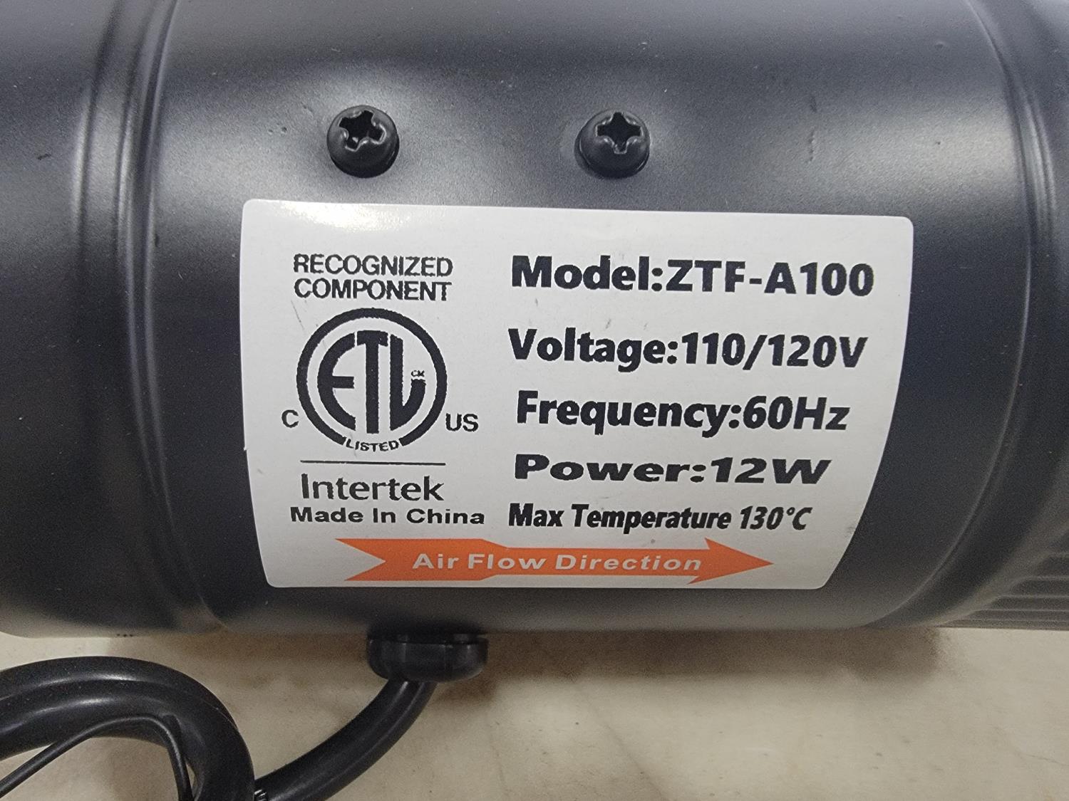 1472 Intertek ZTF-A100 Inline Duct Fan