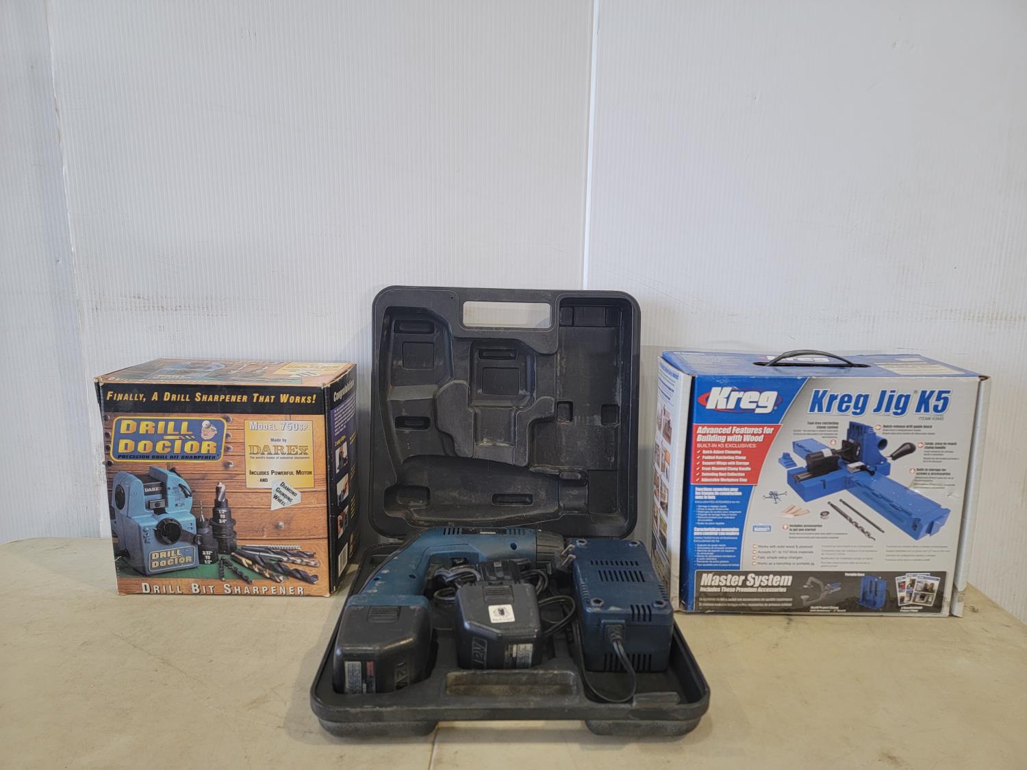 1138 Kreg Jig K5, Drill Doctor Drill Bit Sharpener and Talon 12V Hammer Driver Drill
