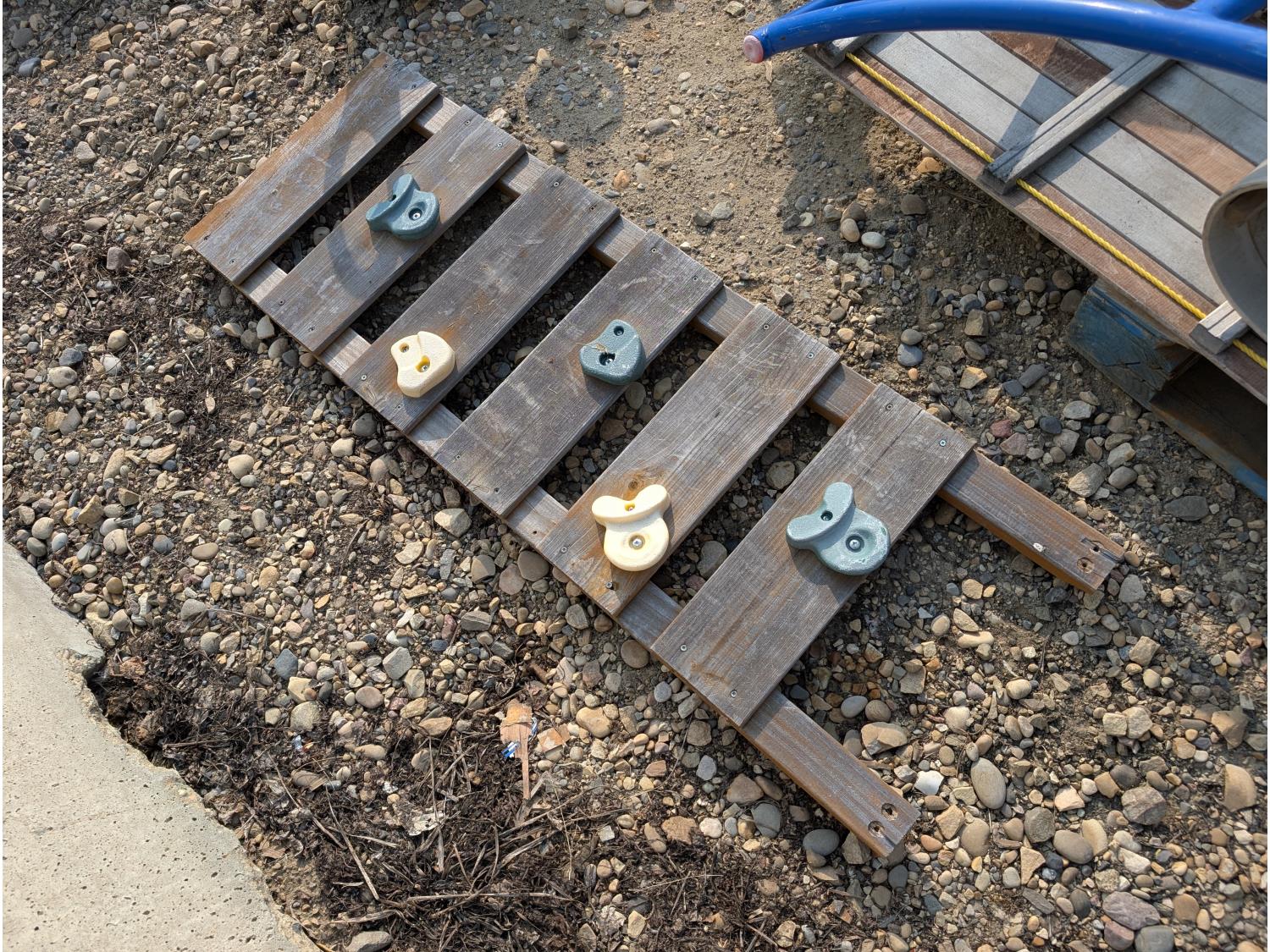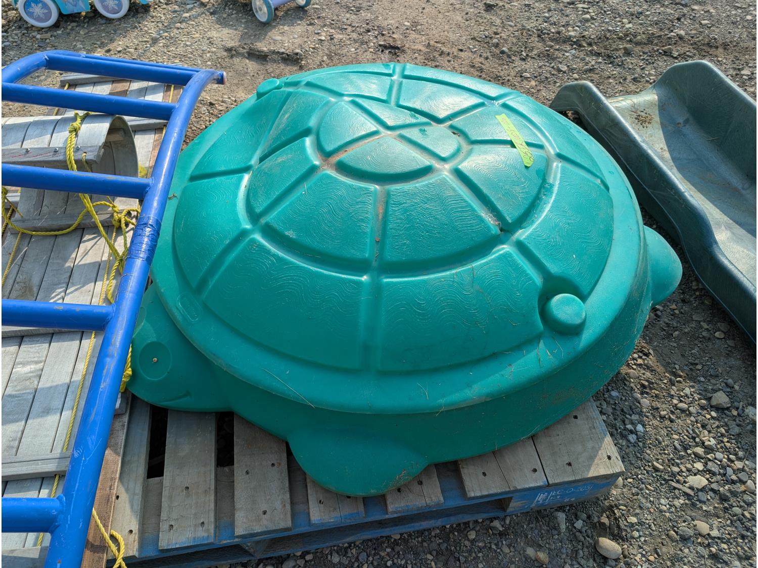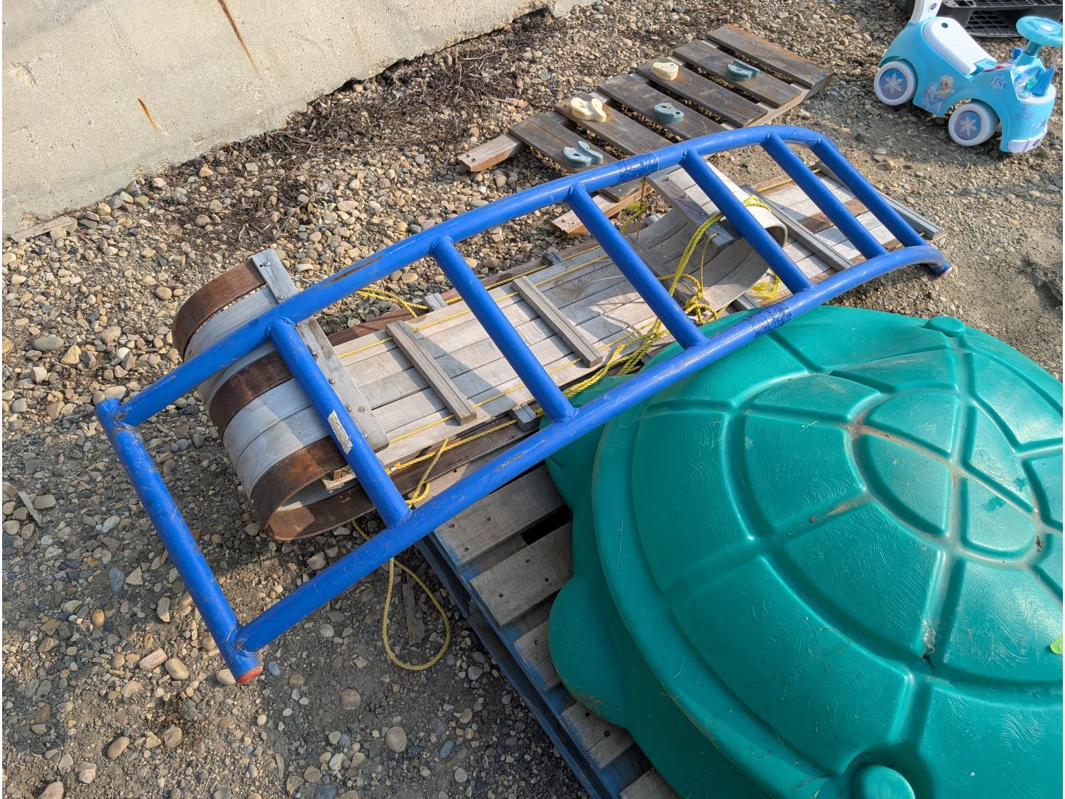 (2) slides, seesaw, climbing wall, turtle sandbox, (2) wooden toboggans