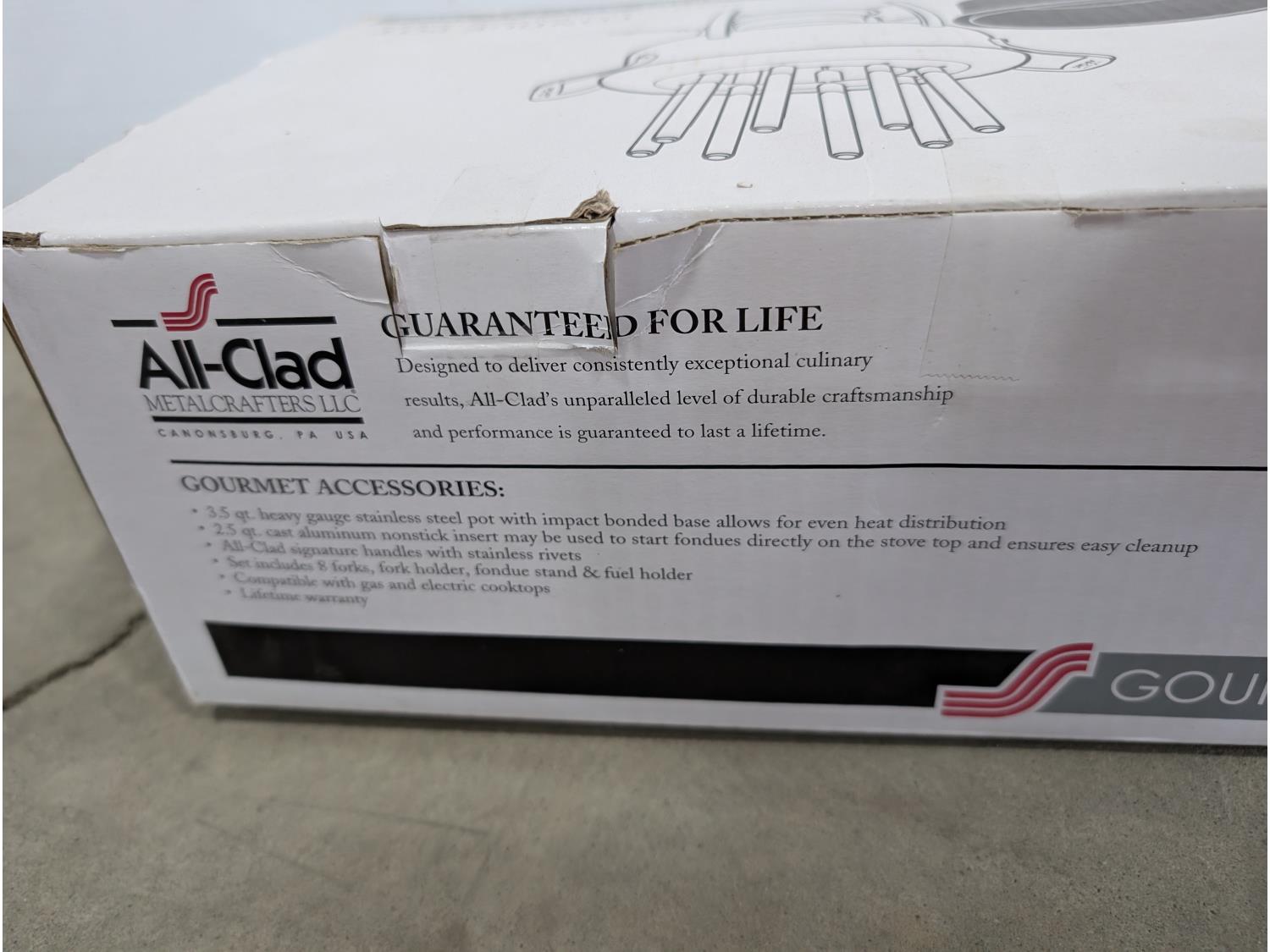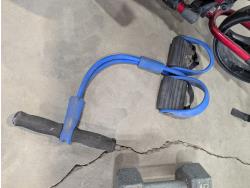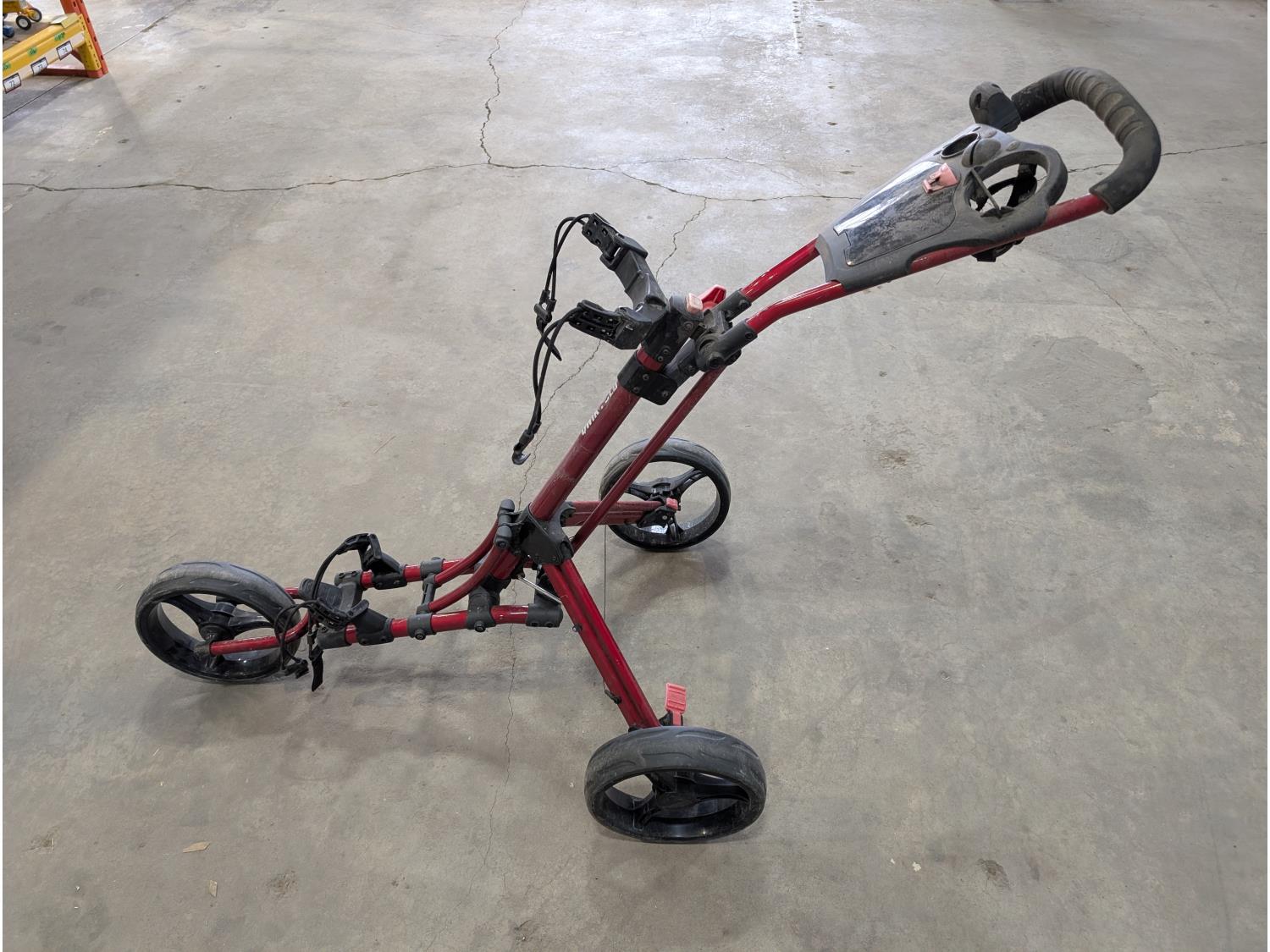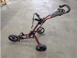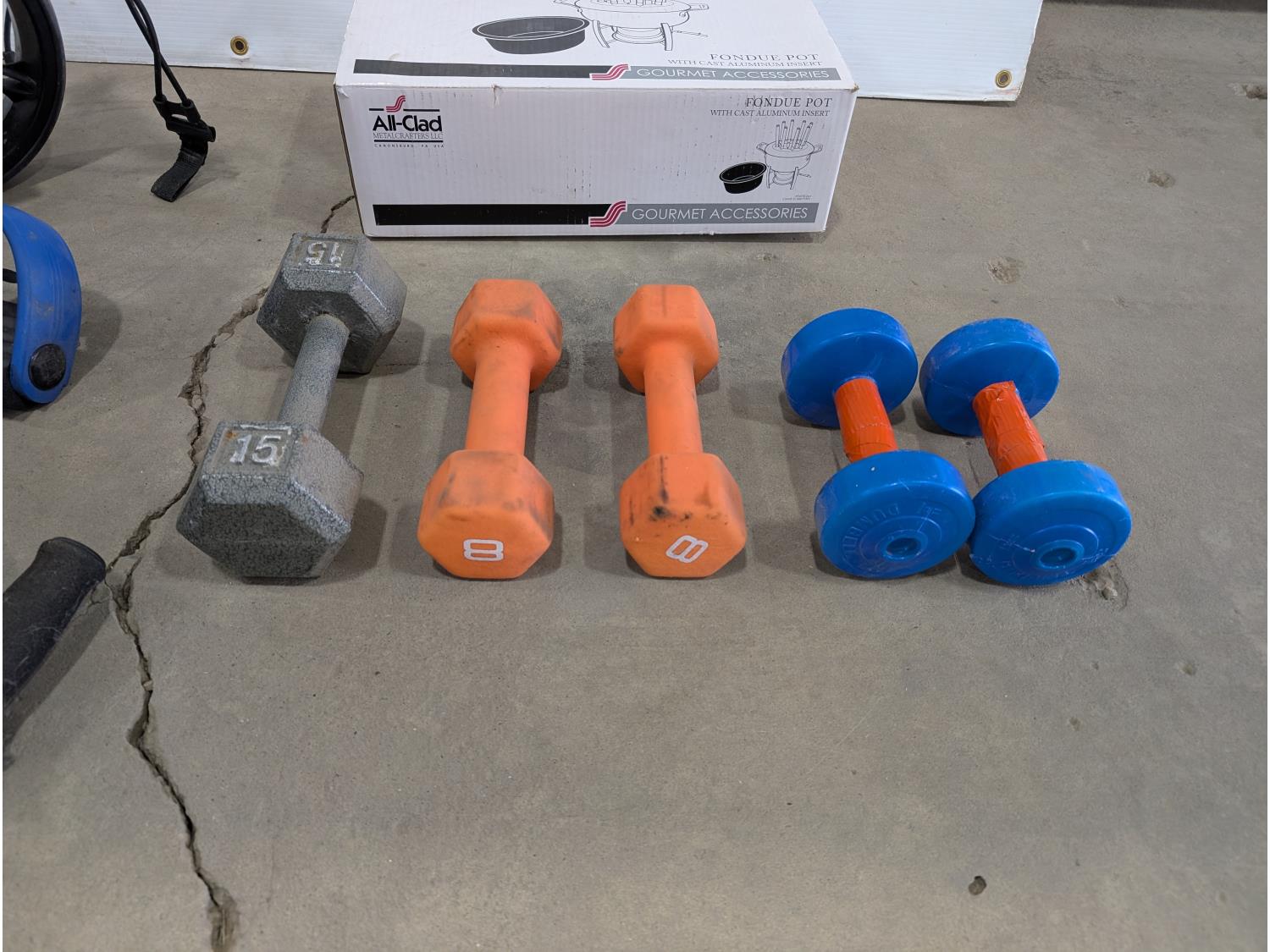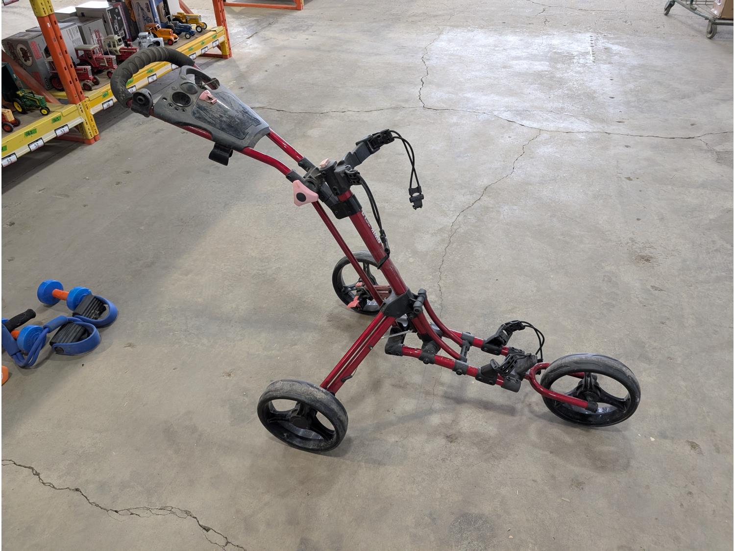 3 wheeled collapsible golf bag cart, fondue set (unused), (5) barbells