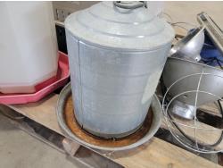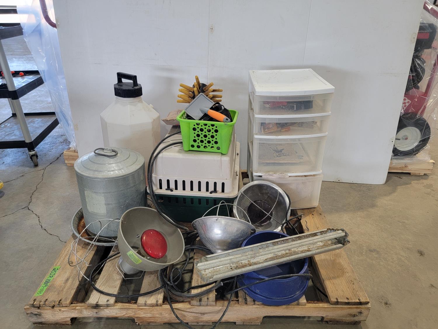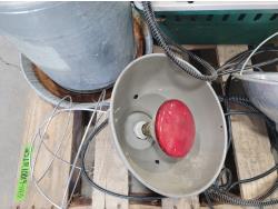Poly pet crate 16 inch x 24 inch x 15 inch, heated pet bowl, (3) heat lamps, plastic chicken feeder, metal chicken waterer, metal chicken tray feeder