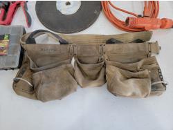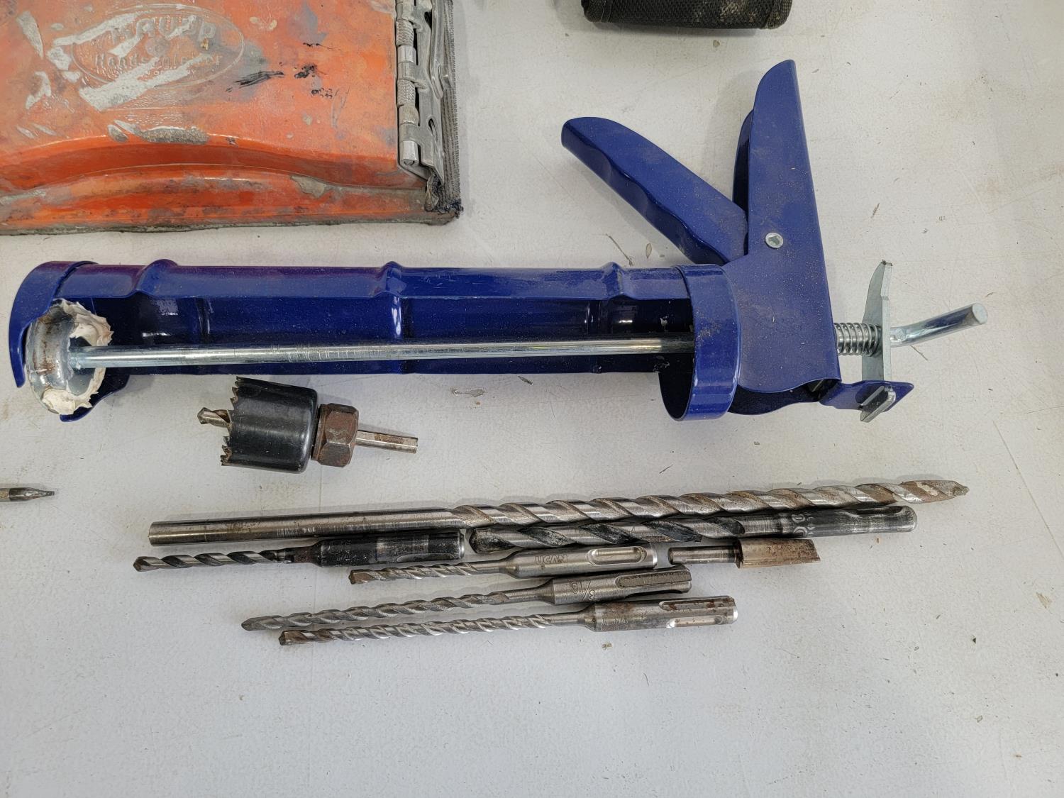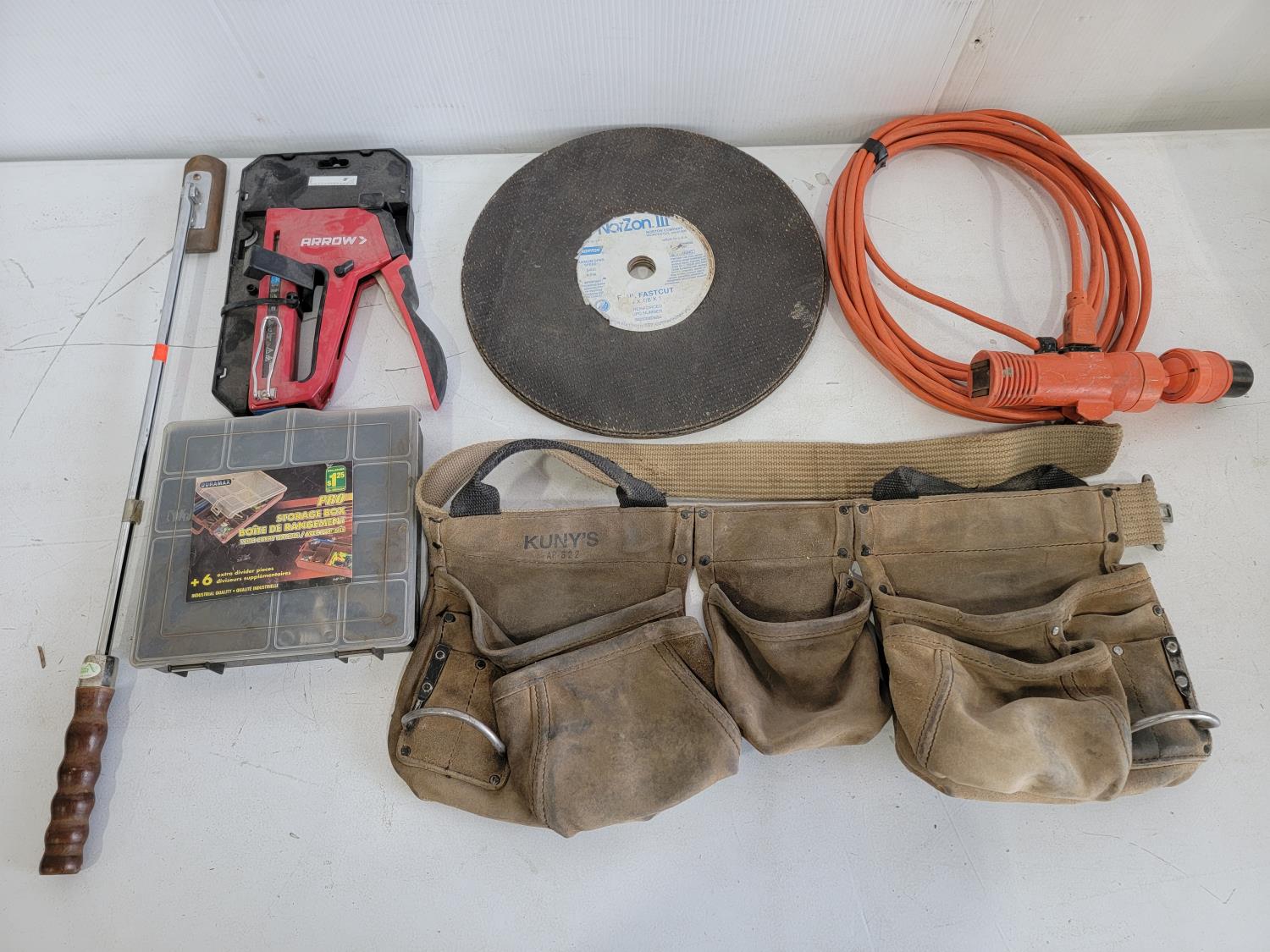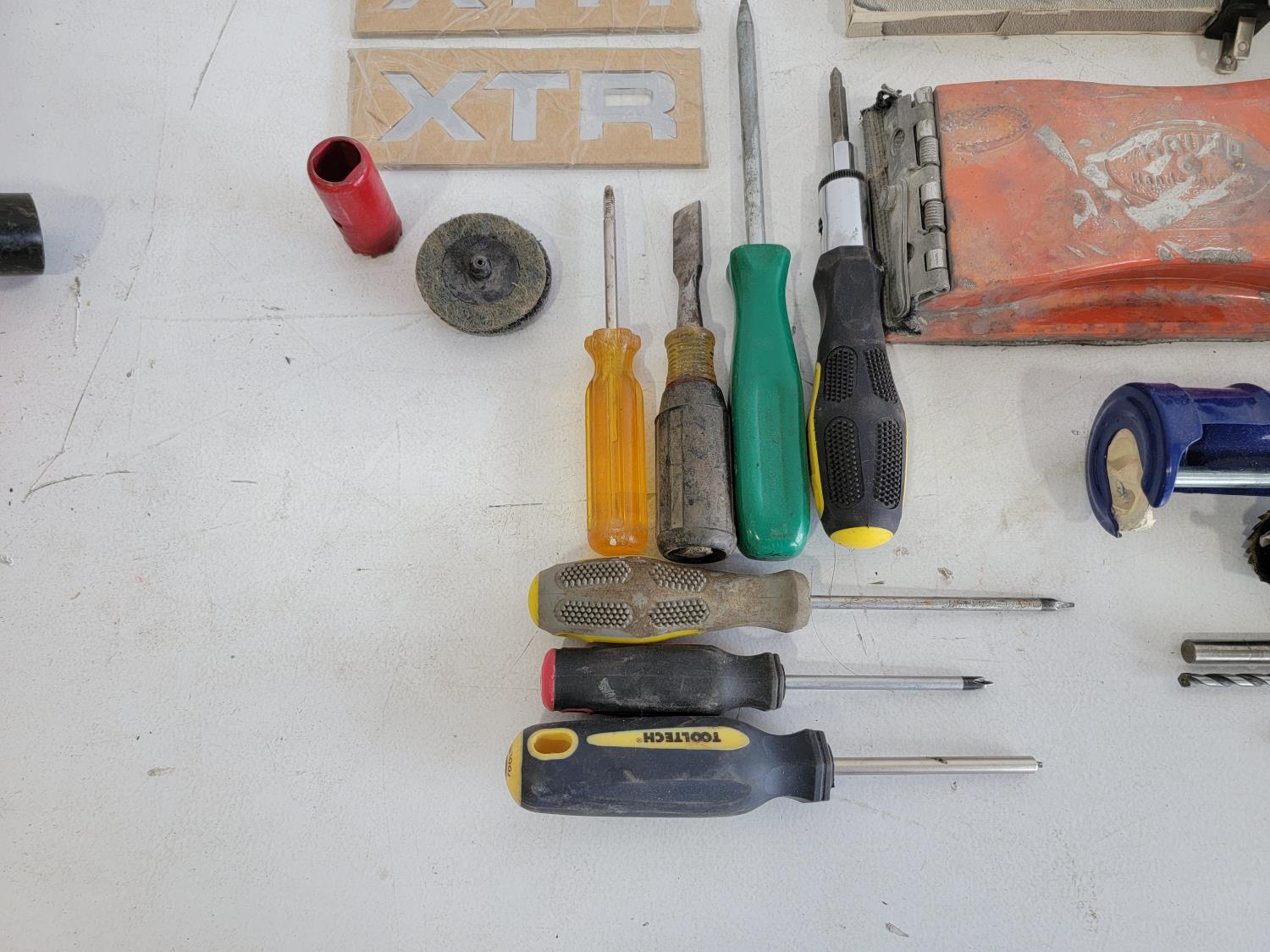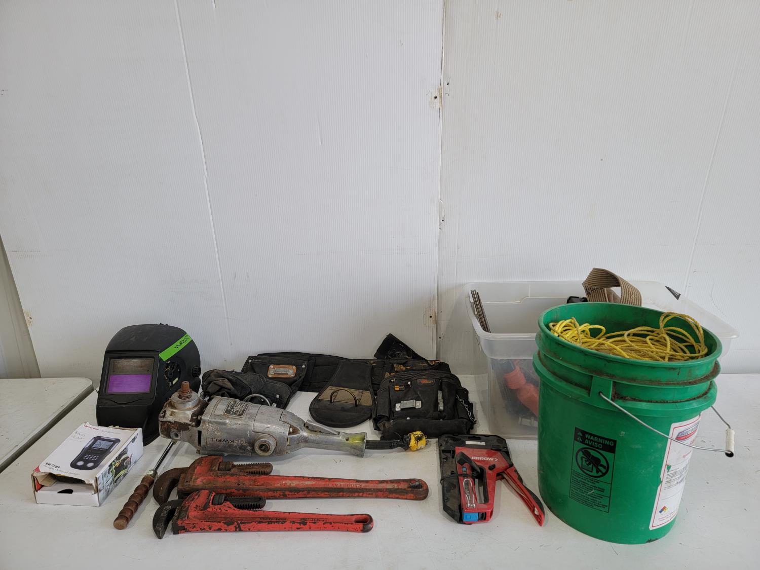 Welding helmet, rope, stapler, pipe wrenches, Honeywell gas detector, Kunys tool bags, screwdrivers, drill bits
