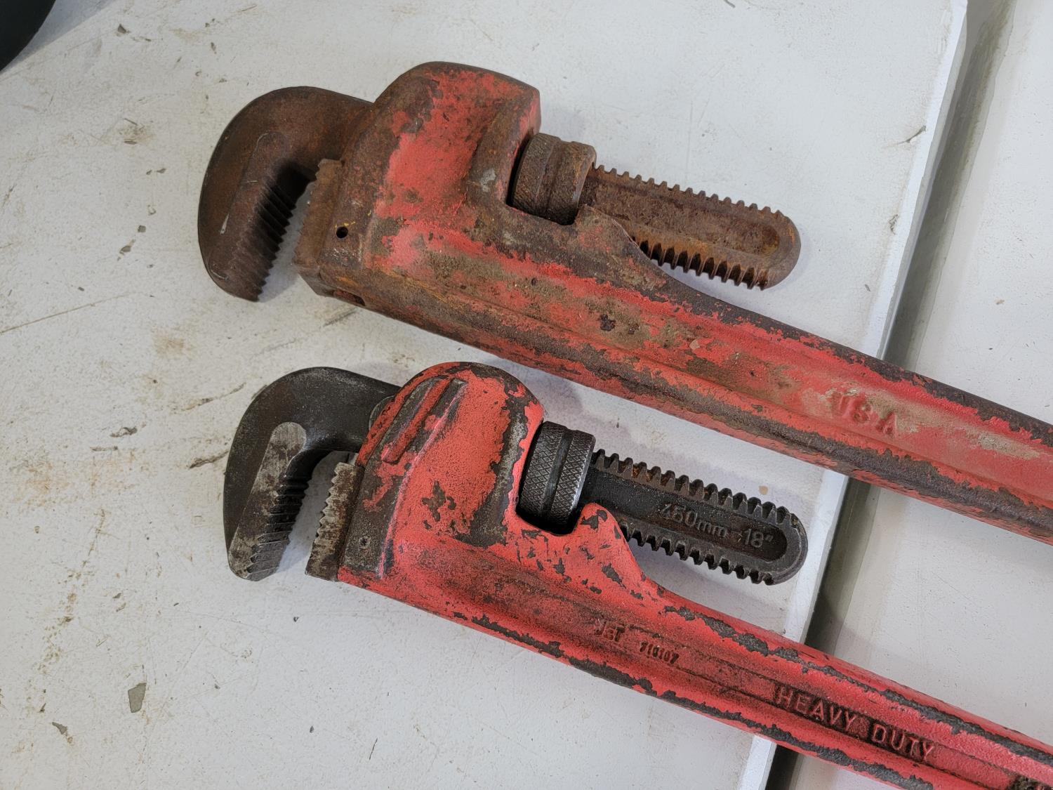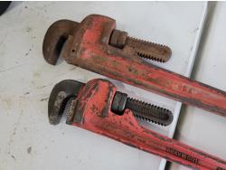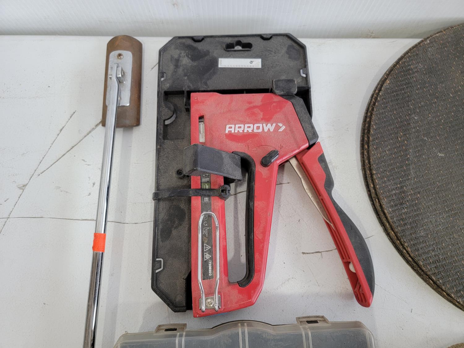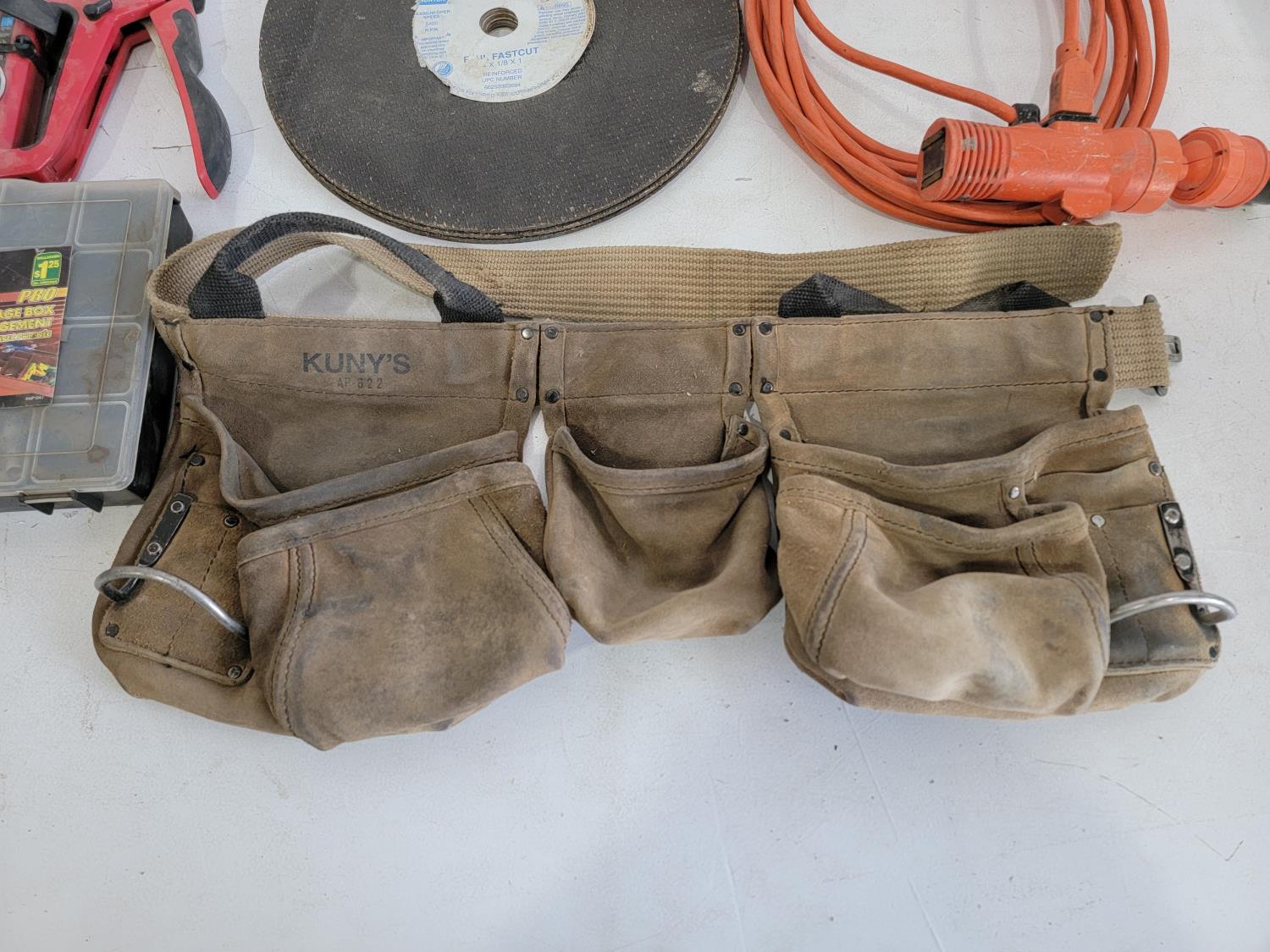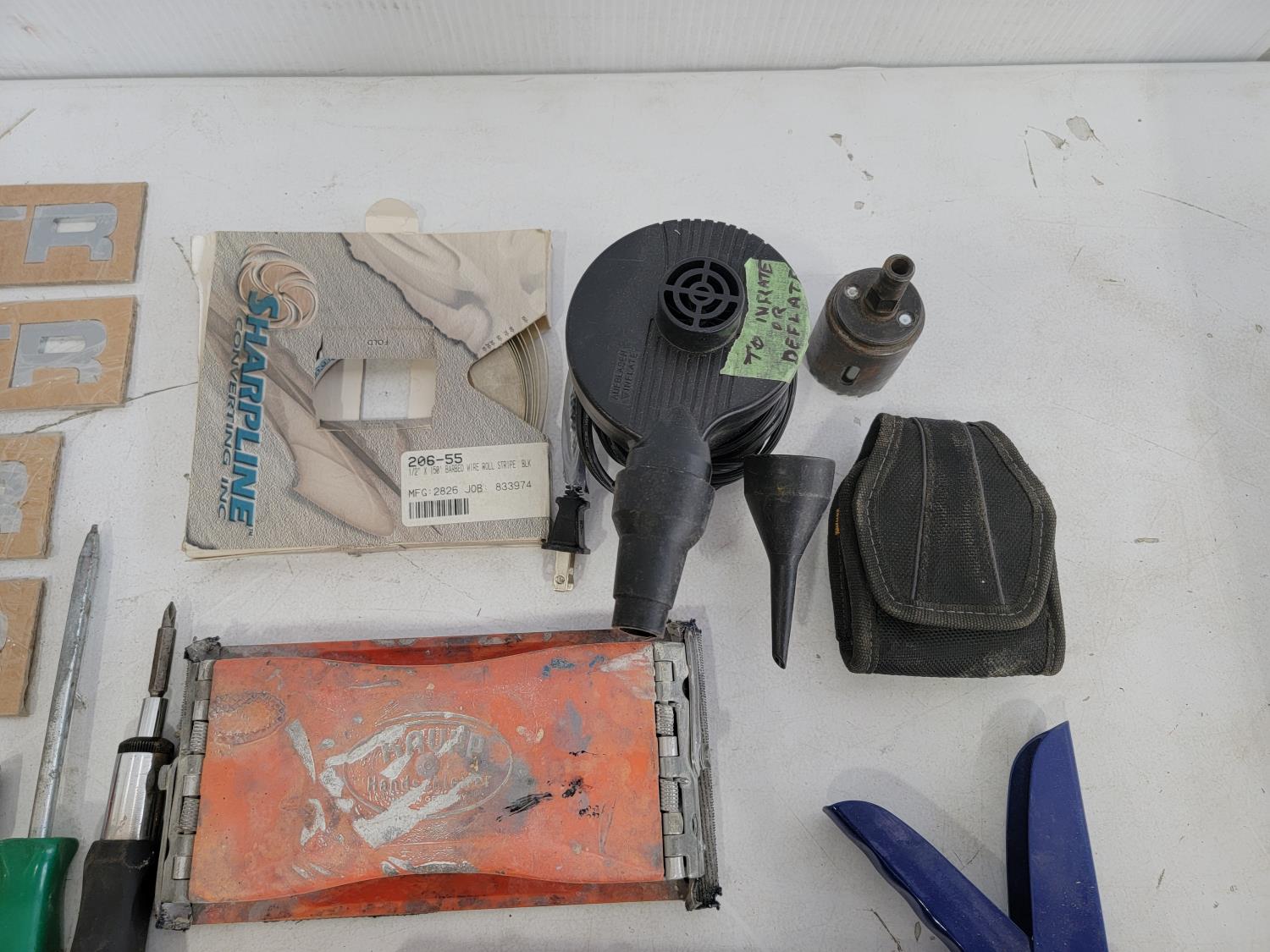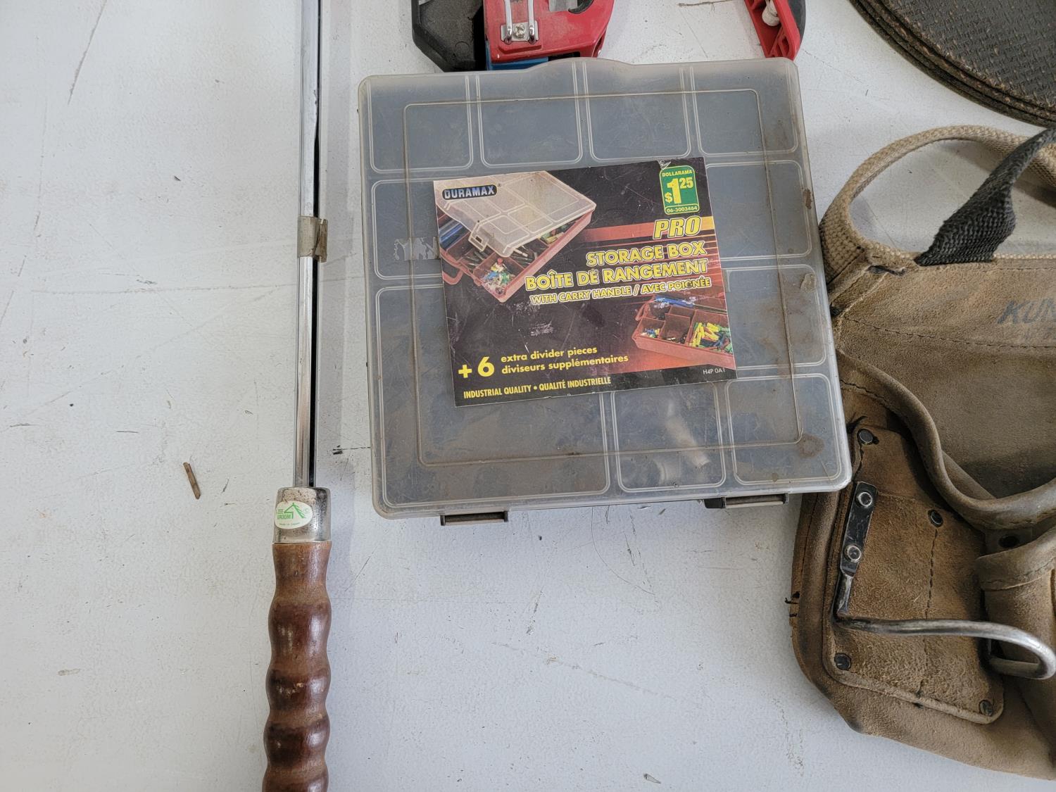 Welding helmet, rope, stapler, pipe wrenches, Honeywell gas detector, Kunys tool bags, screwdrivers, drill bits