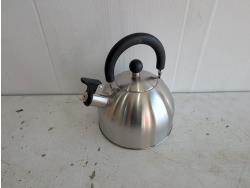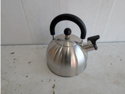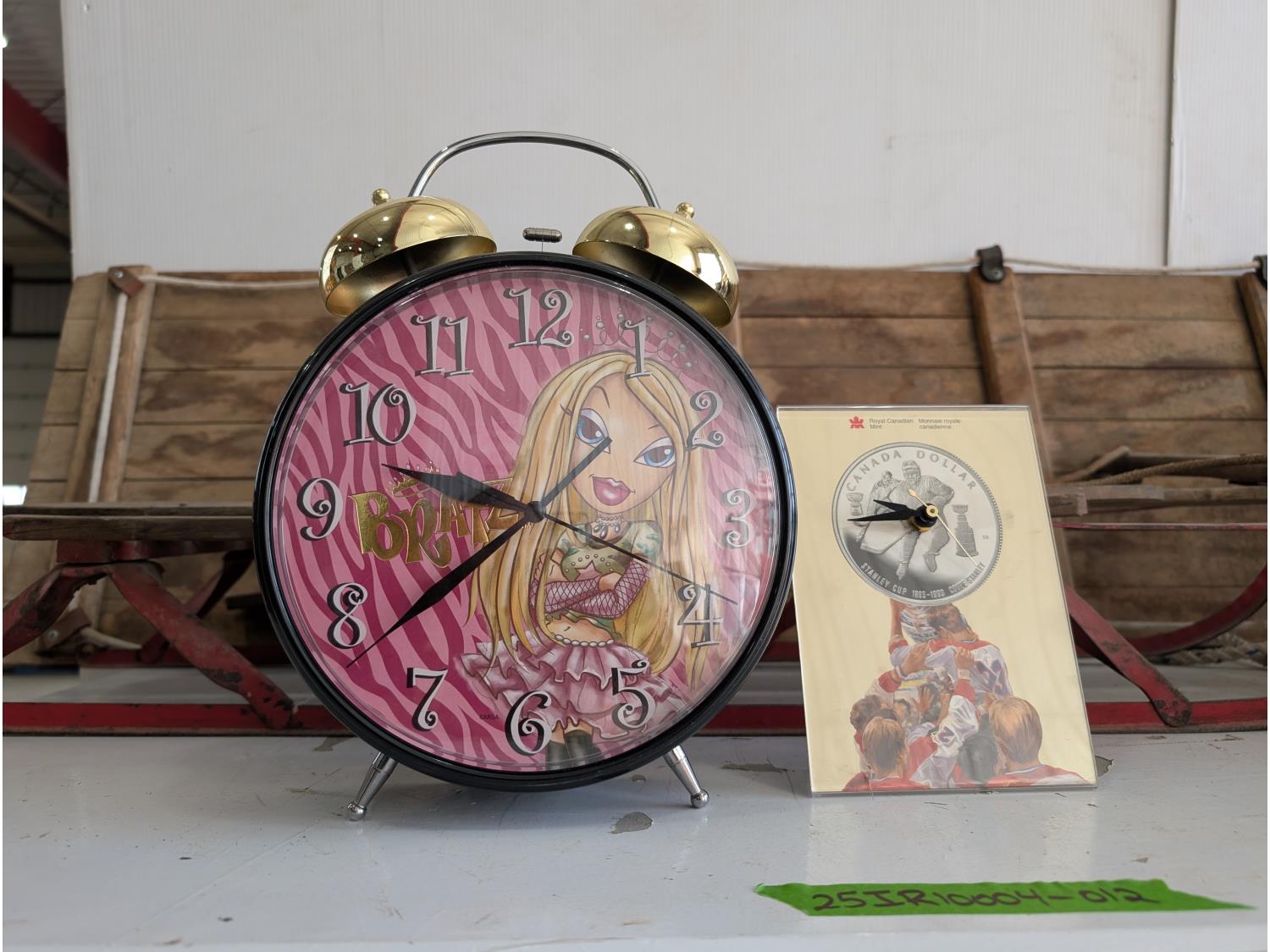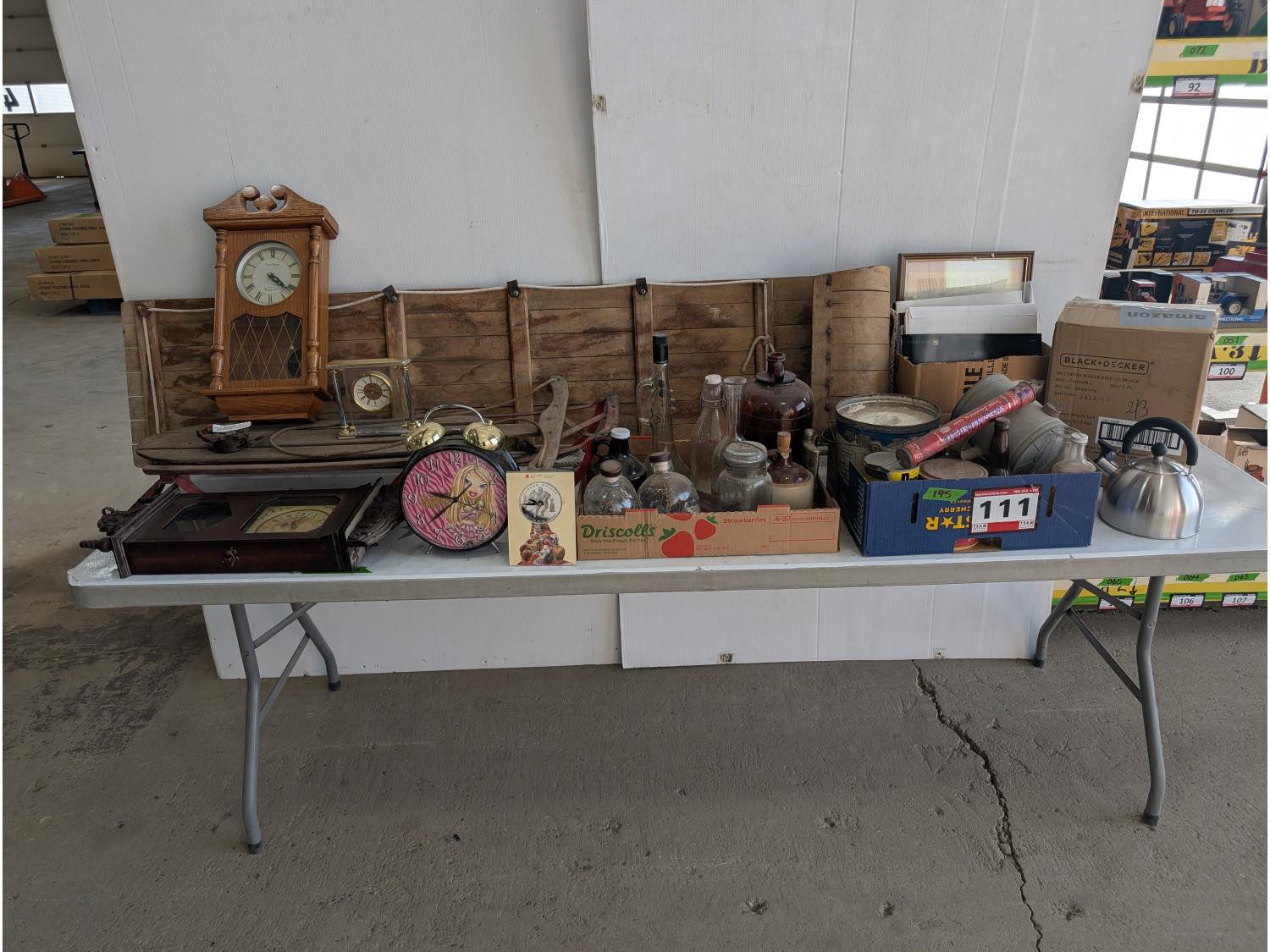 Kidisle 10 cup coffee maker, stainless steel kettle, (2) vintage sleds, antique bottles, assorted clocks, car and truck calendars, John Deere Calendars