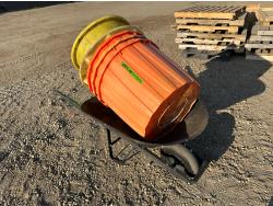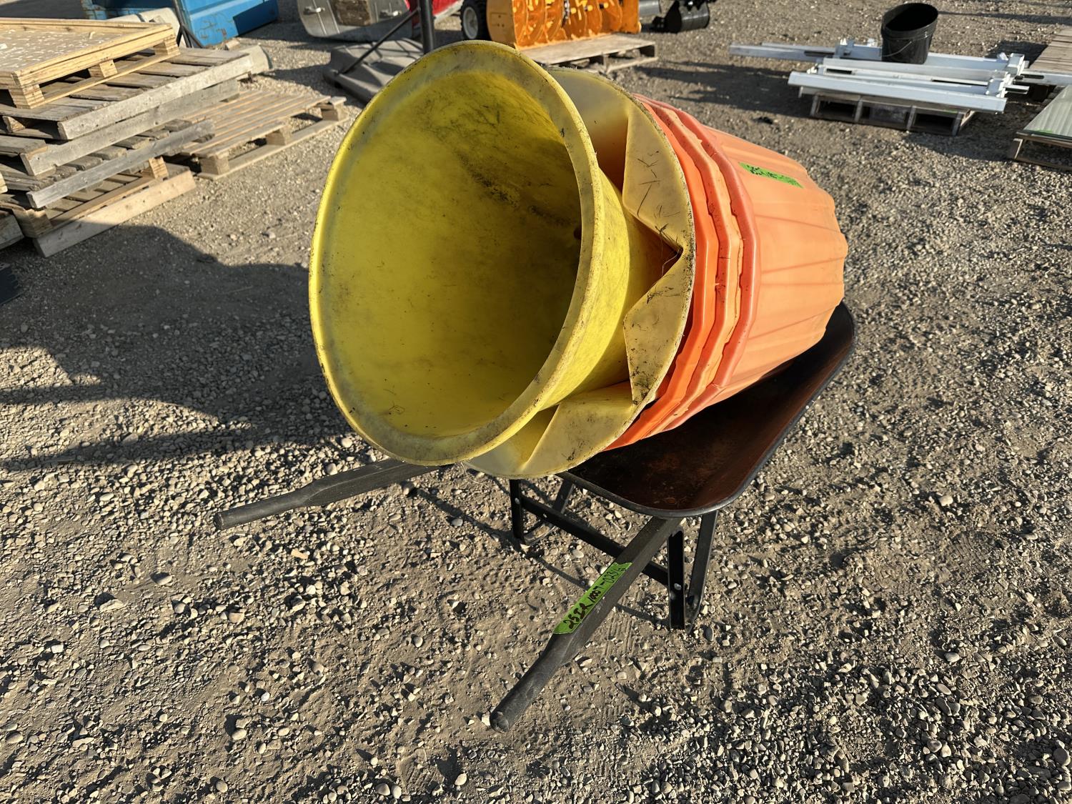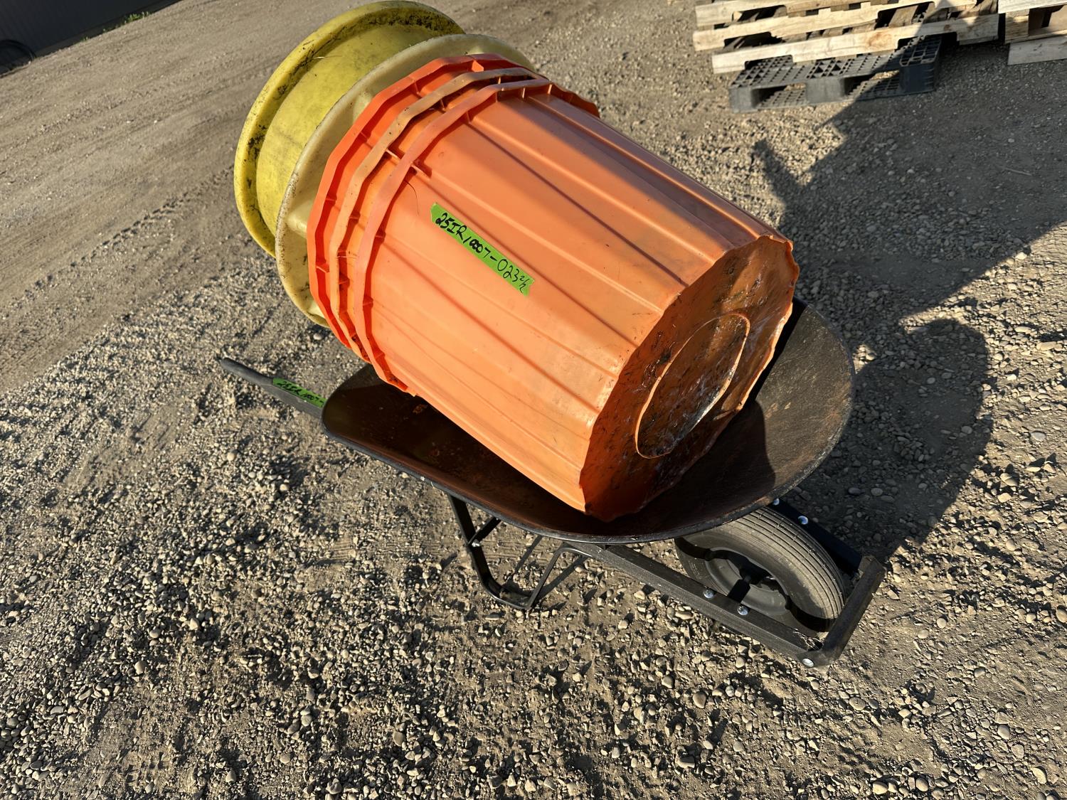 1613 Wheel Barrow, (2) Pipe Stands and (3) Poly Bins