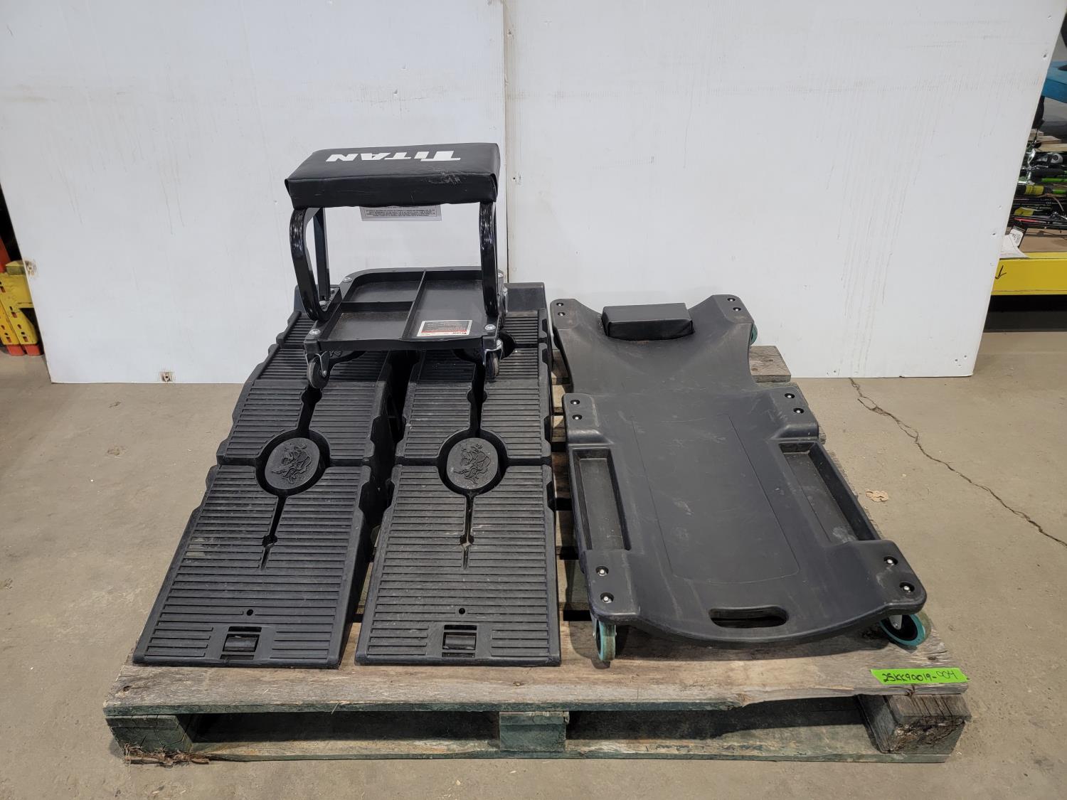 1301 (2) Poly Car Ramps, Mechanic's Creeper and Titan Roller Seat
