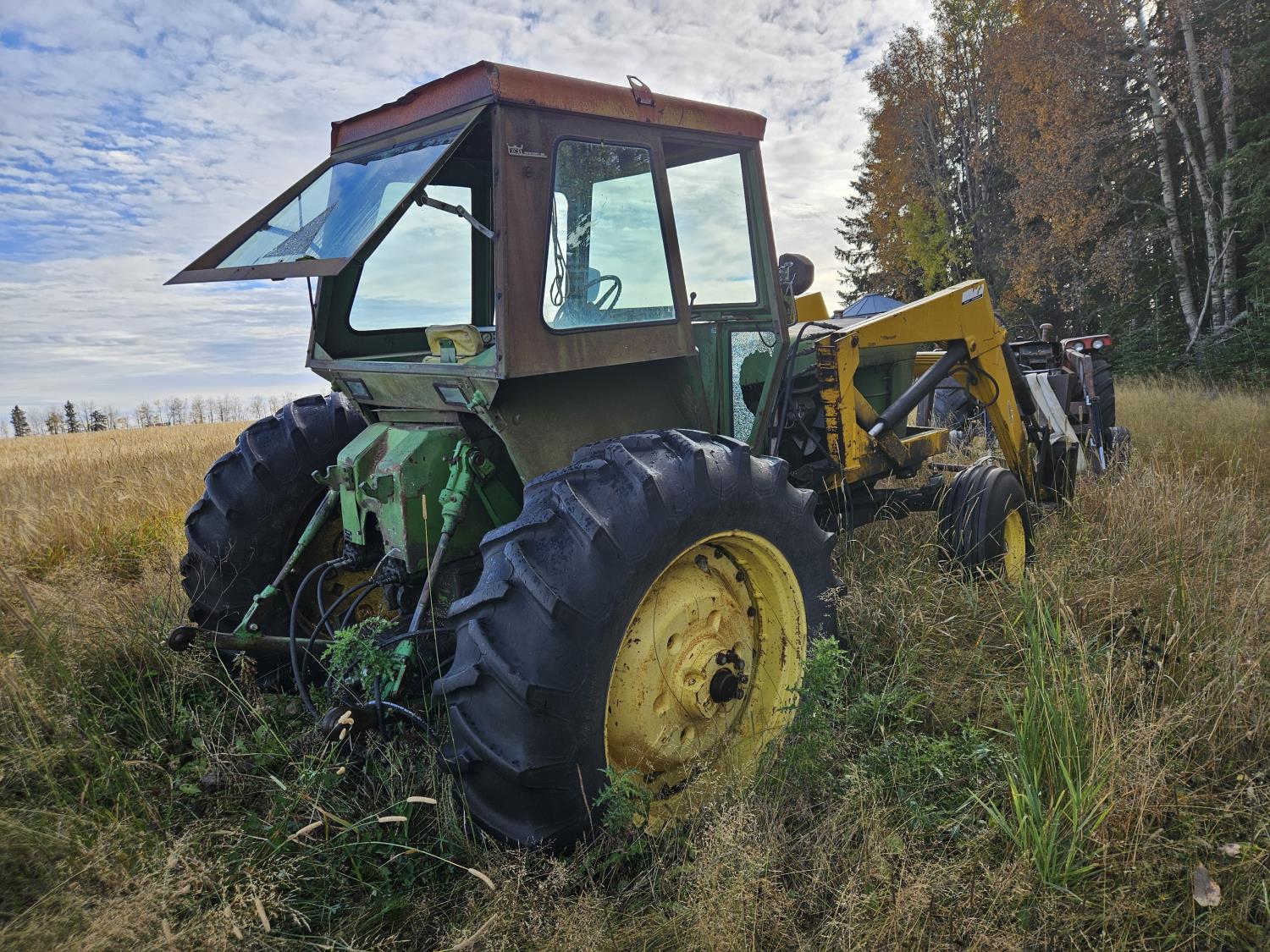 Loader, John Deere 6.6 L 6 cylinder diesel engine, 135 PTO HP, 8 speed partial synchro transmission, cab, 1000 PTO, 3 point hitch, 2 rear hydraulic outlets, 11.0-16 front tires, 20.8-38 rear tires