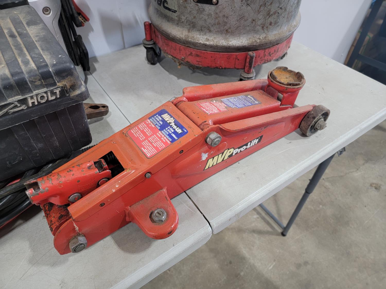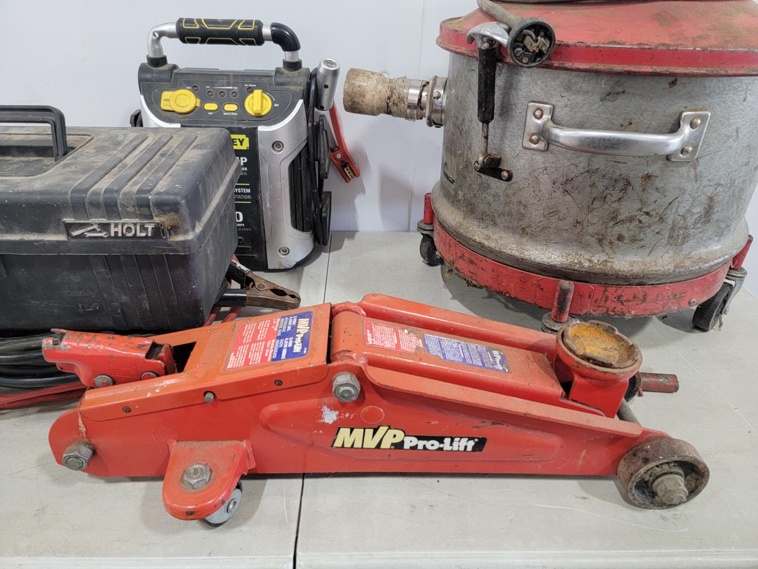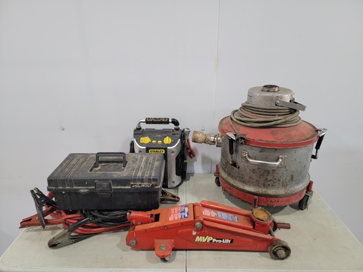 1342 Mastercraft Dynavac Vacuum, 2 Ton Floor Jack, Cable Tire Chains, Stanley Jump Start System and Booster Cables