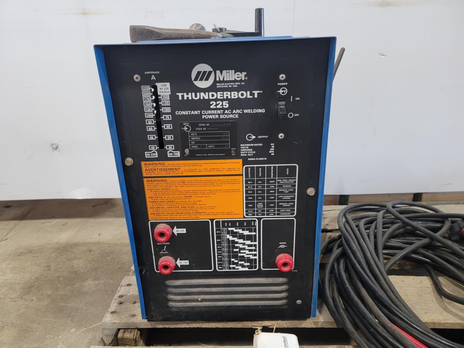 1292 Miller Thunderbolt 225 Welder, (2) Helmets, Electrodes, Tool Belt and Apron