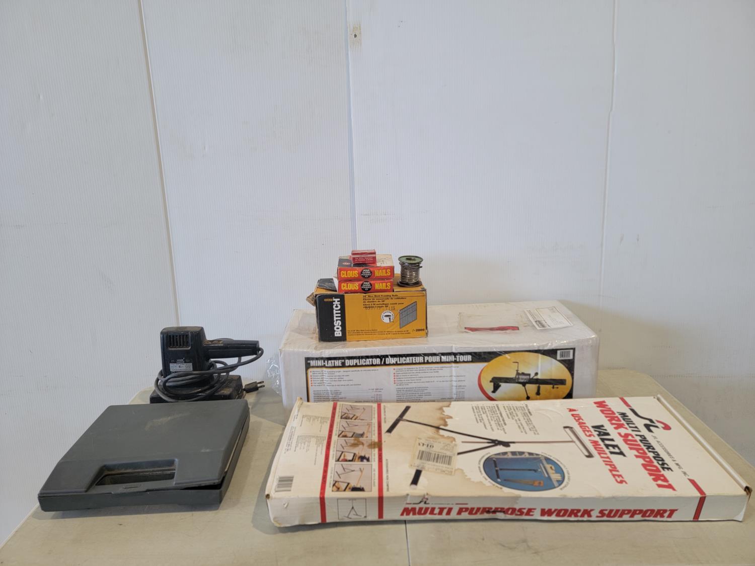 1361 Qty of Fasteners, Soldering Wire, Mini-Lathe Duplicator, Multi-Purpose Work Support Stand, Shopmate Sander and Soldering Gun
