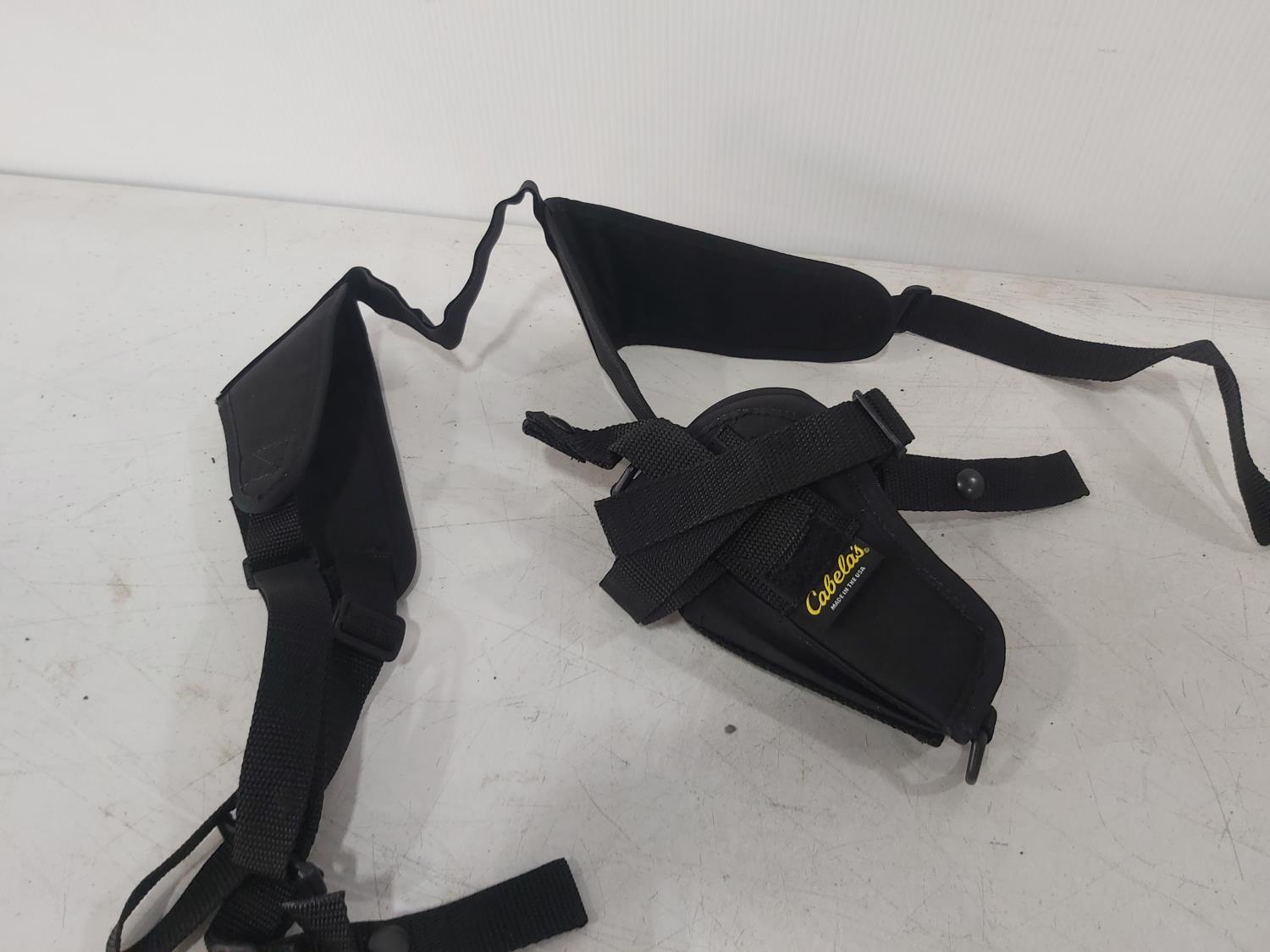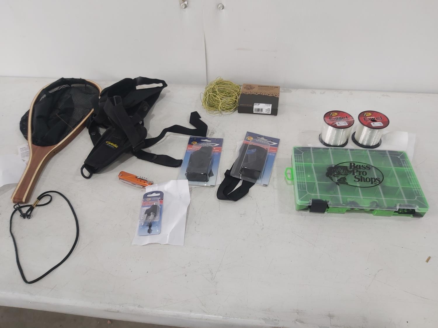 tackle organizer, (2) spools of 8 lb fishing line, fly line, (2) fender holder straps, shoulder holster, net, knife