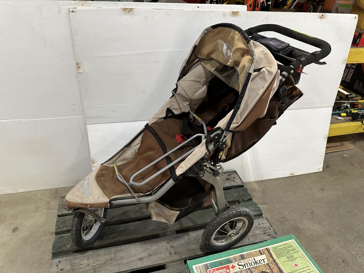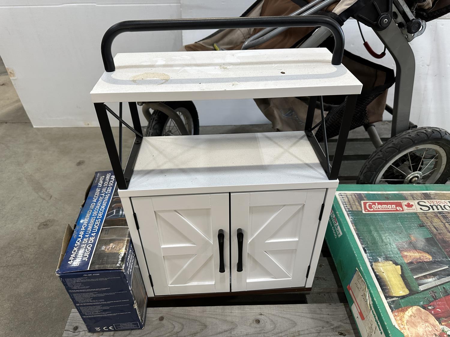Bob Revolution stroller, Coleman Versa smoker, solar LED accent lights, cabinet