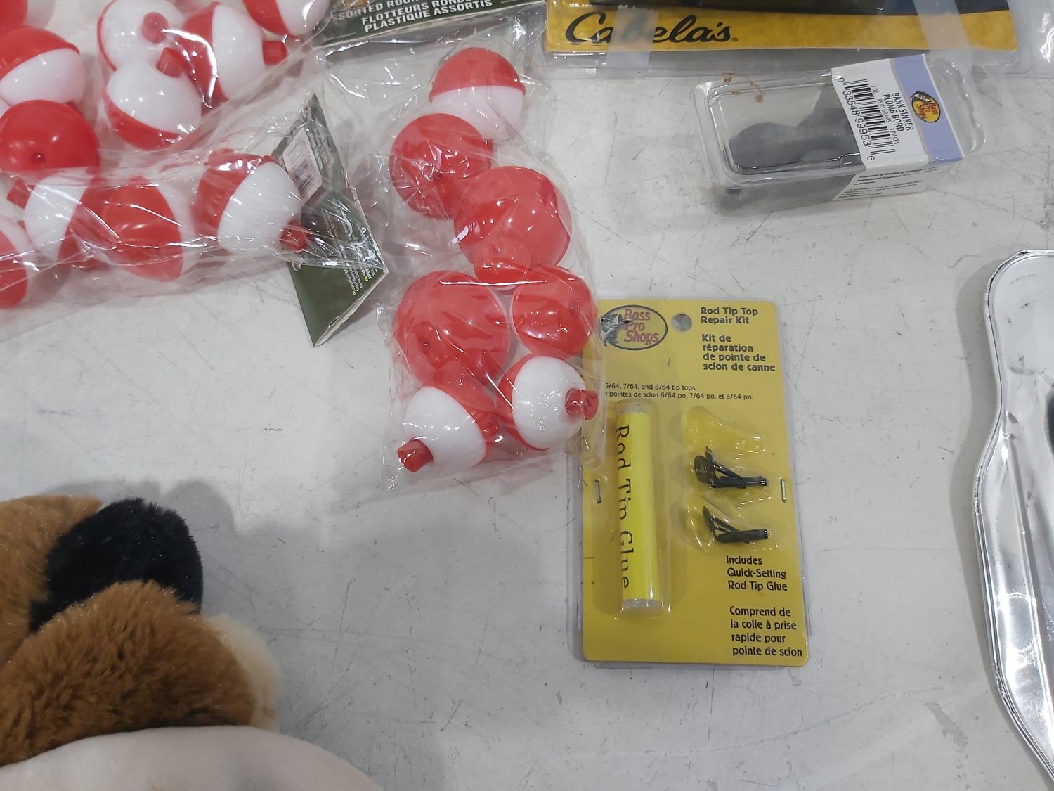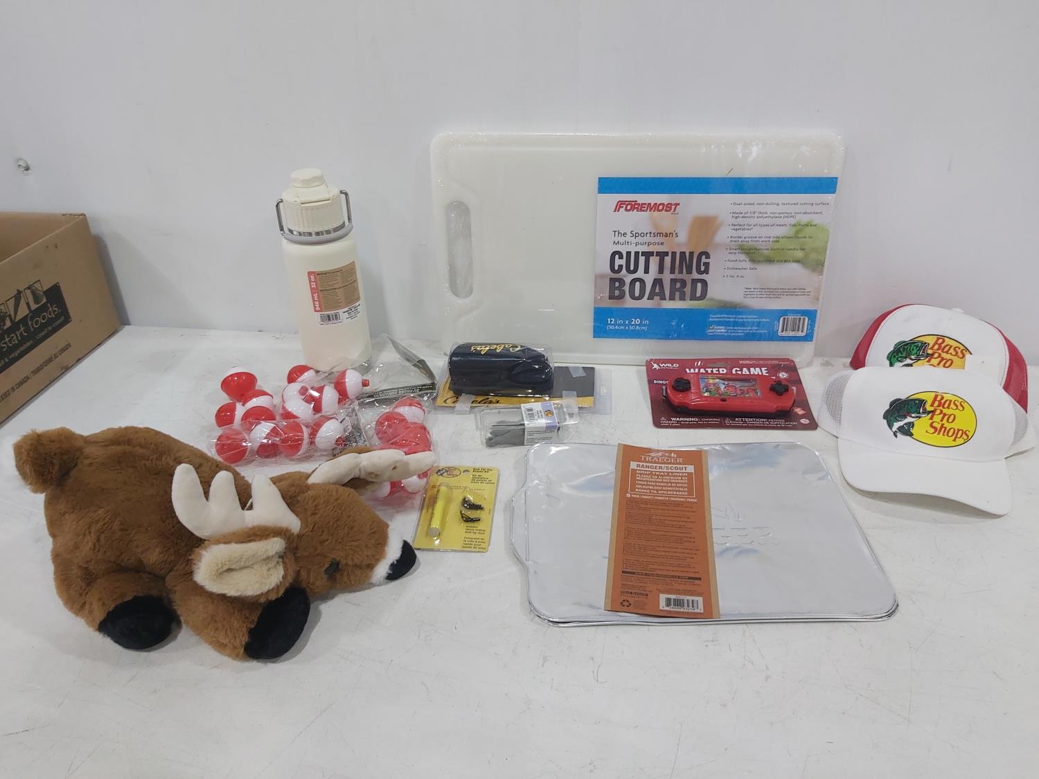 (2) hats, cutting board, water game, Traeger drip tray liners, fishing accessories, 32 oz water bottle, scope cover
