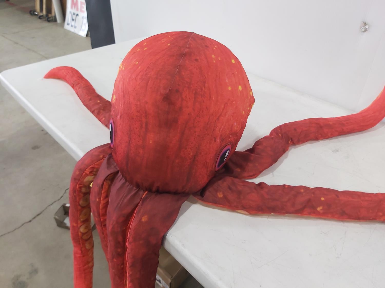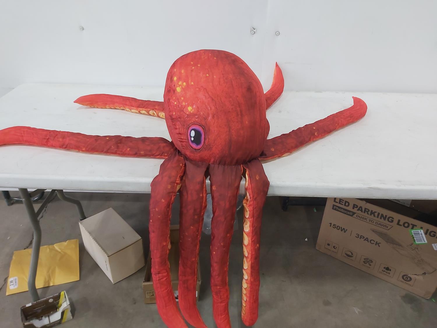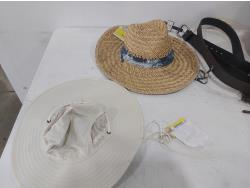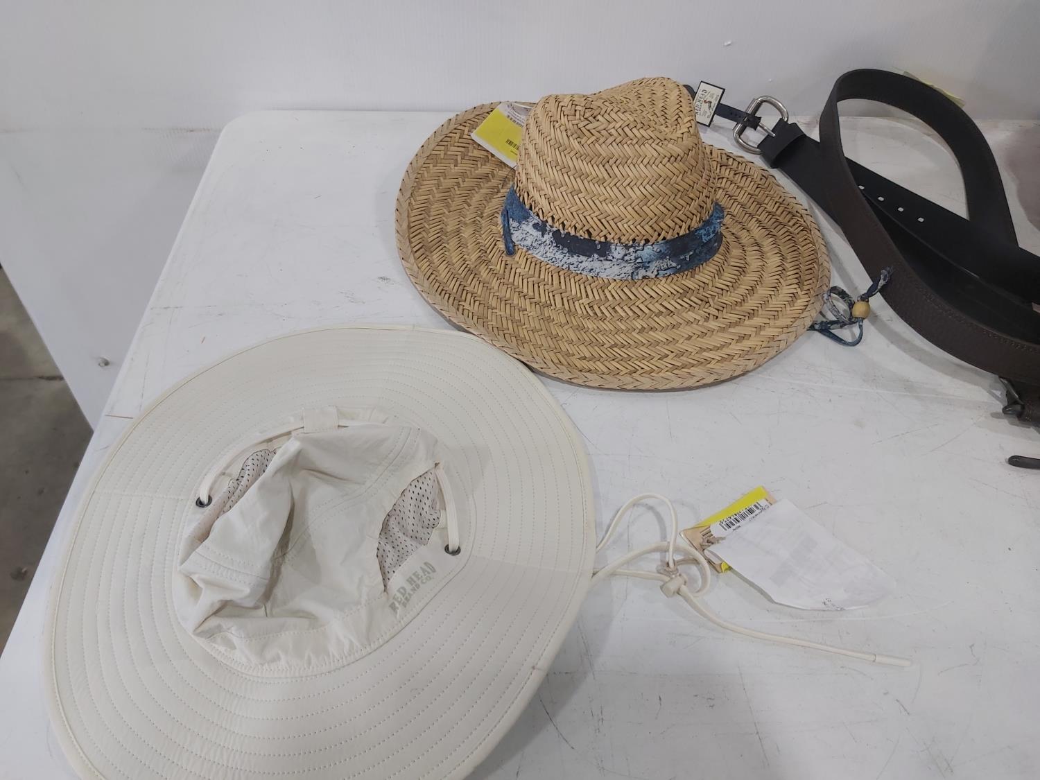 Octopus toy, (6) hats, electric knife replacement blade, (2) belts, fishing bobbers