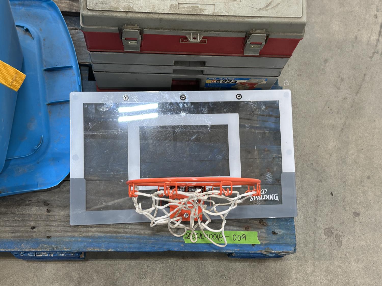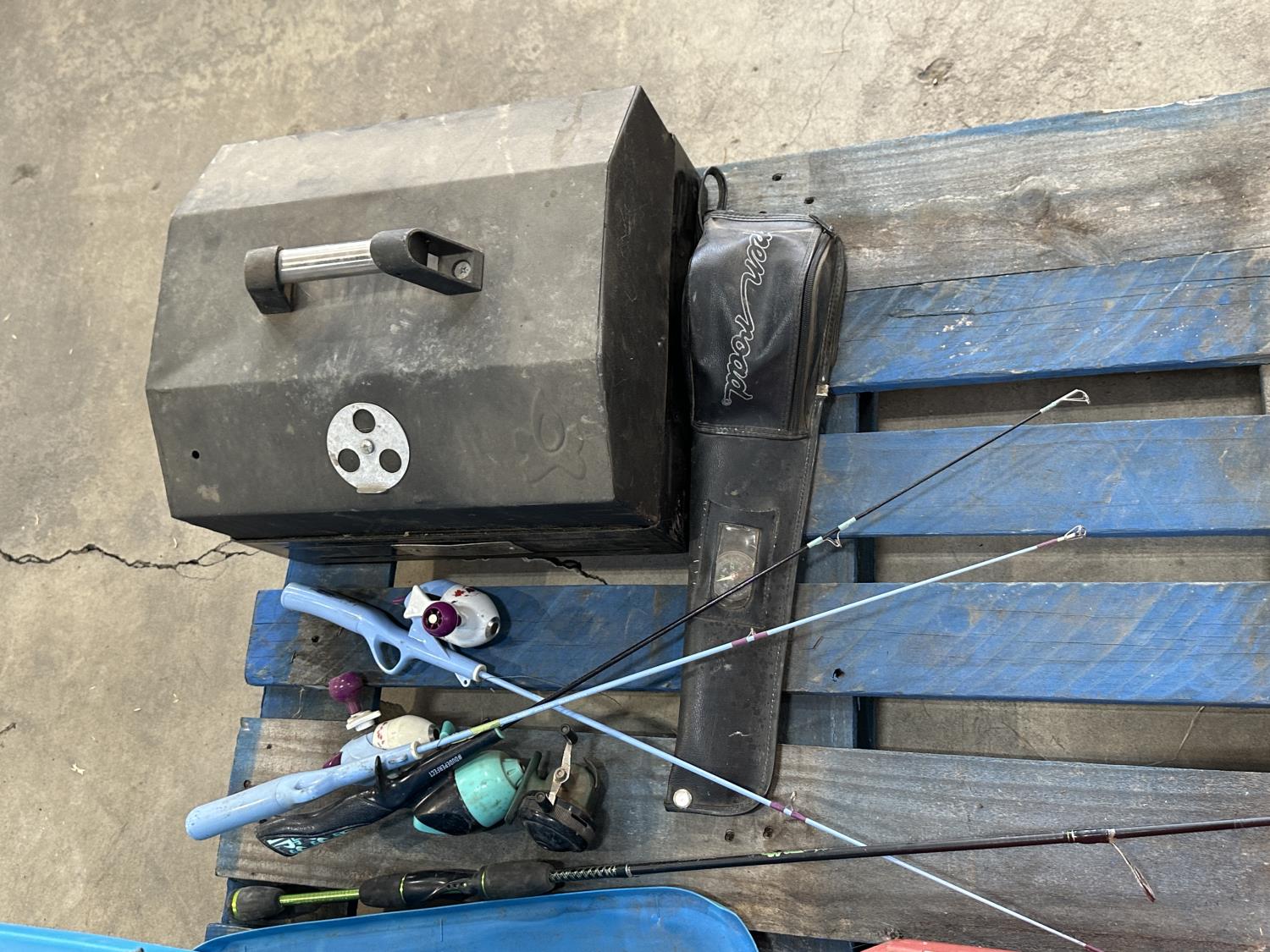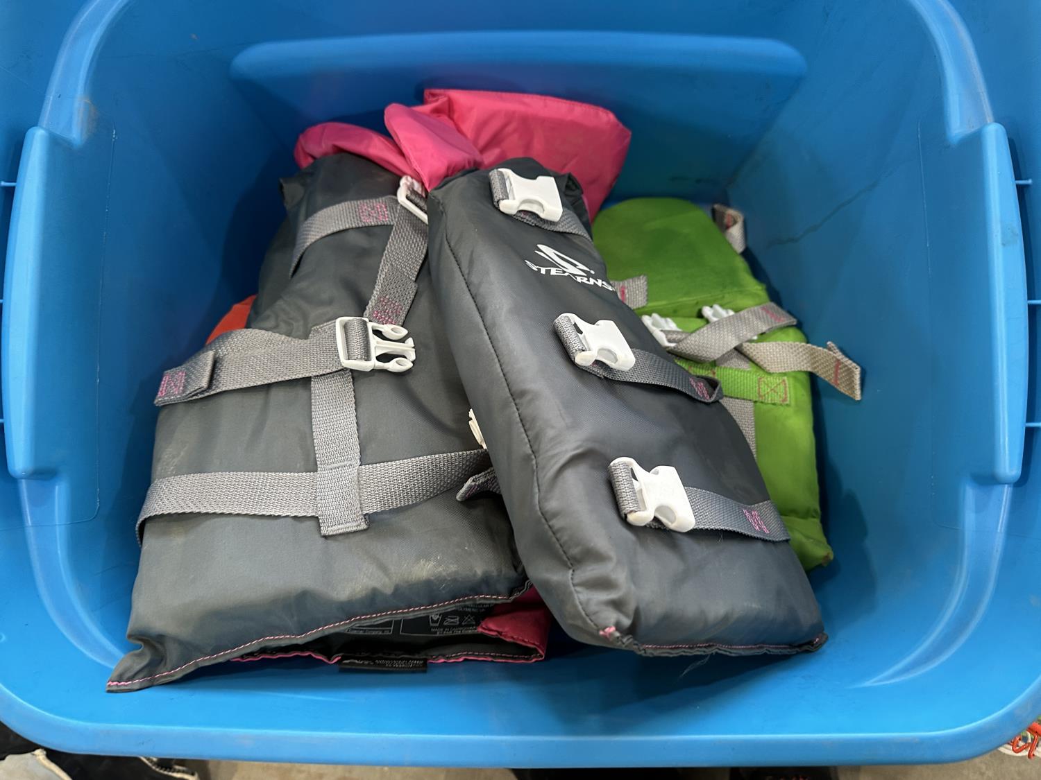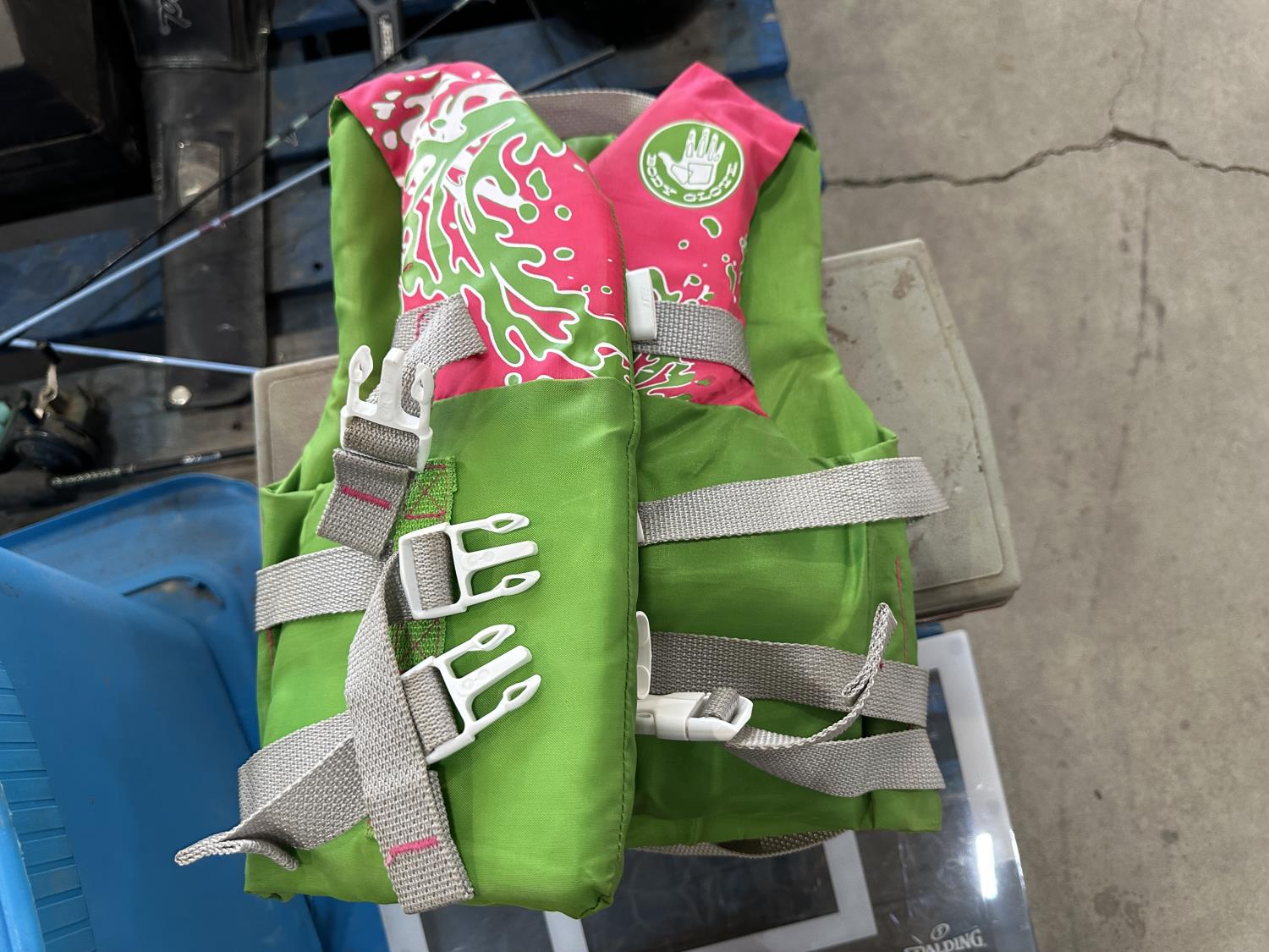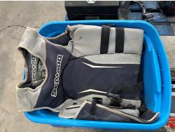 (4) life jackets, mini basketball net, tackle box with contents, Bear youth compound bow, Camp Chef grill