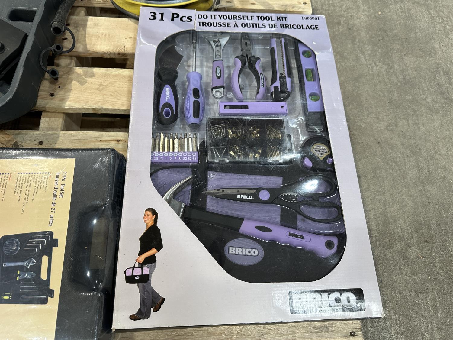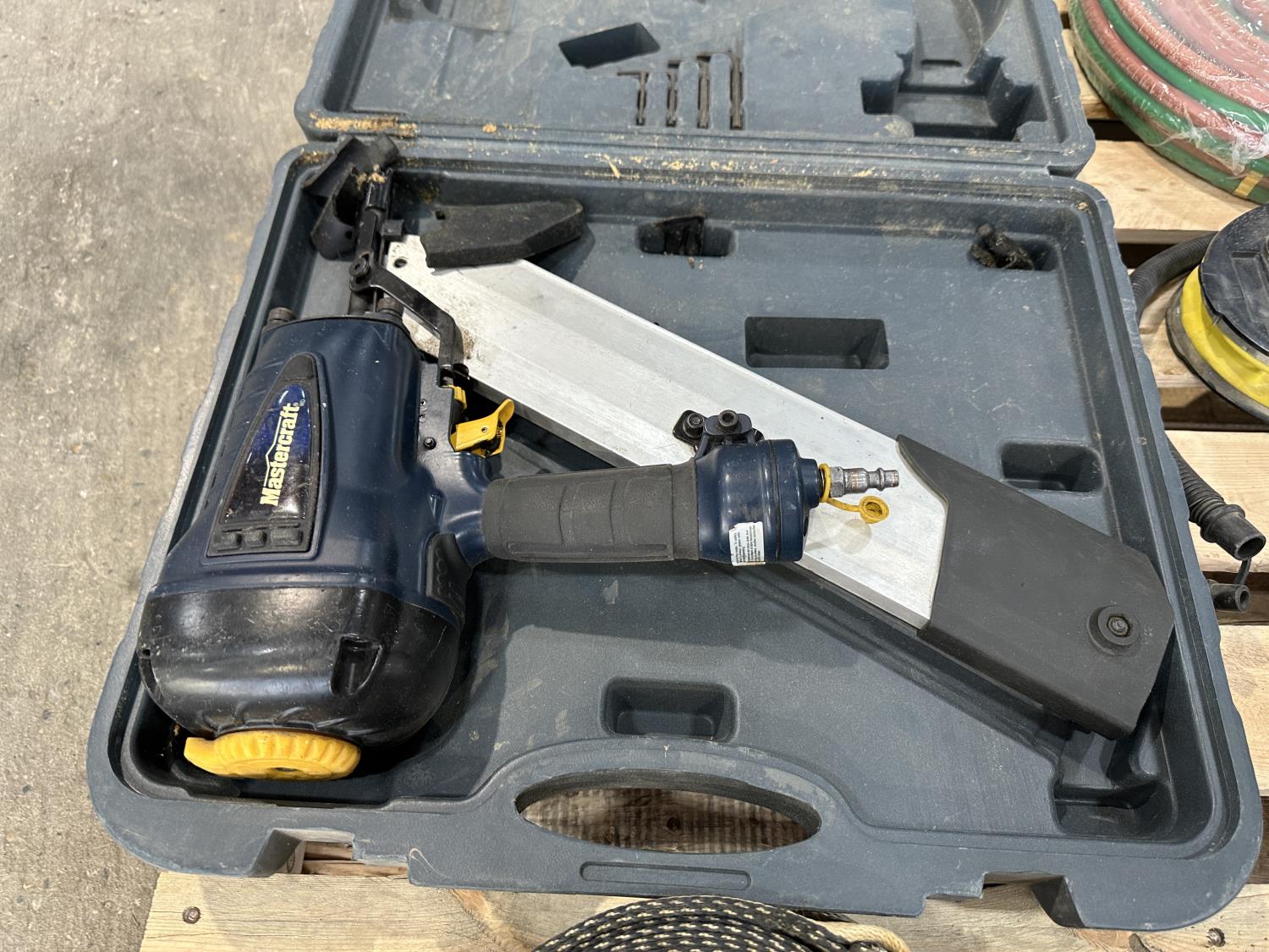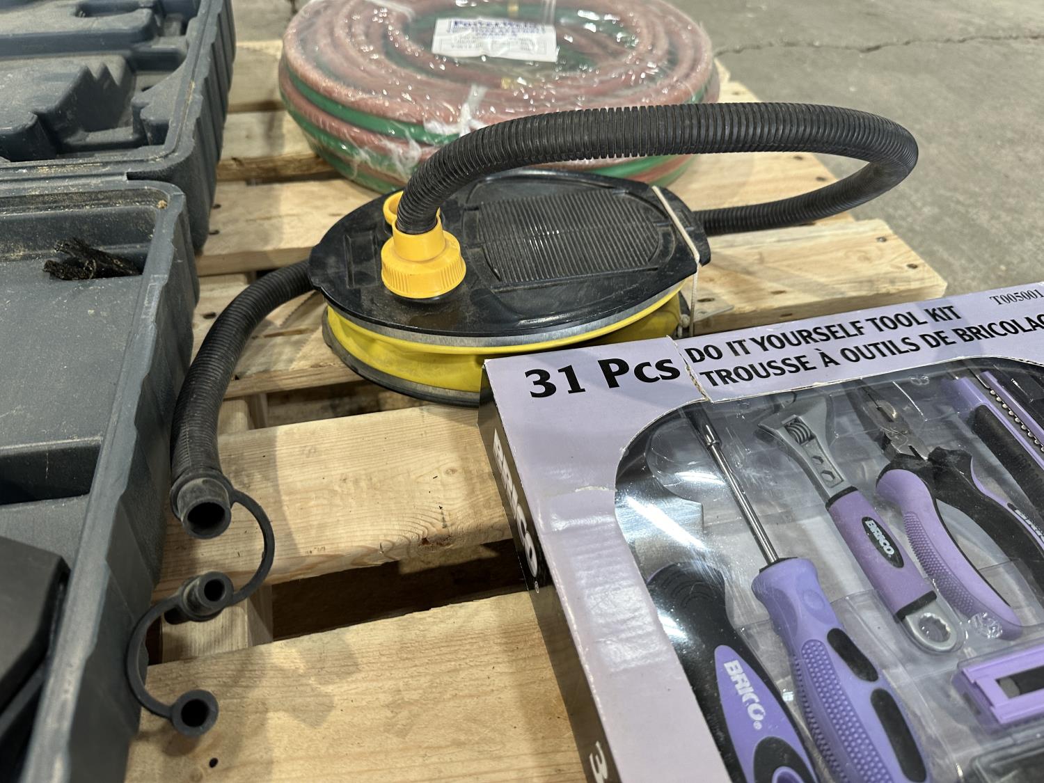 (3) 4 inch winch straps, 27 piece tool set (unused), 31 piece tool kit (unused), Powerweld 1/4 inch x 50 ft twin acetylene hose, Mastercraft nailer,