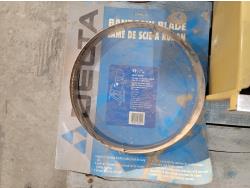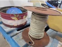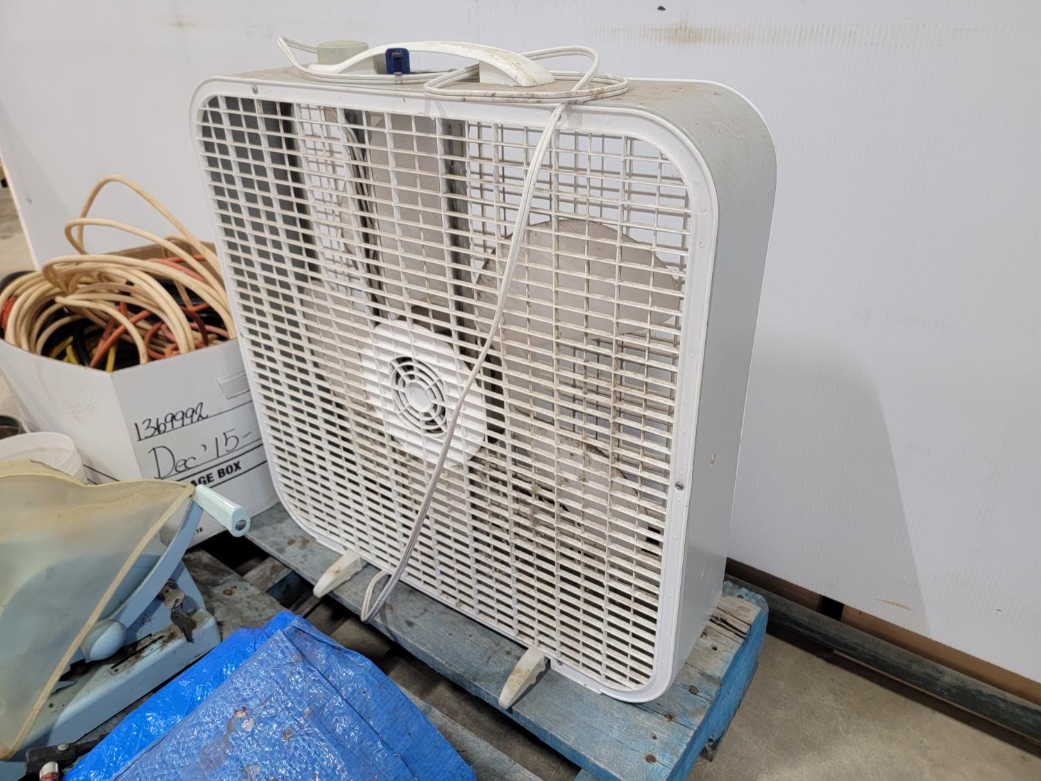 box fan, electrical cords, tarps, partial roll of electrical wire, bandsaw blade